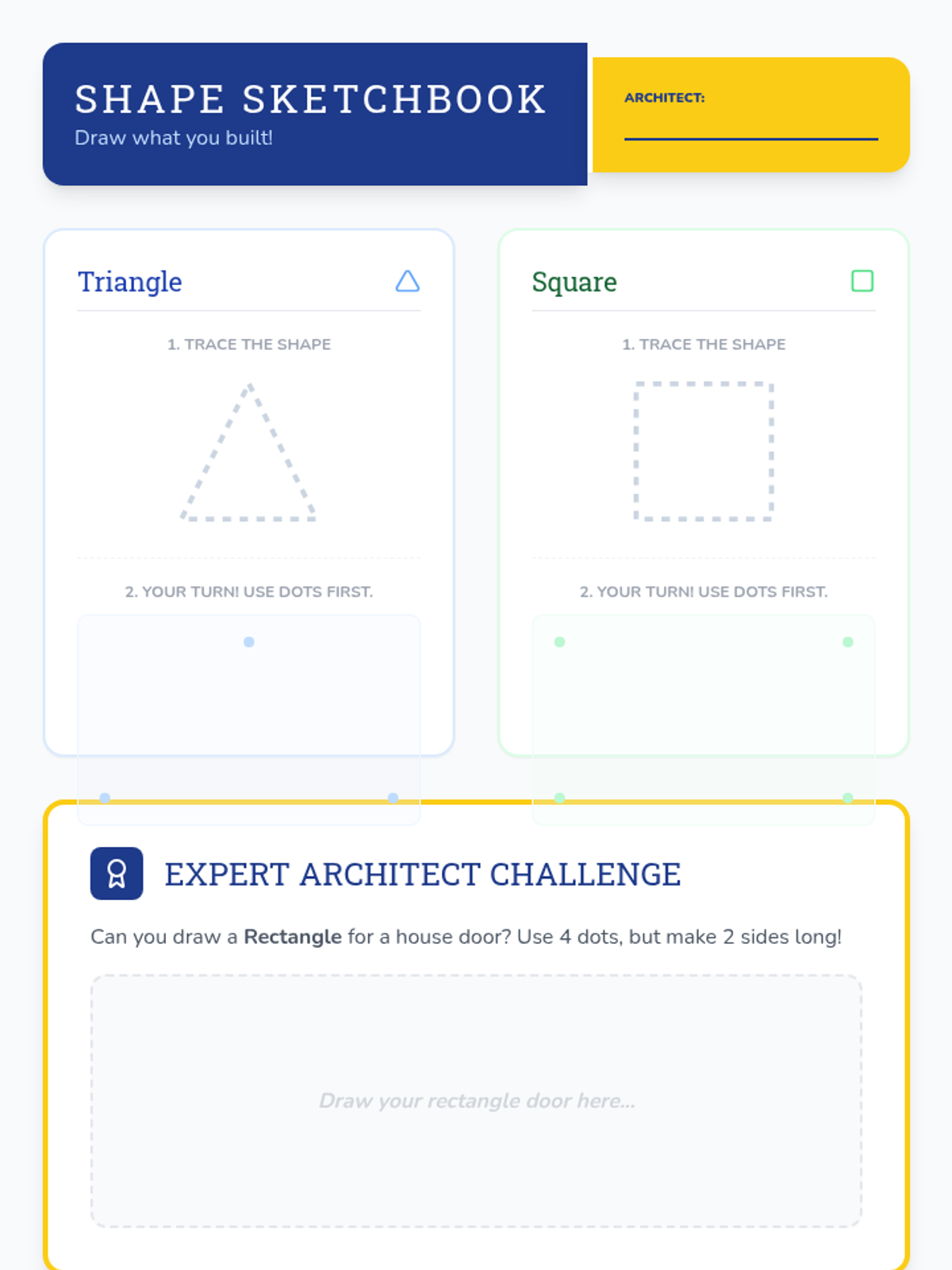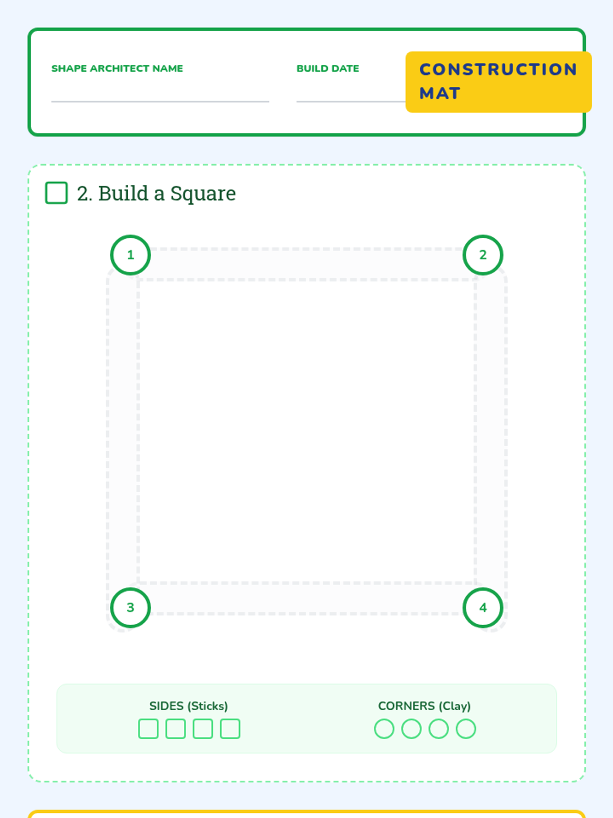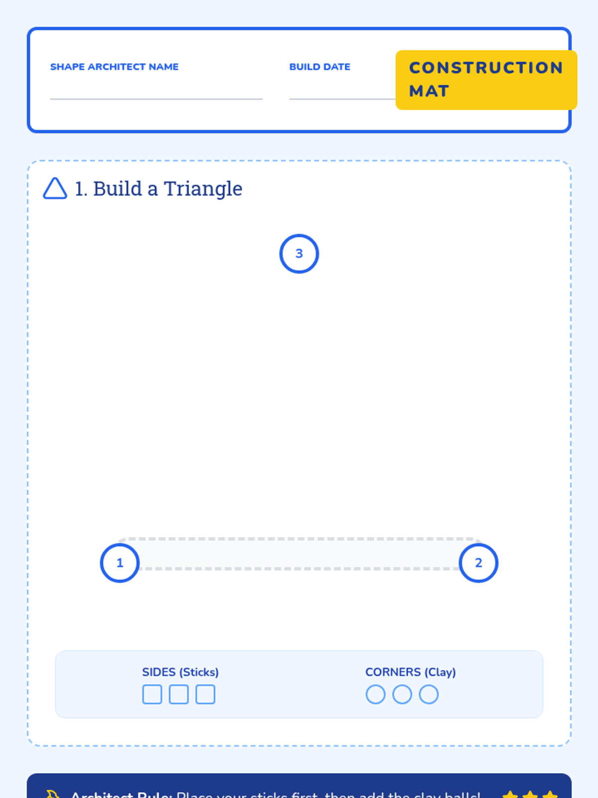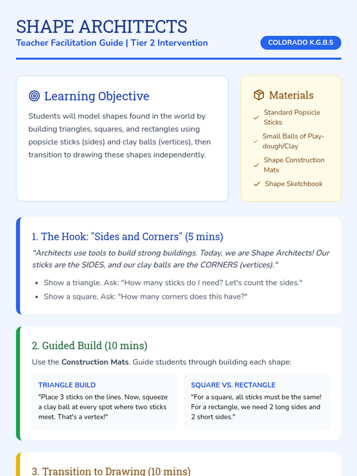 A targeted Tier 2 intervention lesson focusing on building and drawing 2D shapes using popsicle sticks and clay balls to reinforce side and vertex concepts.