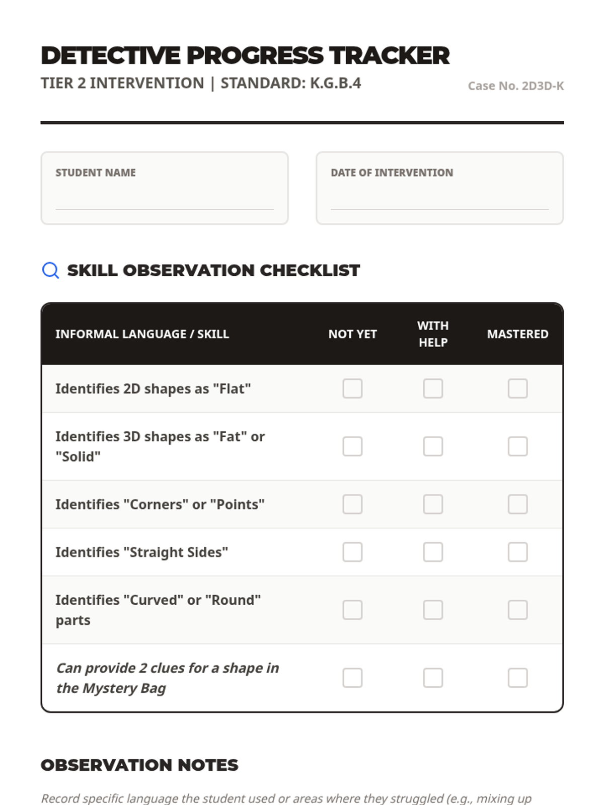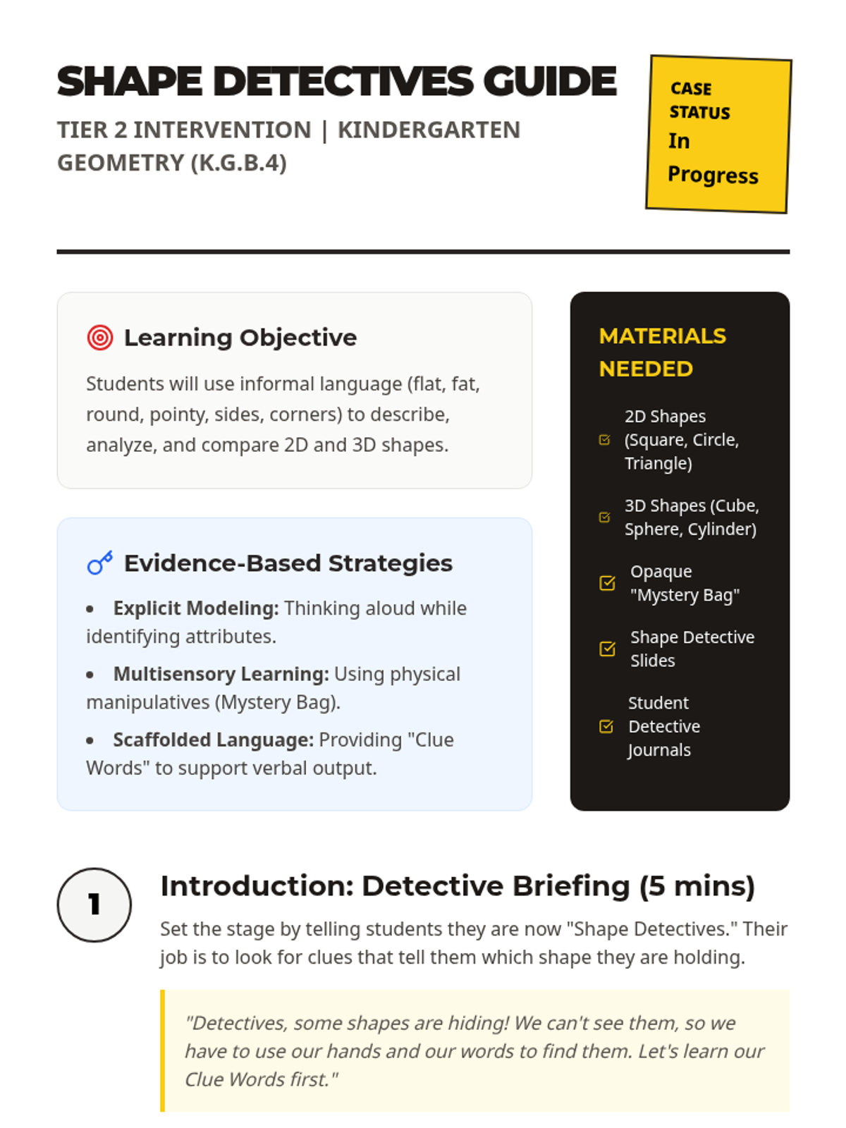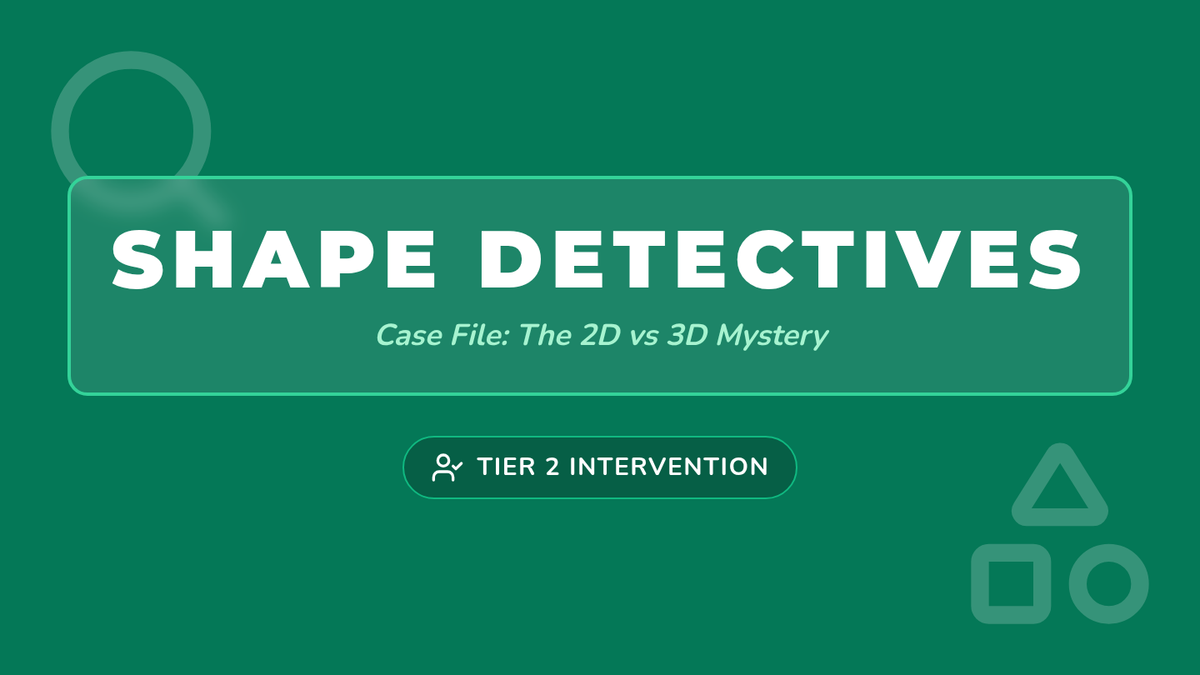 A Tier 2 intervention lesson for Kindergarten students to analyze and compare 2D and 3D shapes using informal language. Students act as 'Shape Detectives' to solve mysteries by identifying shapes based on their attributes (sides, corners, flat vs. solid).