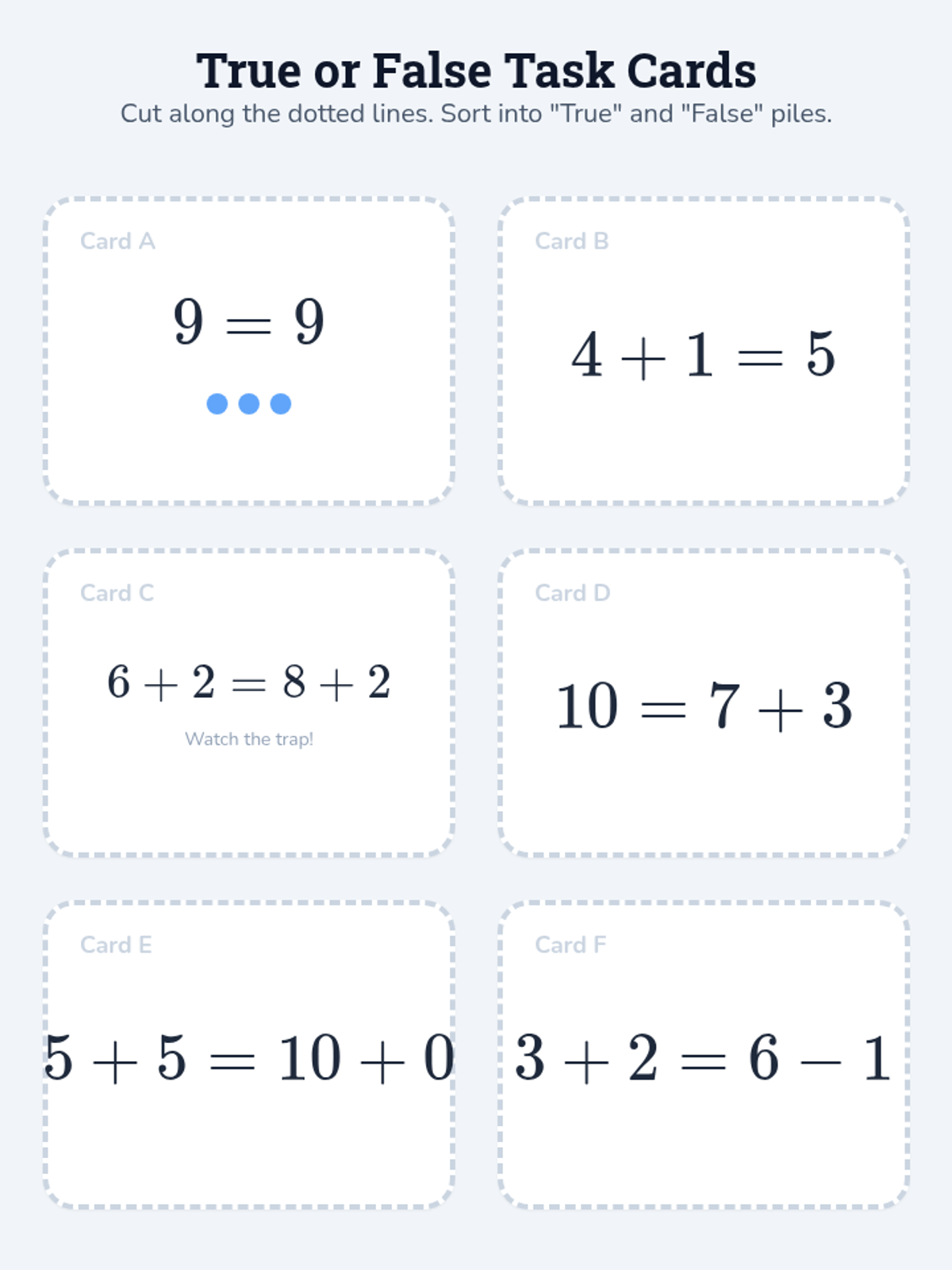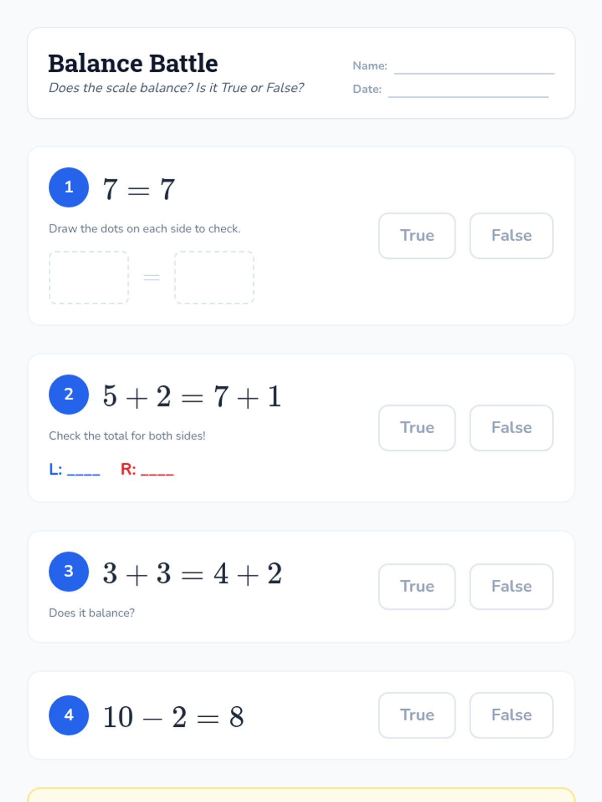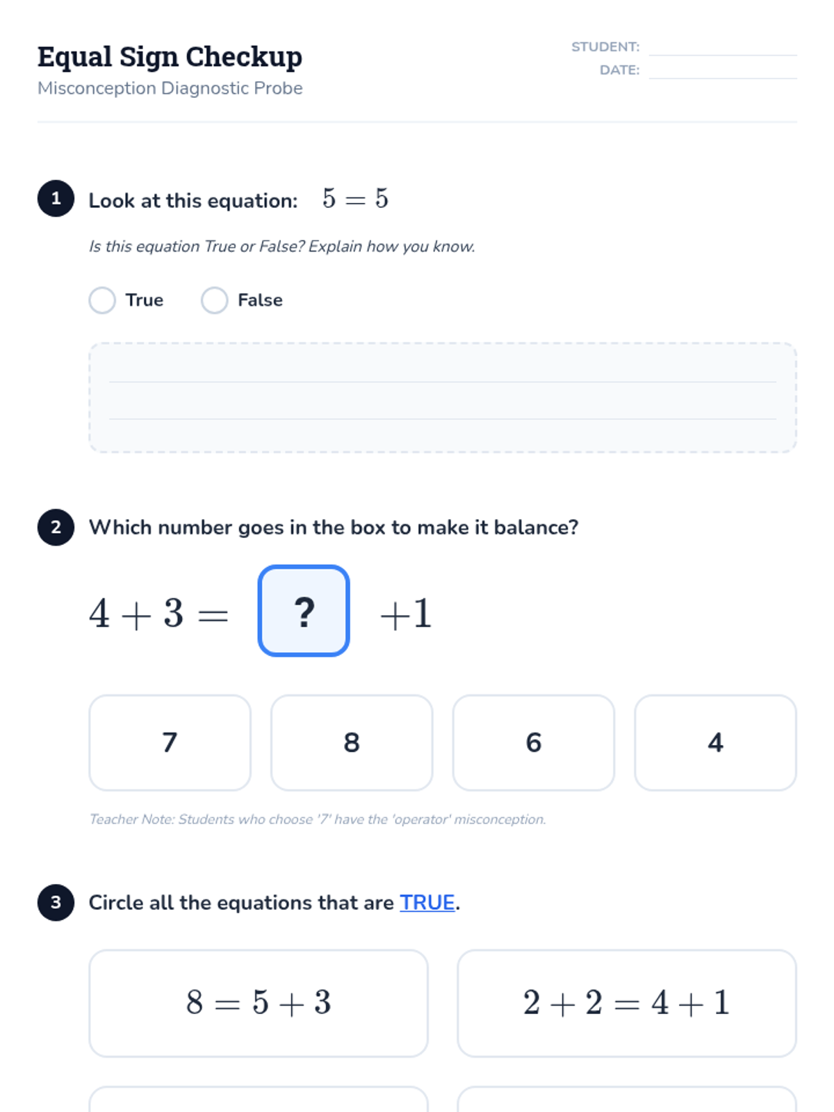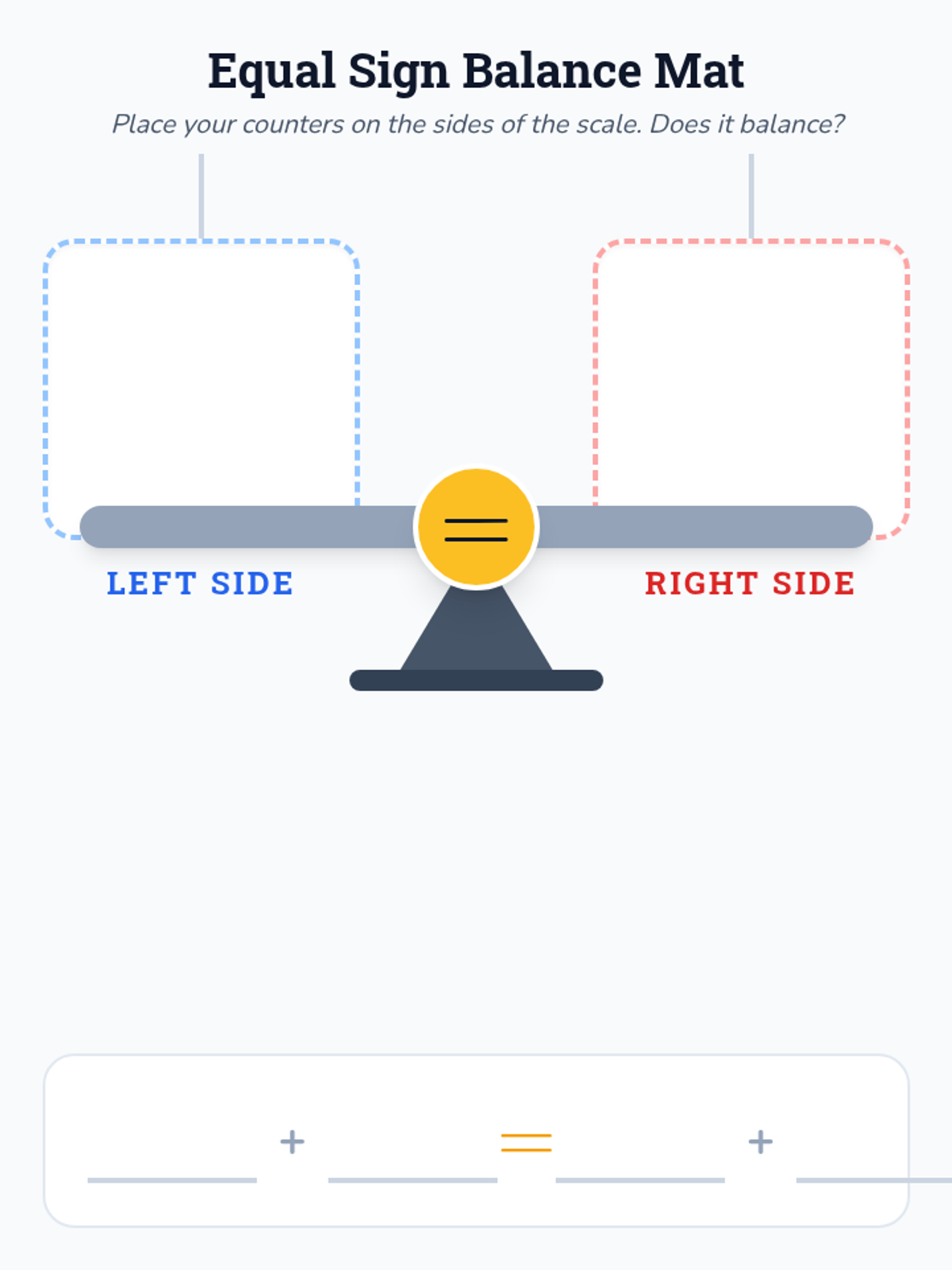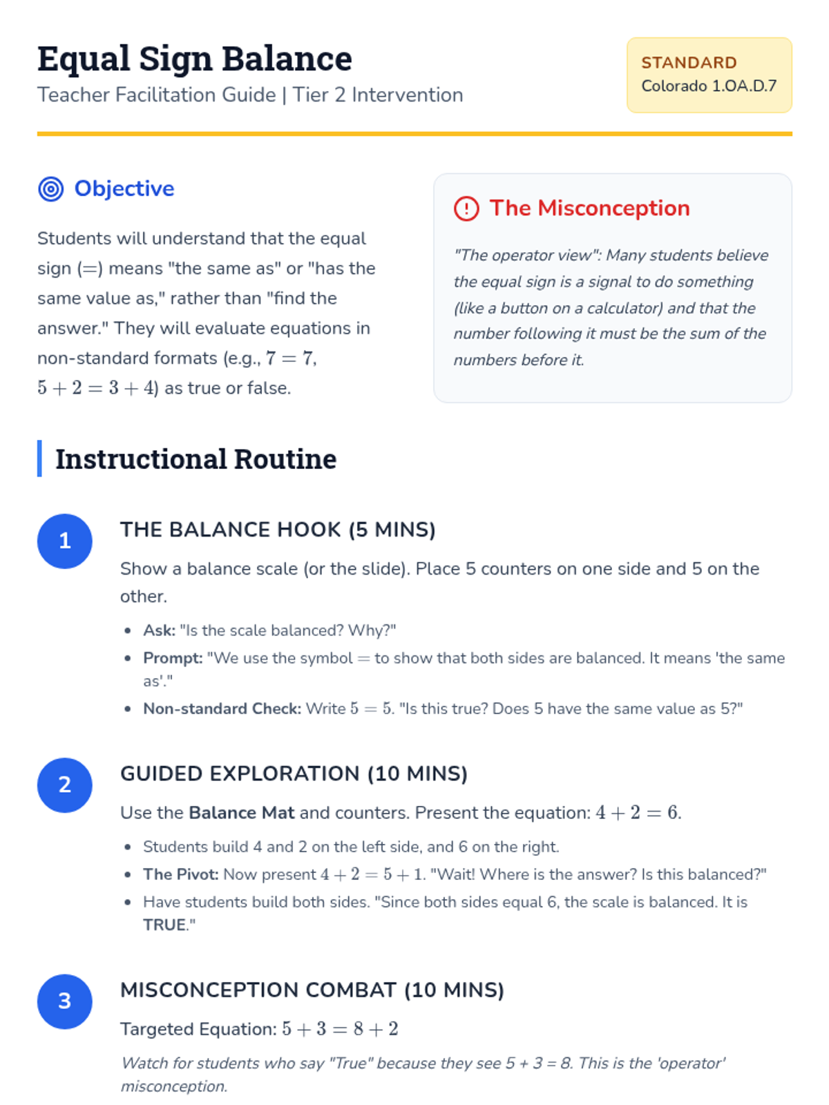A Tier 2 intervention lesson focusing on the relational meaning of the equal sign. This lesson targets the common 'operator' misconception and uses balance scales and non-standard equation formats to build conceptual understanding.