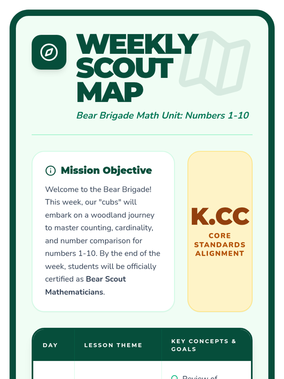 The introductory lesson of the Bear Brigade Math sequence, focusing on mastering counting and one-to-one correspondence for numbers 1-5 using counting bears and nature-themed visuals.