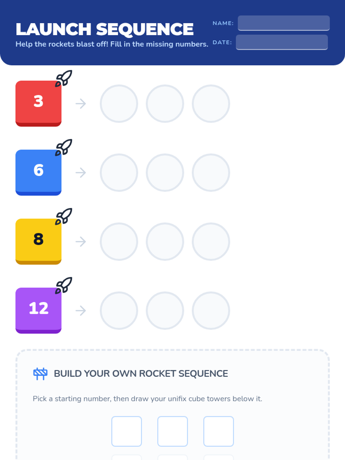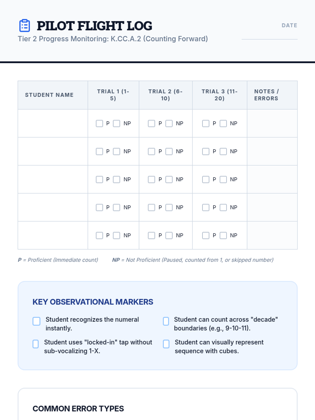 A targeted Tier 2 intervention lesson focusing on counting forward from any number within the sequence. Students engage in a 'Blast Off' theme using unifix cubes and scaffolded tasks to master Colorado standard K.CC.A.2.
