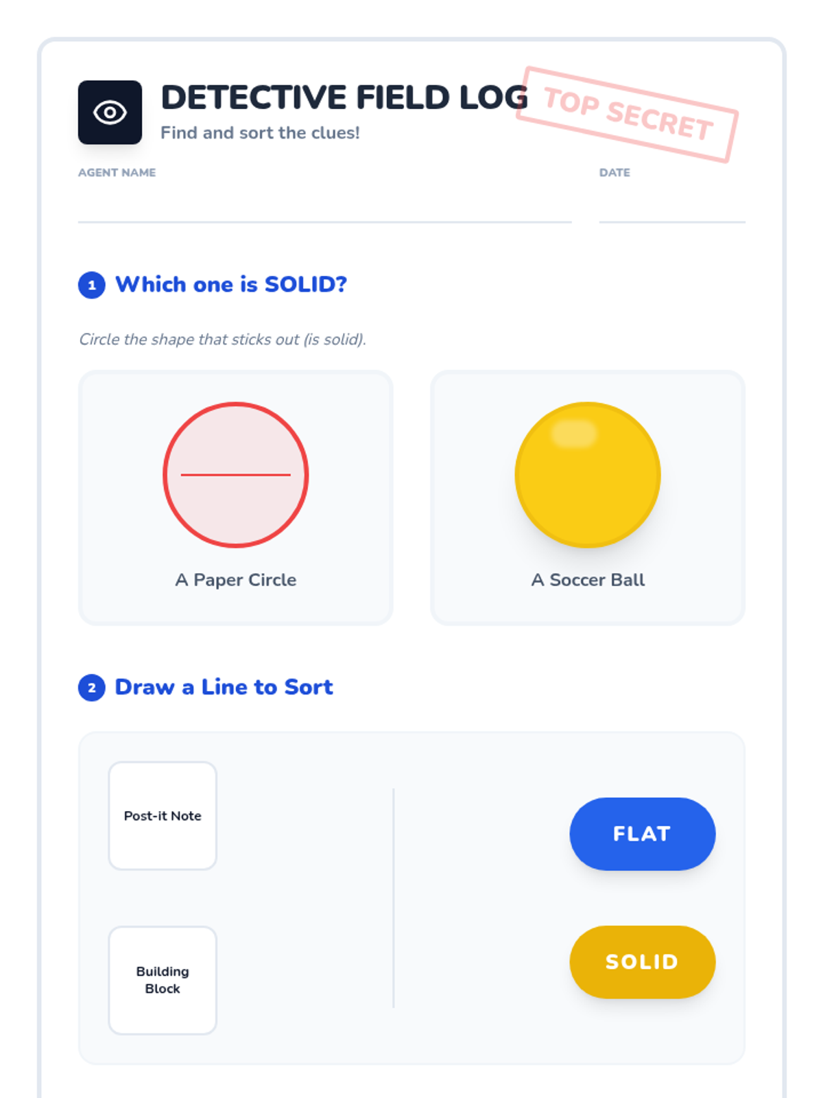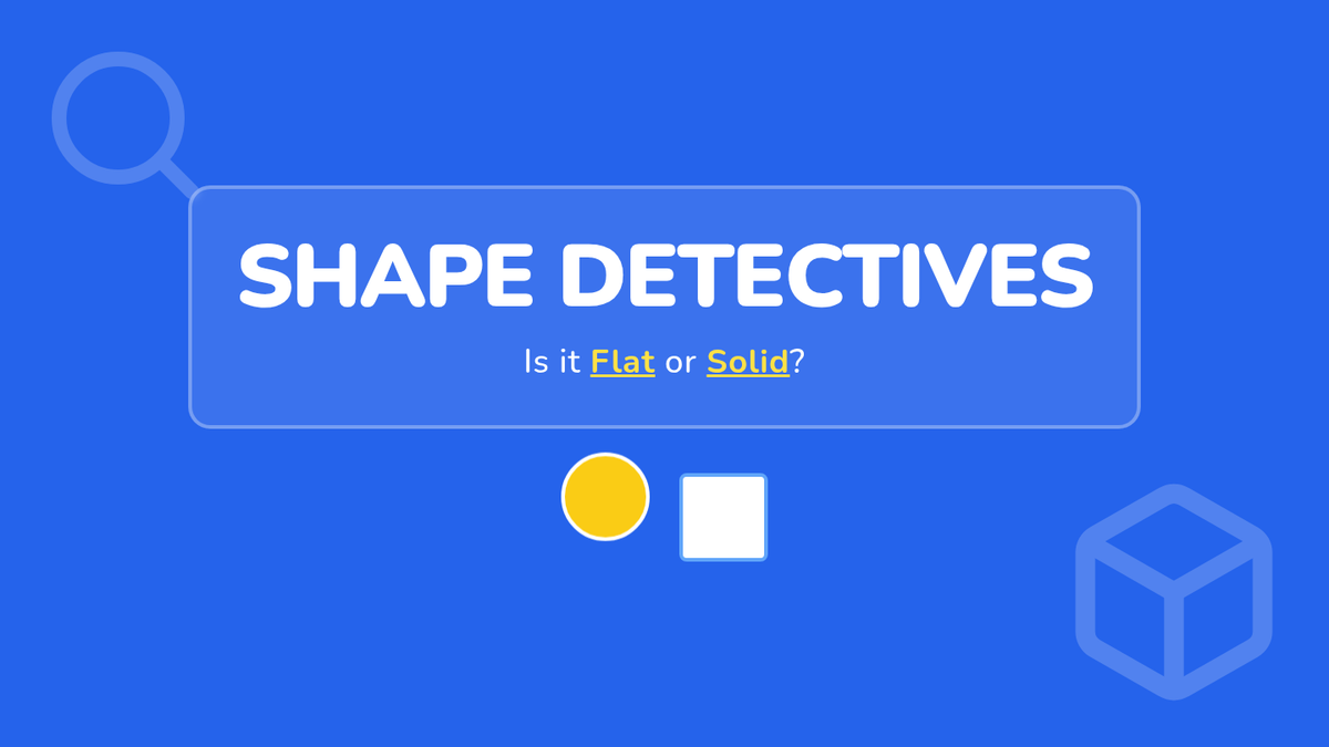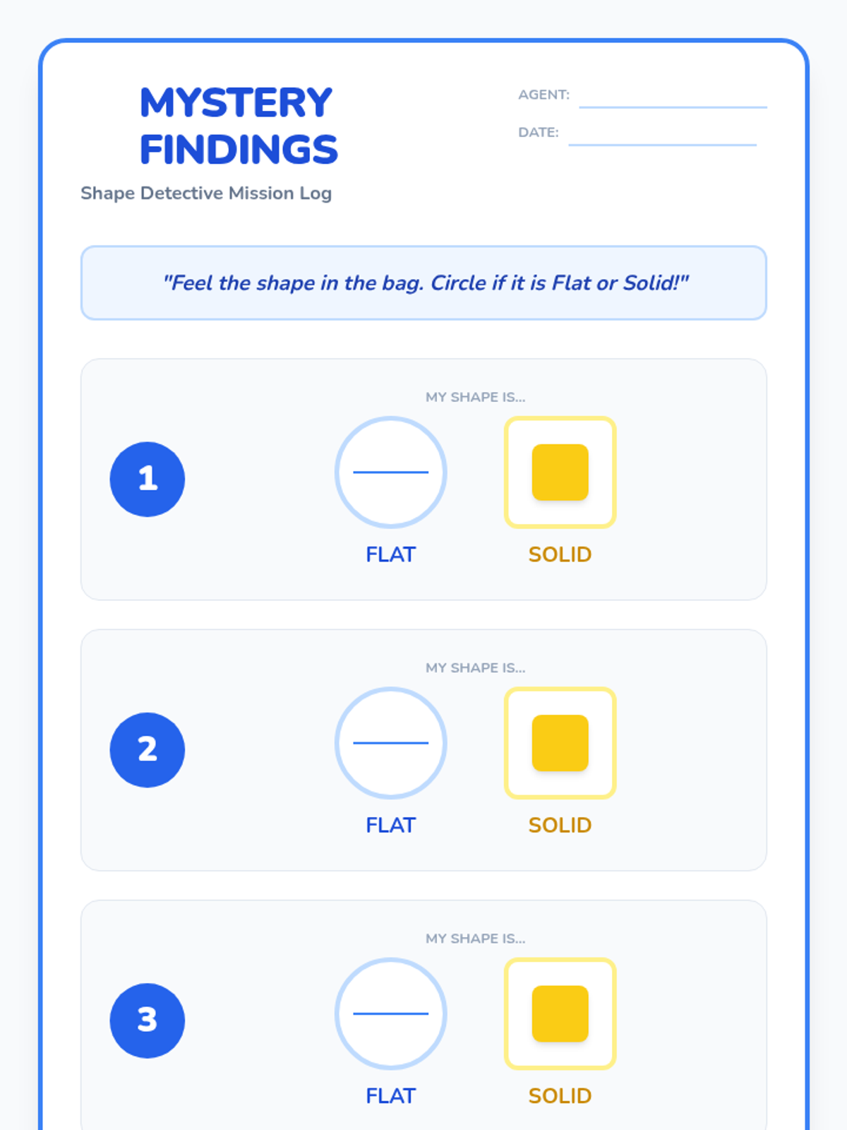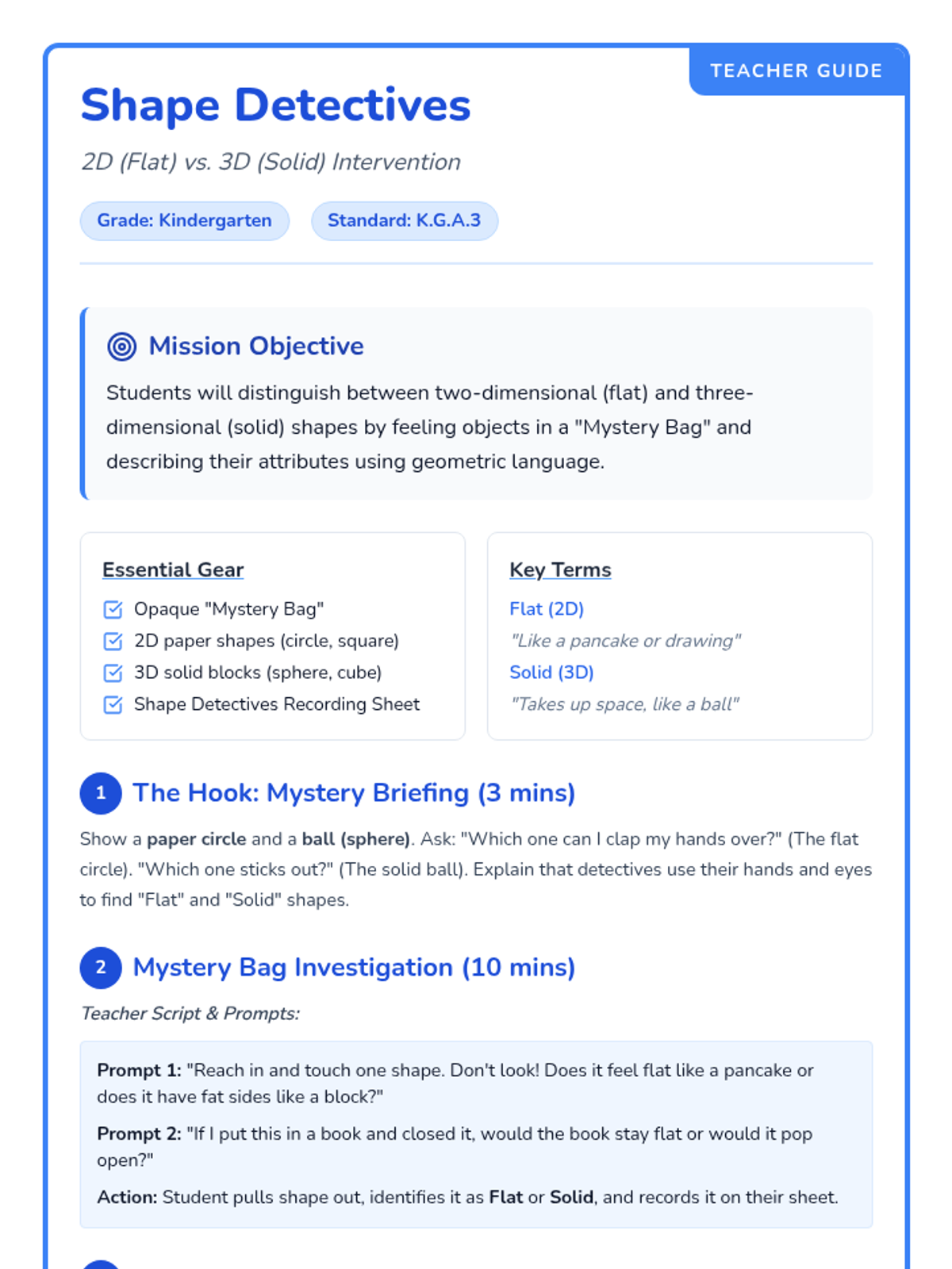 A Tier 2 intervention lesson focusing on the distinction between two-dimensional (flat) and three-dimensional (solid) shapes through tactile exploration and guided practice. Students act as 'Shape Detectives' to solve a mystery bag challenge.