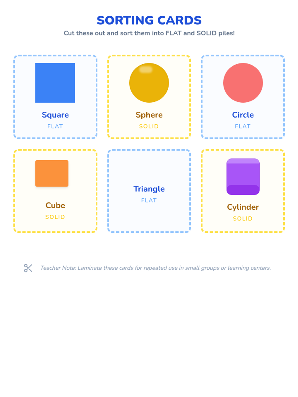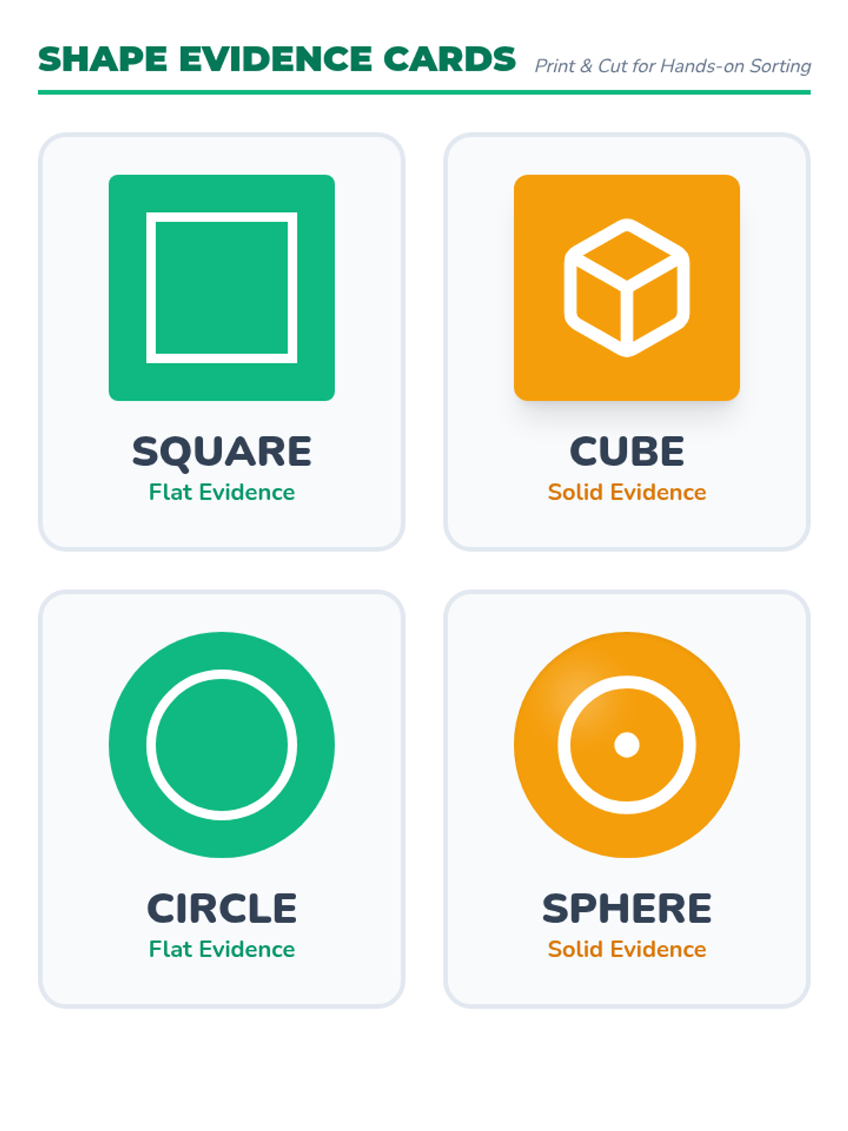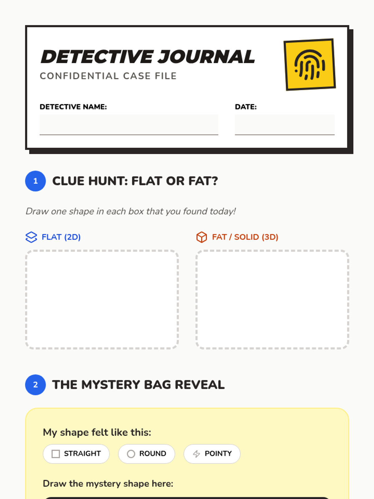 A Tier 2 intervention lesson focusing on the distinction between two-dimensional (flat) and three-dimensional (solid) shapes through tactile exploration and guided practice. Students act as 'Shape Detectives' to solve a mystery bag challenge.