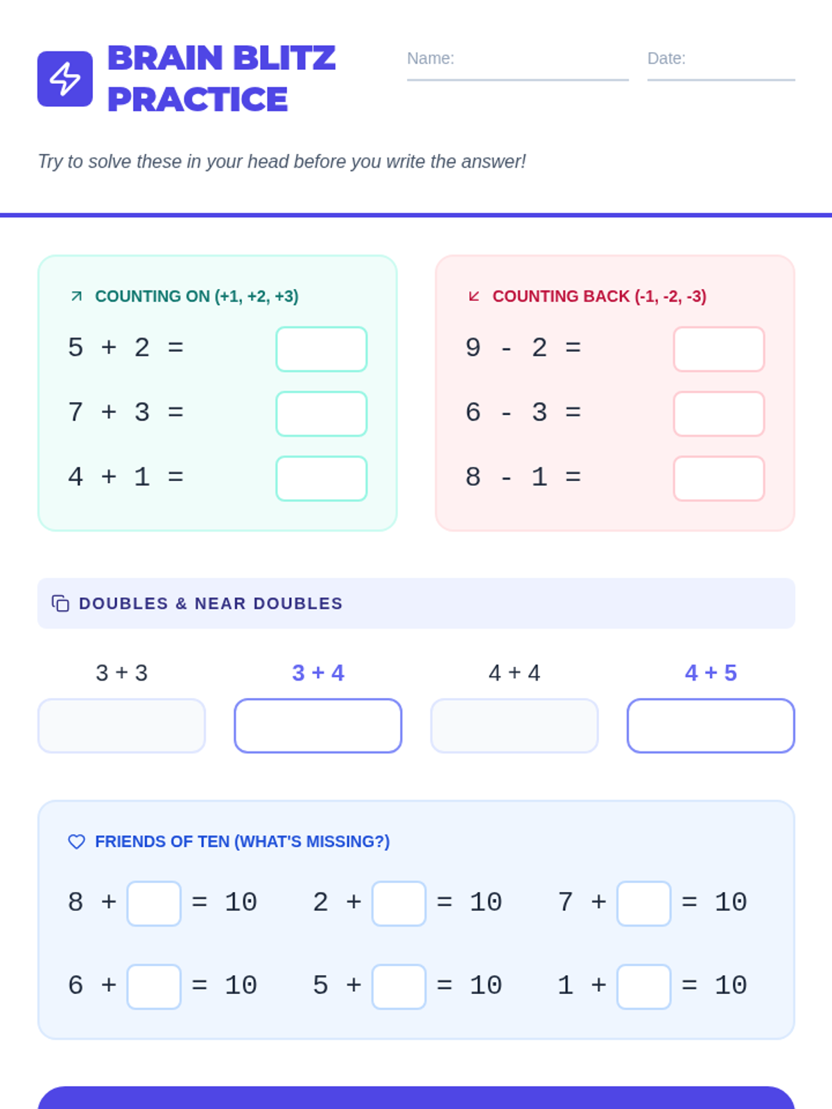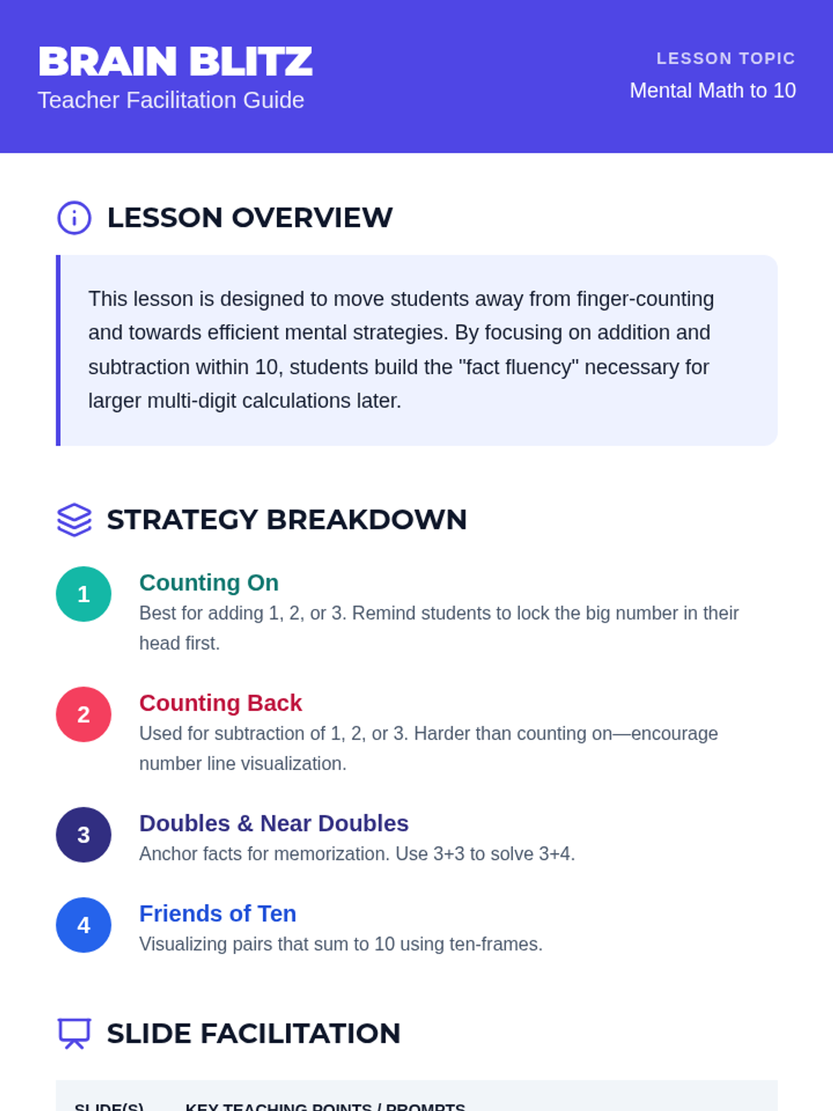 A high-energy introduction to mental math strategies for addition and subtraction within ten. Students will learn to use counting on, counting back, doubles, and making ten to solve problems quickly in their heads.