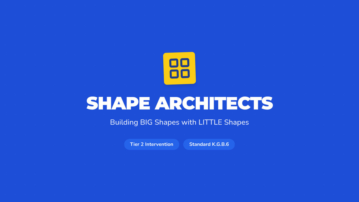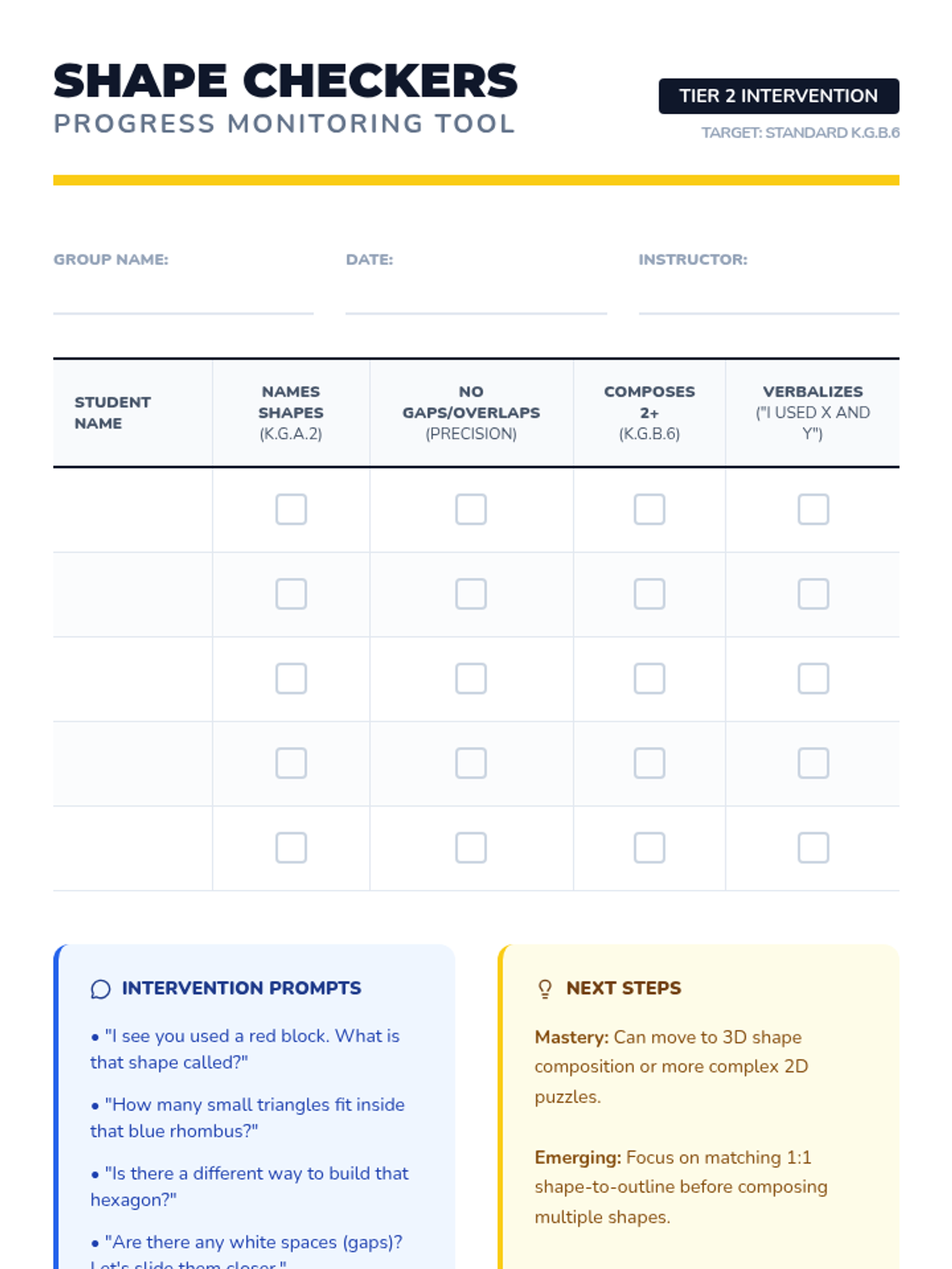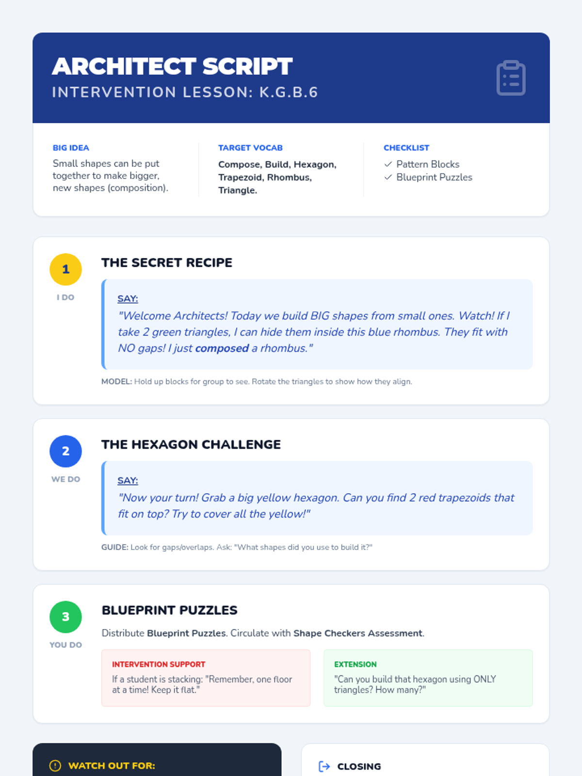 A targeted Tier 2 intervention lesson focusing on K.G.B.6, where students use pattern blocks to compose larger shapes through scaffolded construction activities.