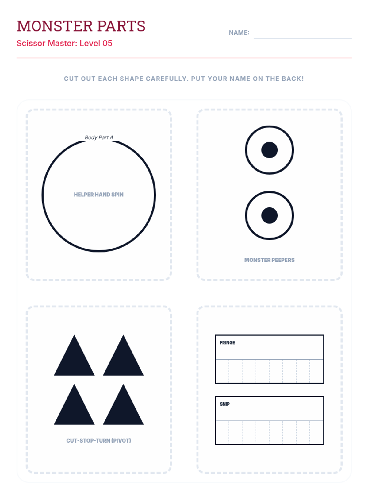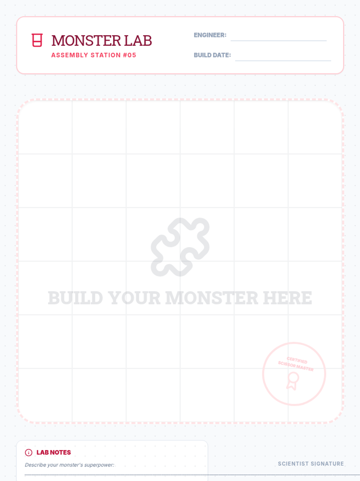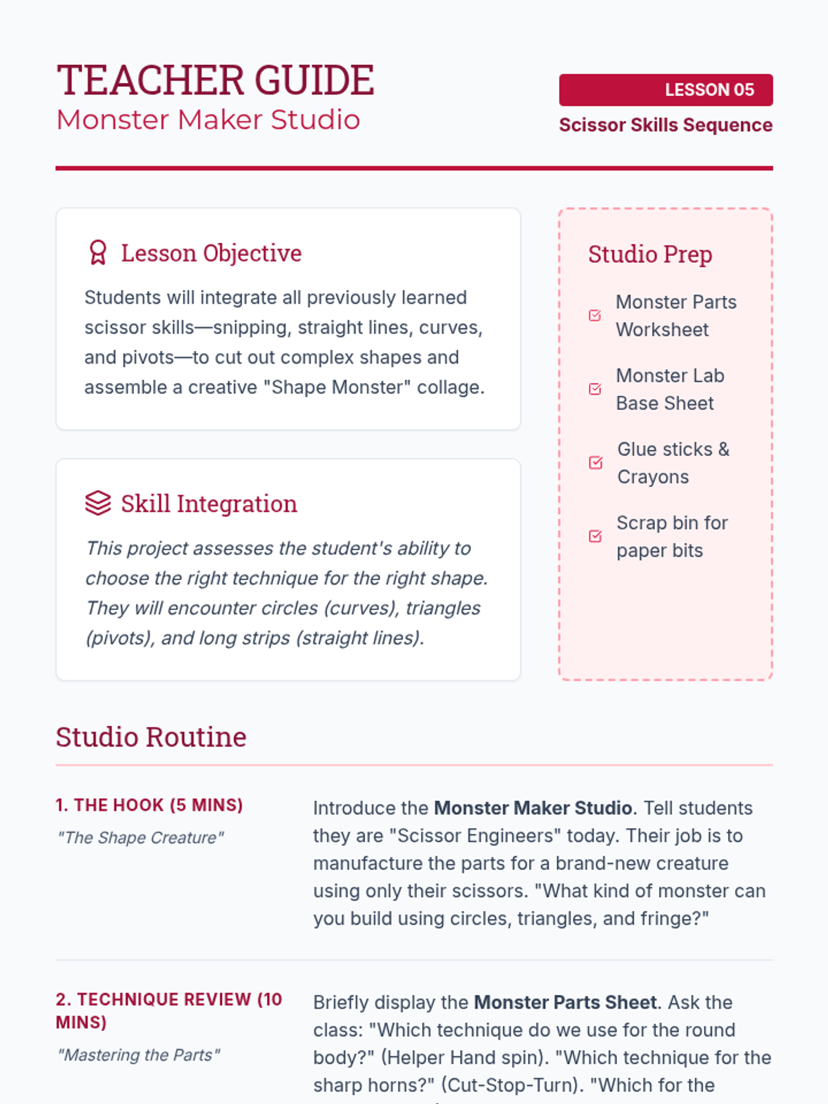 Students integrate all cutting techniques to create a 'Shape Monster' or habitat, focusing on precise cutting and assembly.