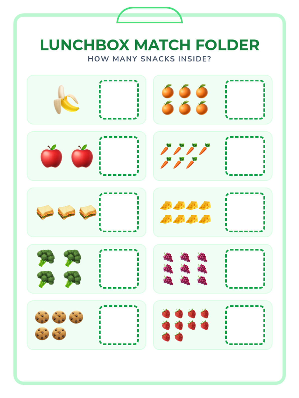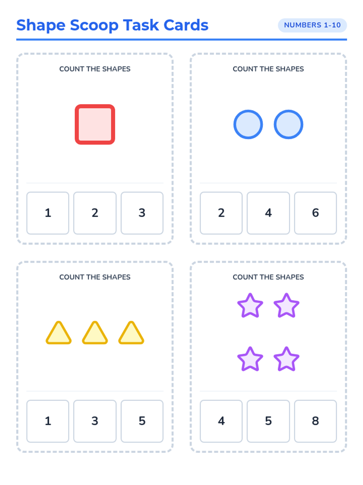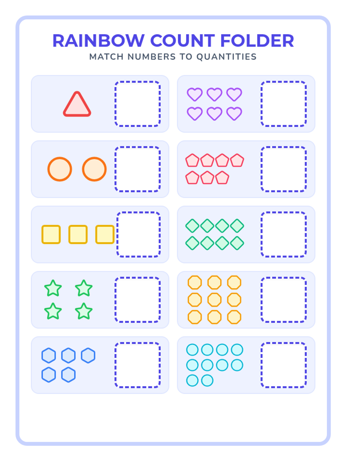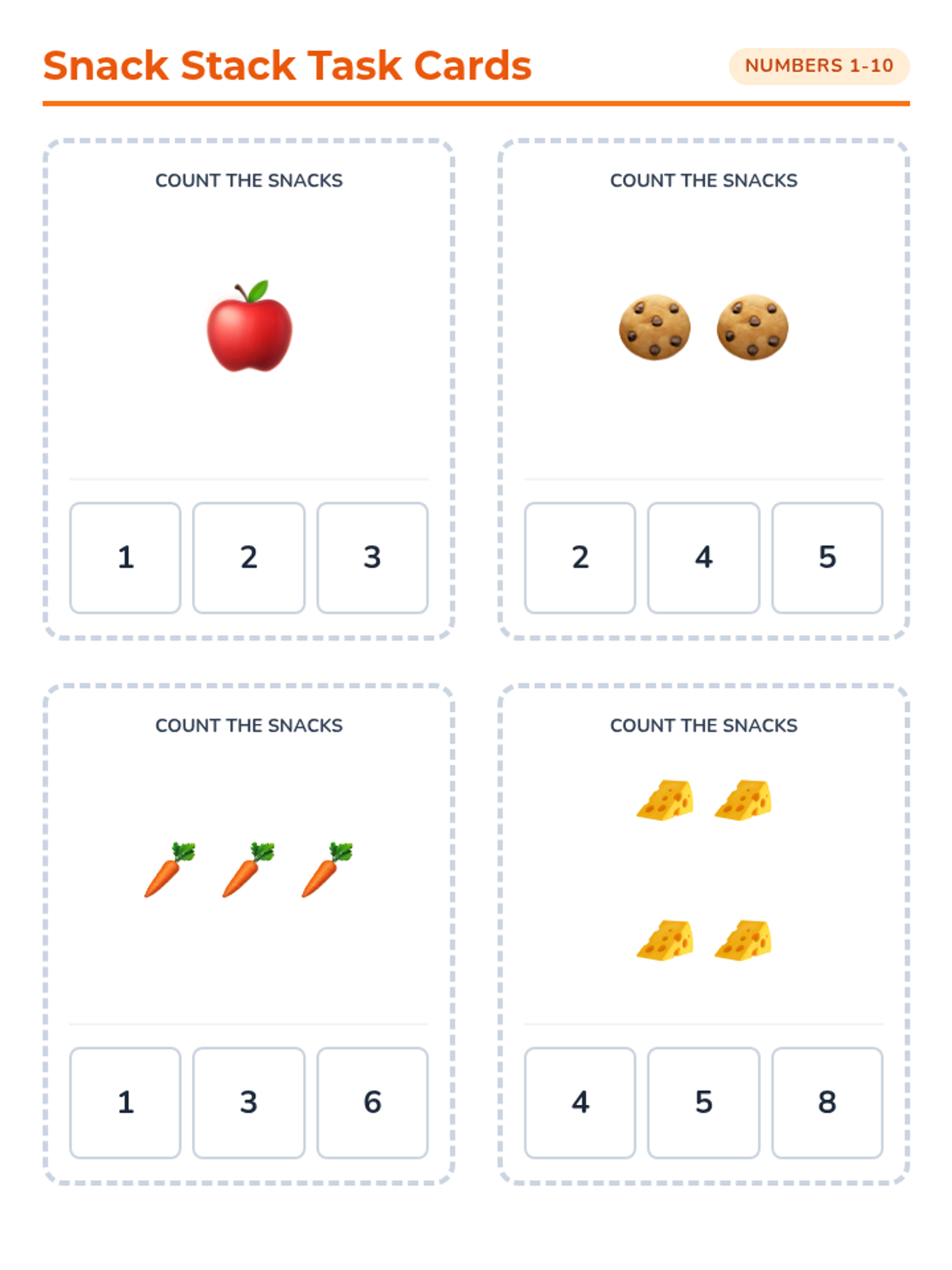A collection of hands-on math center materials designed to build 1:1 correspondence and numeral-to-quantity matching for numbers 1-10, featuring vibrant colors, geometric shapes, and tasty snacks.
