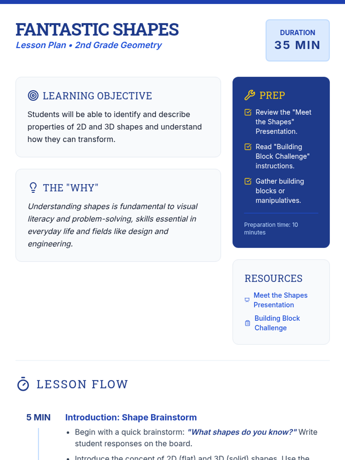 A comprehensive introduction to 3D geometric shapes including cubes, spheres, rectangular prisms, cones, pyramids, and cylinders. Students will learn to identify these shapes, count their attributes (faces, edges, vertices), and find them in the real world.
