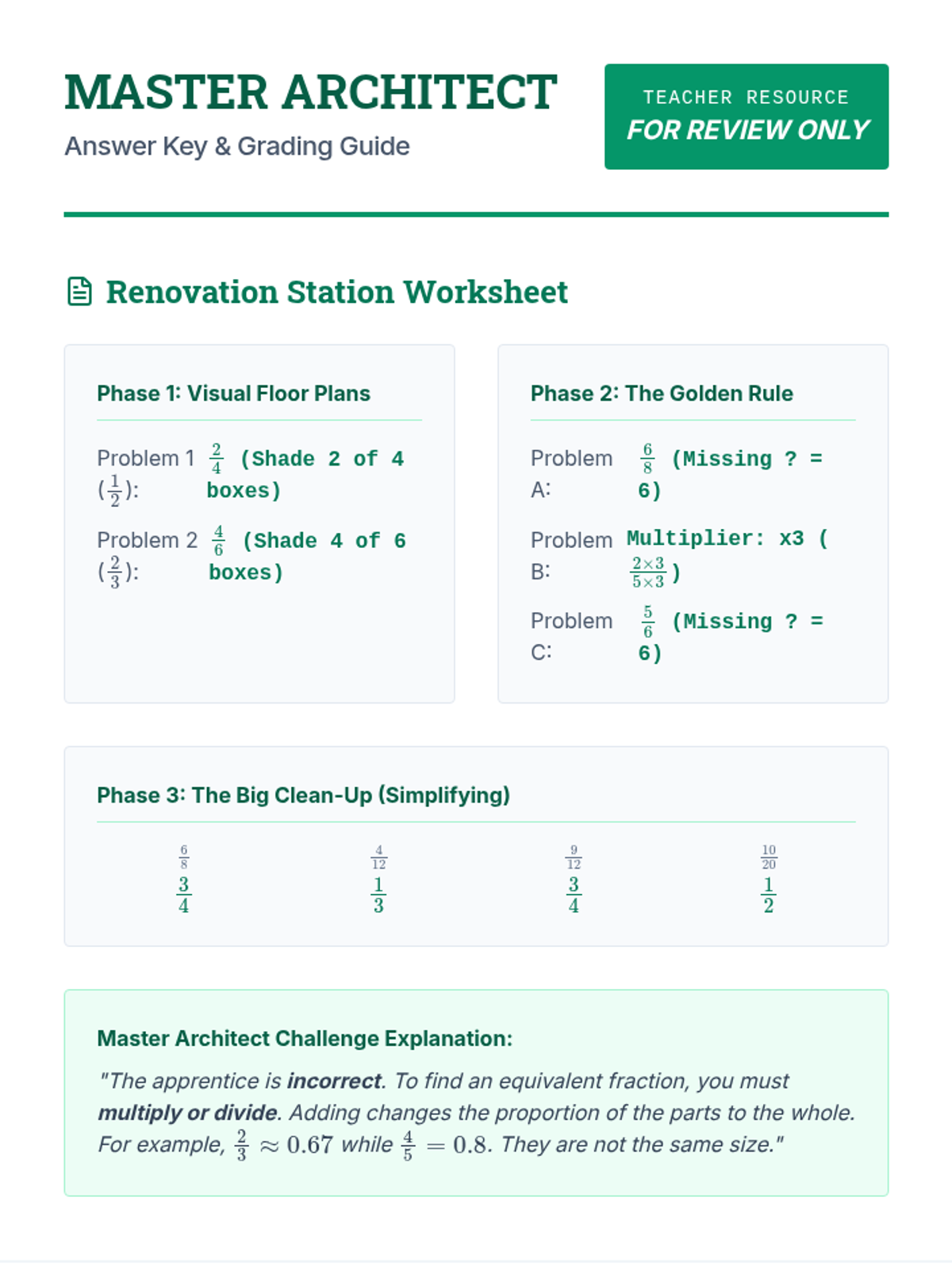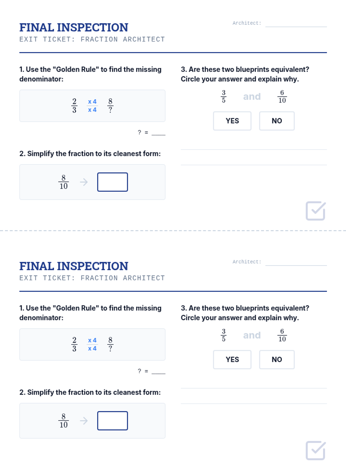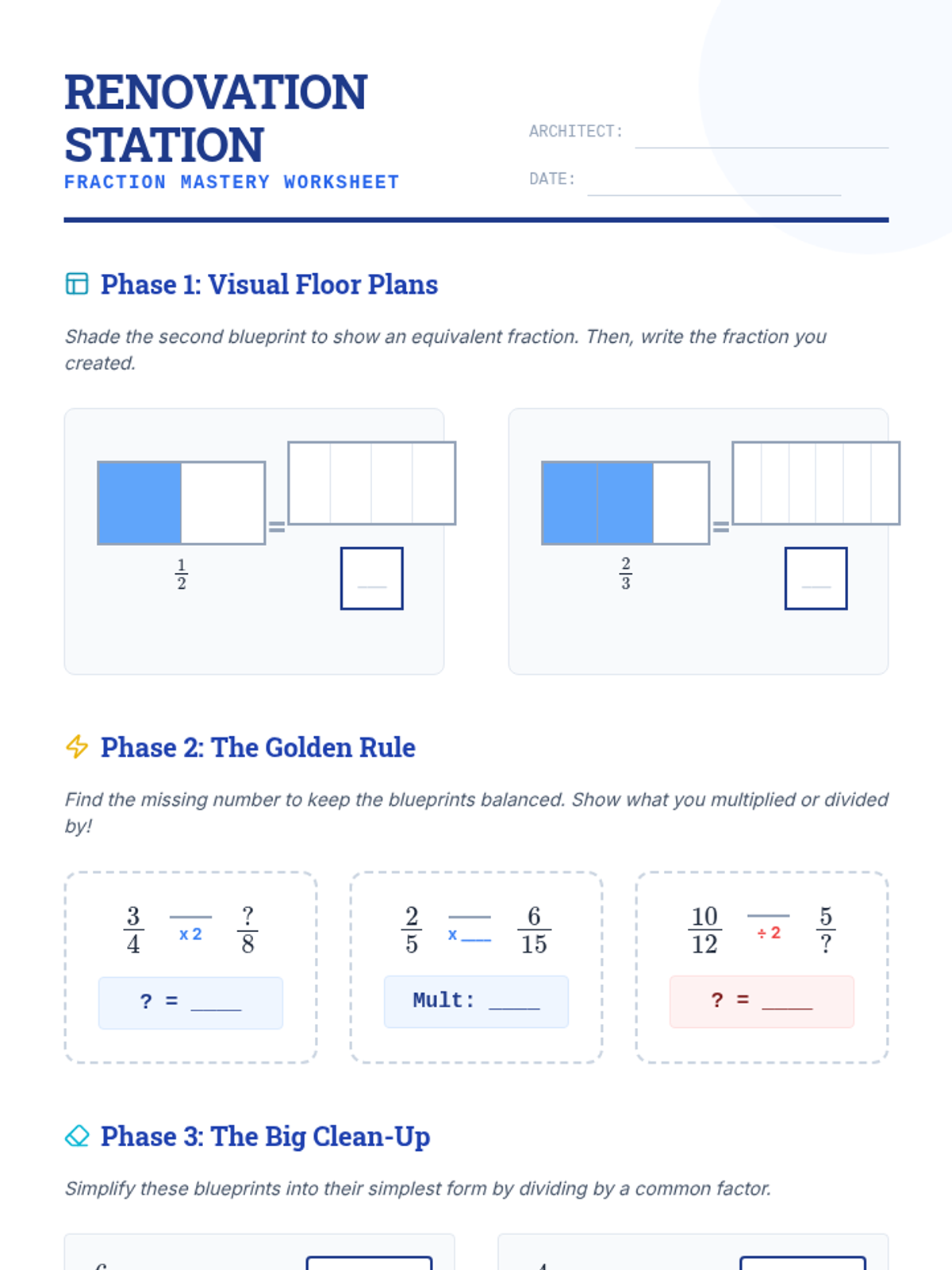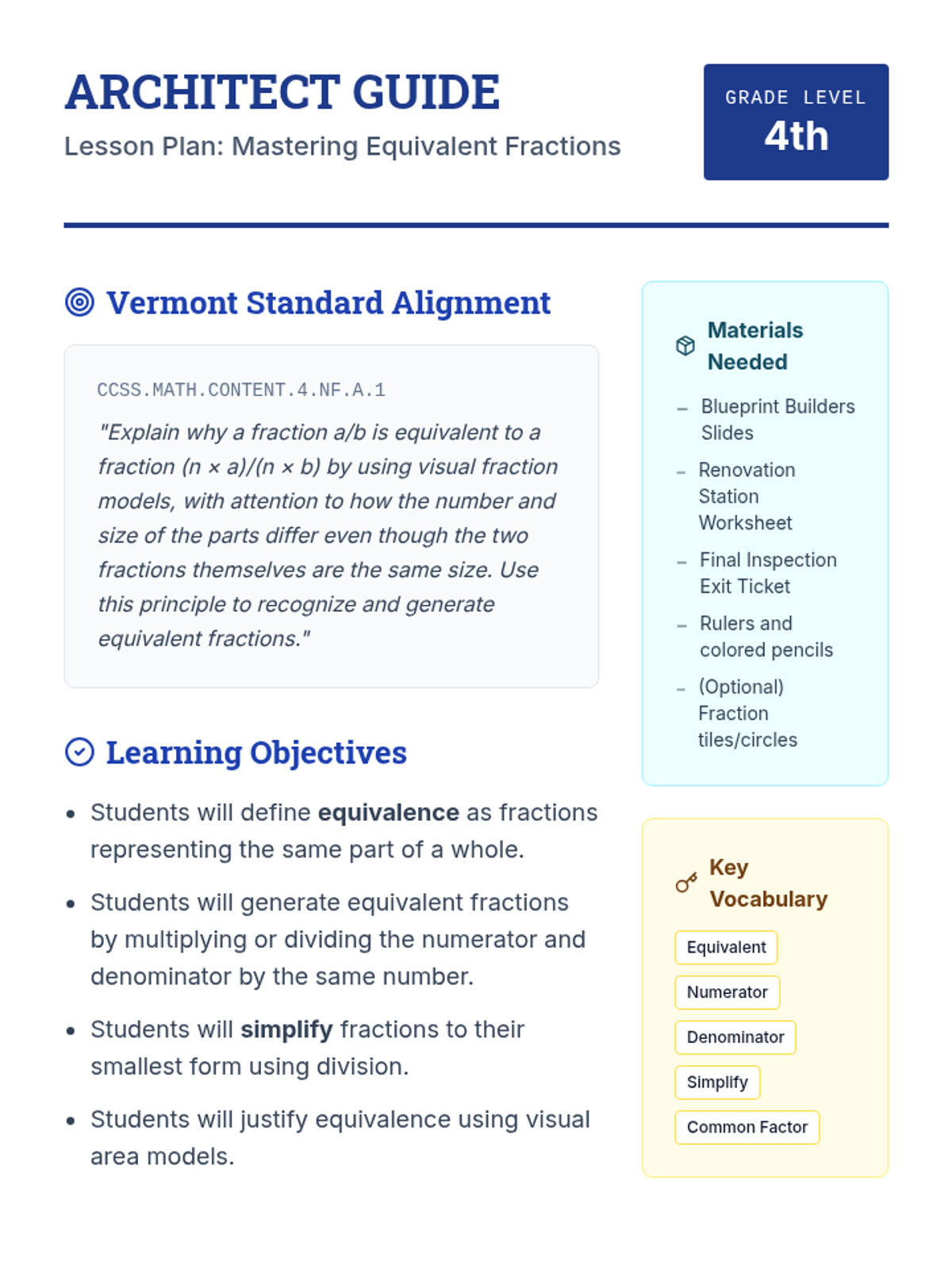 A comprehensive math lesson for 4th graders focused on mastering equivalent fractions and simplifying using an architectural 'Blueprint Builders' theme. Students will use visual models and mathematical operations to renovate 'fractional floor plans'.