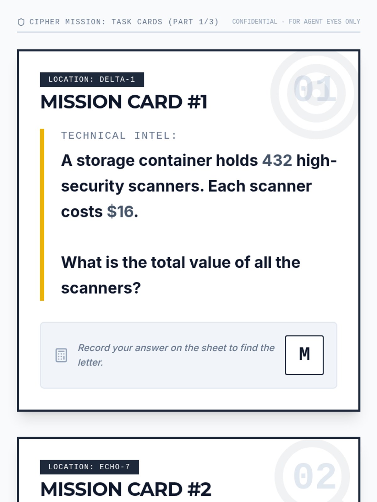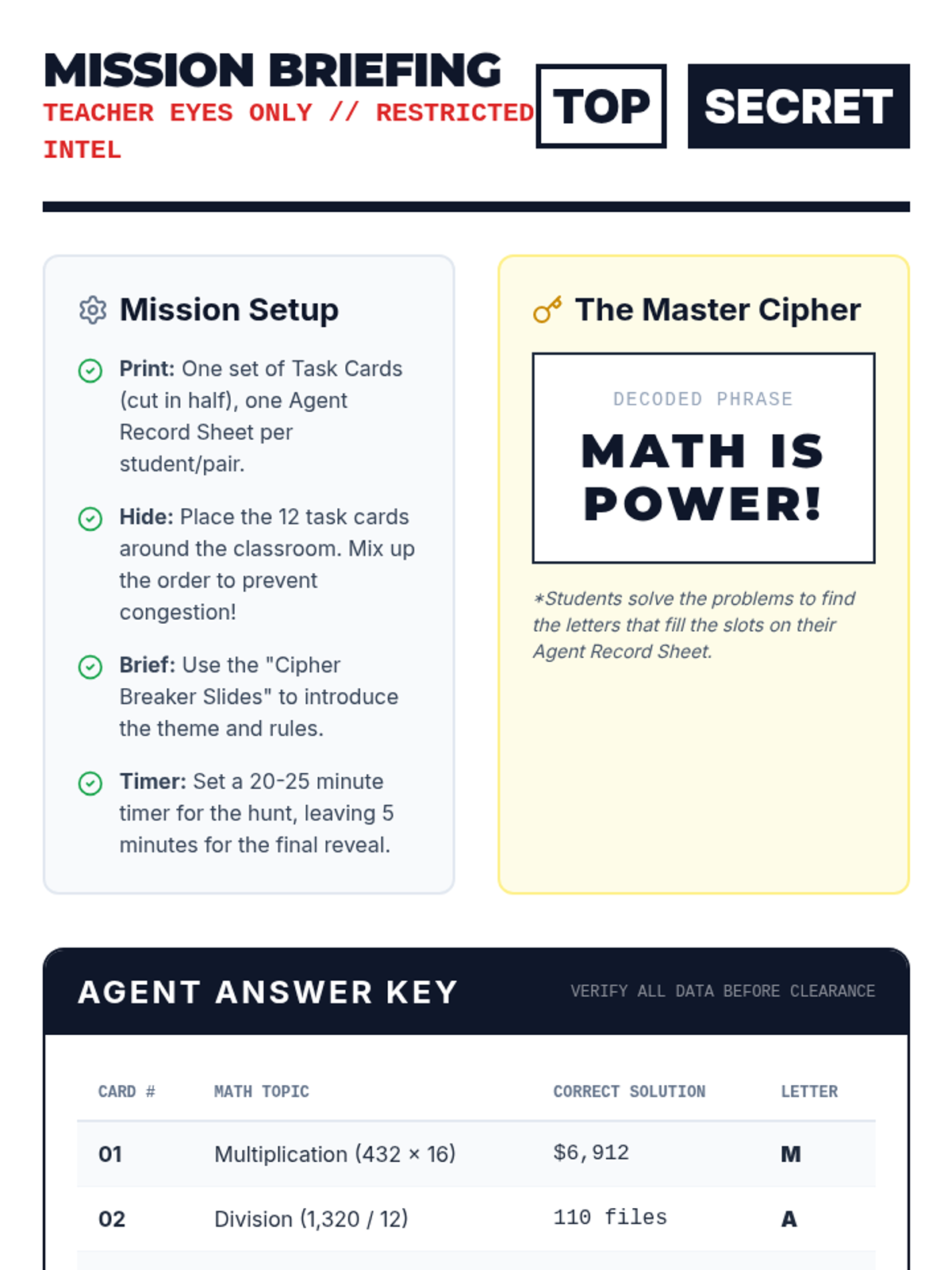 A high-stakes math mission where students solve complex 5th-grade problems to decode a secret message. This activity reinforces operations, place value, fractions, and decimals through an engaging spy-themed narrative.