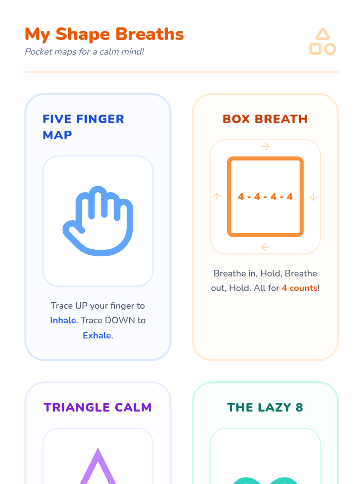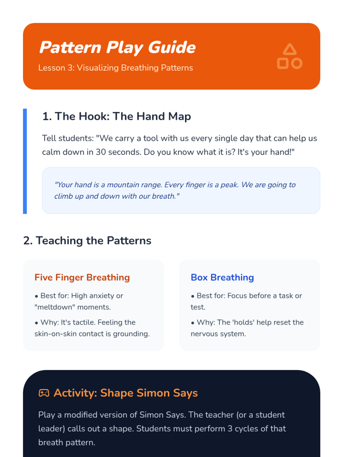 Introduction of visual and tactile breathing patterns like Five Finger Breathing and Shape Breathing to maintain rhythmic calm.