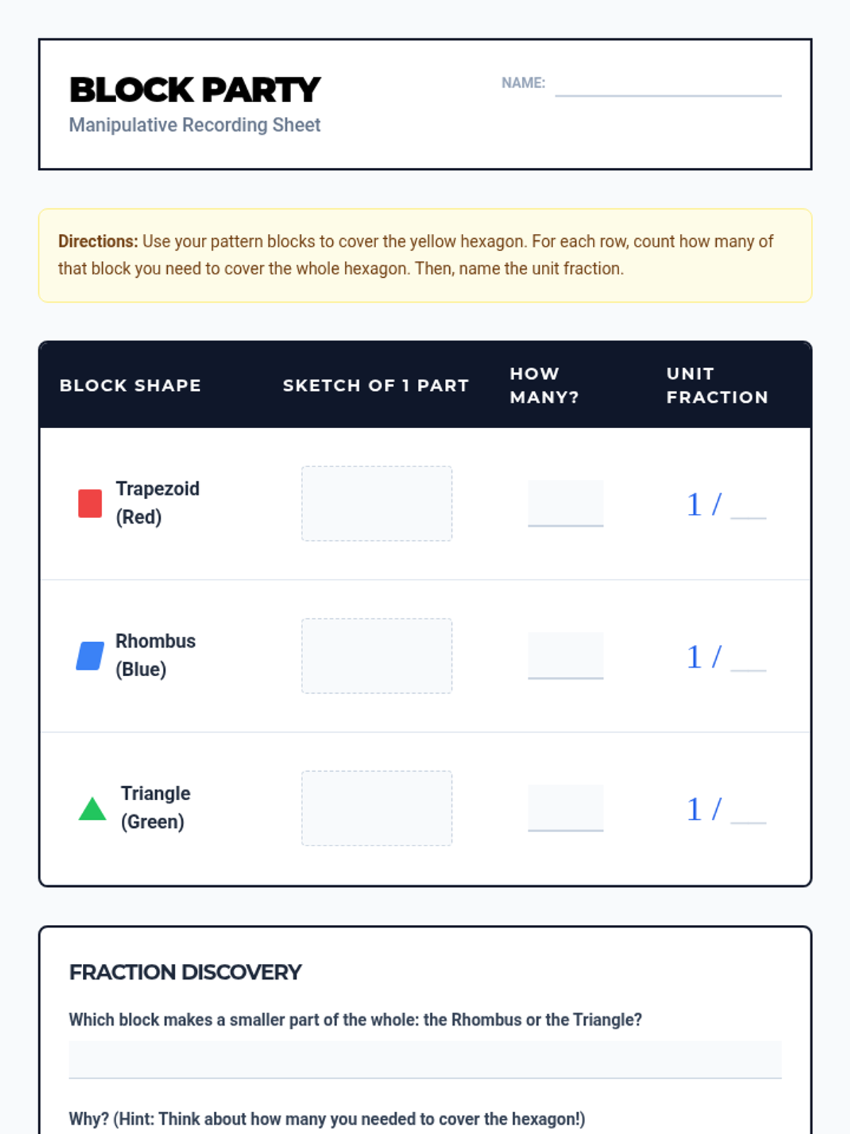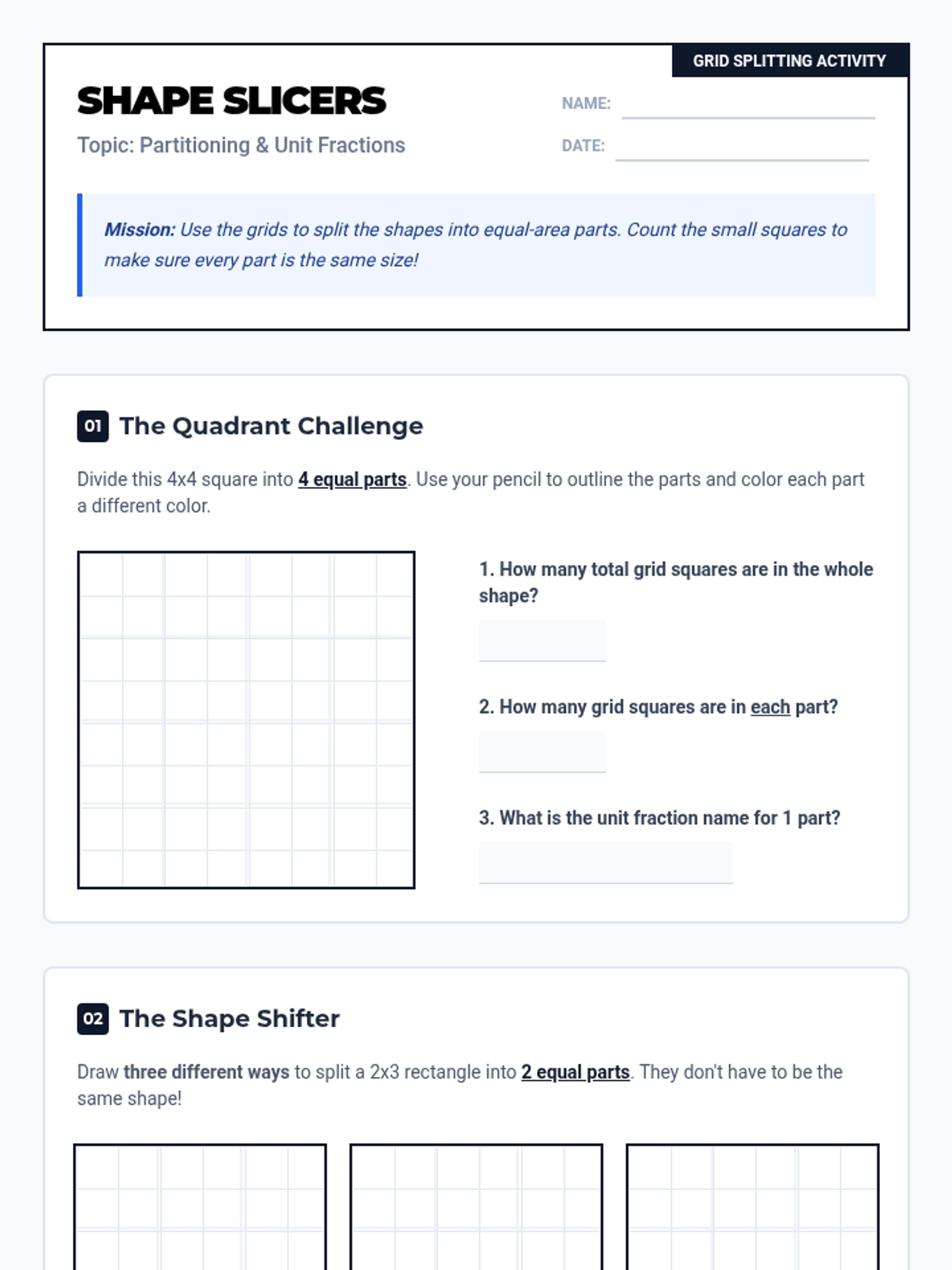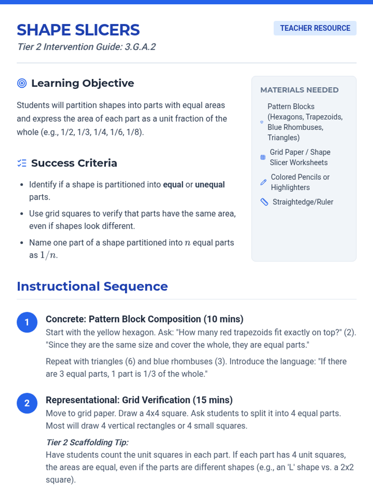 A Tier 2 intervention lesson focusing on partitioning shapes into equal-area parts and identifying unit fractions using grids and pattern blocks. Students will move from concrete manipulatives to representational grid-drawing to abstract fraction naming.