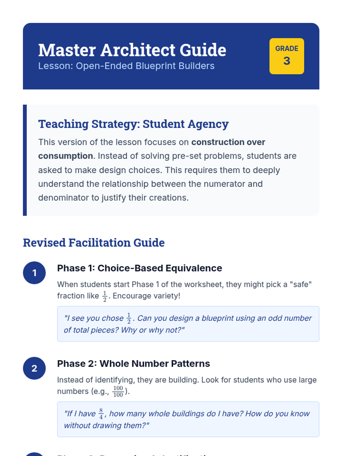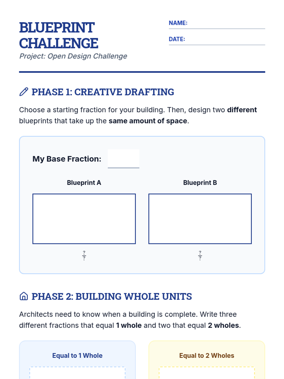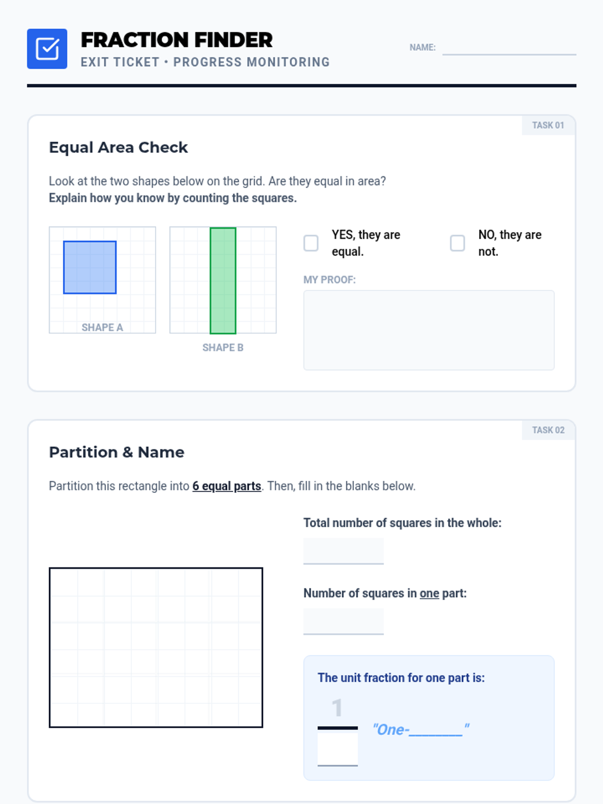 A Tier 2 intervention lesson focusing on partitioning shapes into equal-area parts and identifying unit fractions using grids and pattern blocks. Students will move from concrete manipulatives to representational grid-drawing to abstract fraction naming.