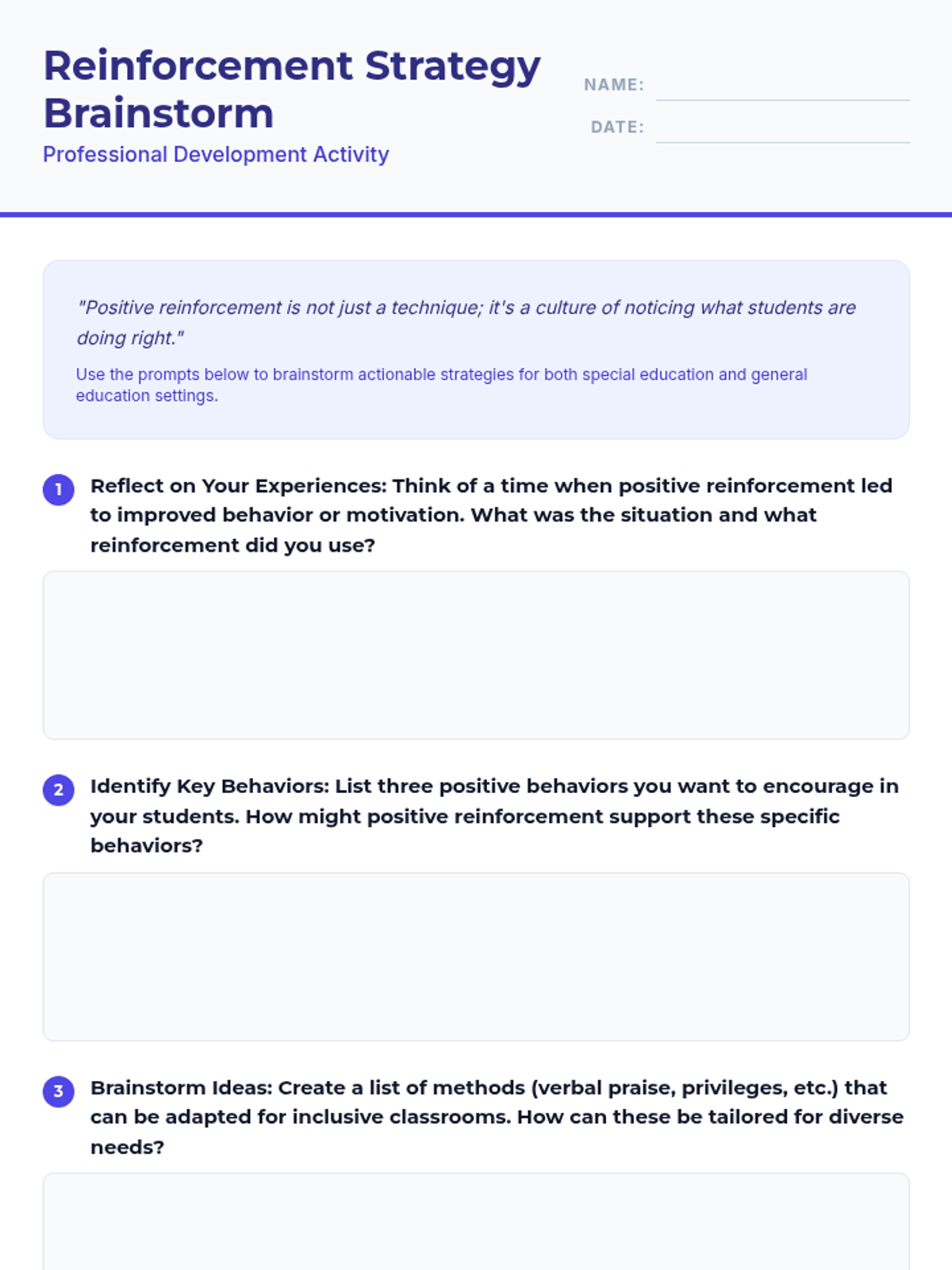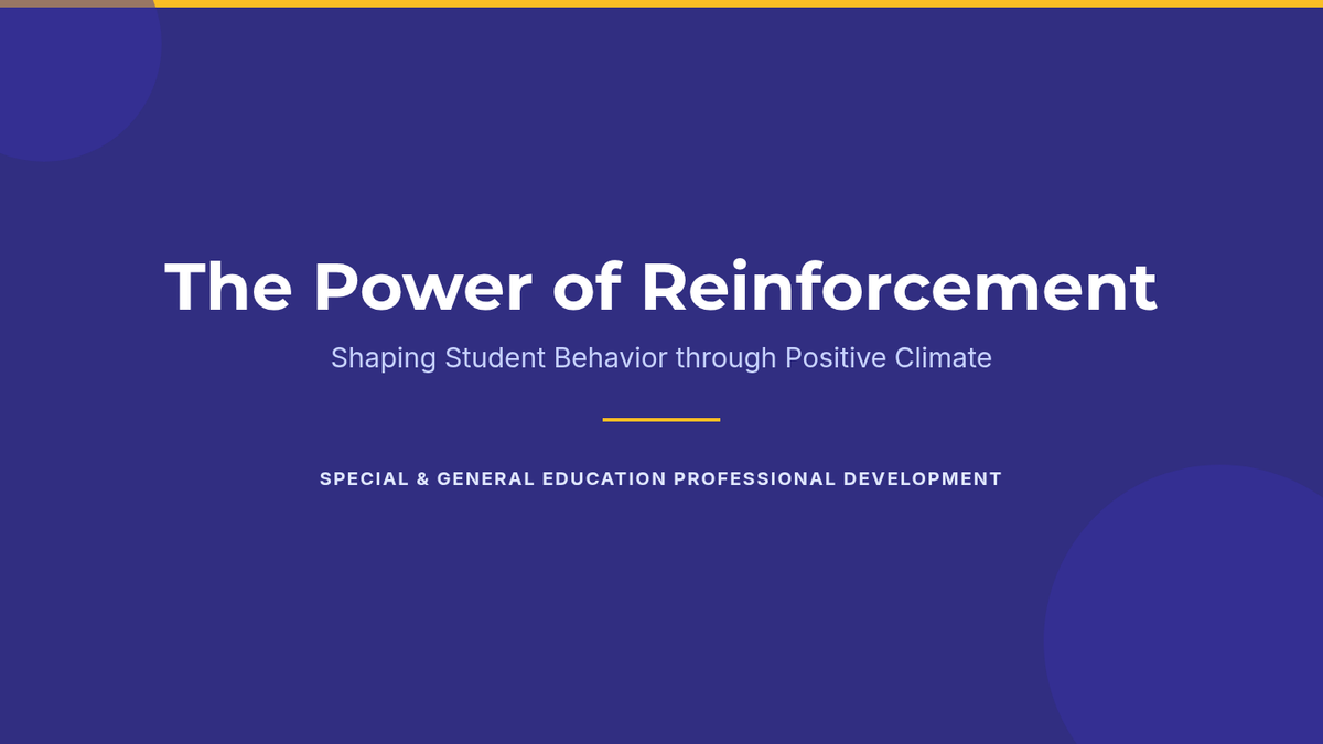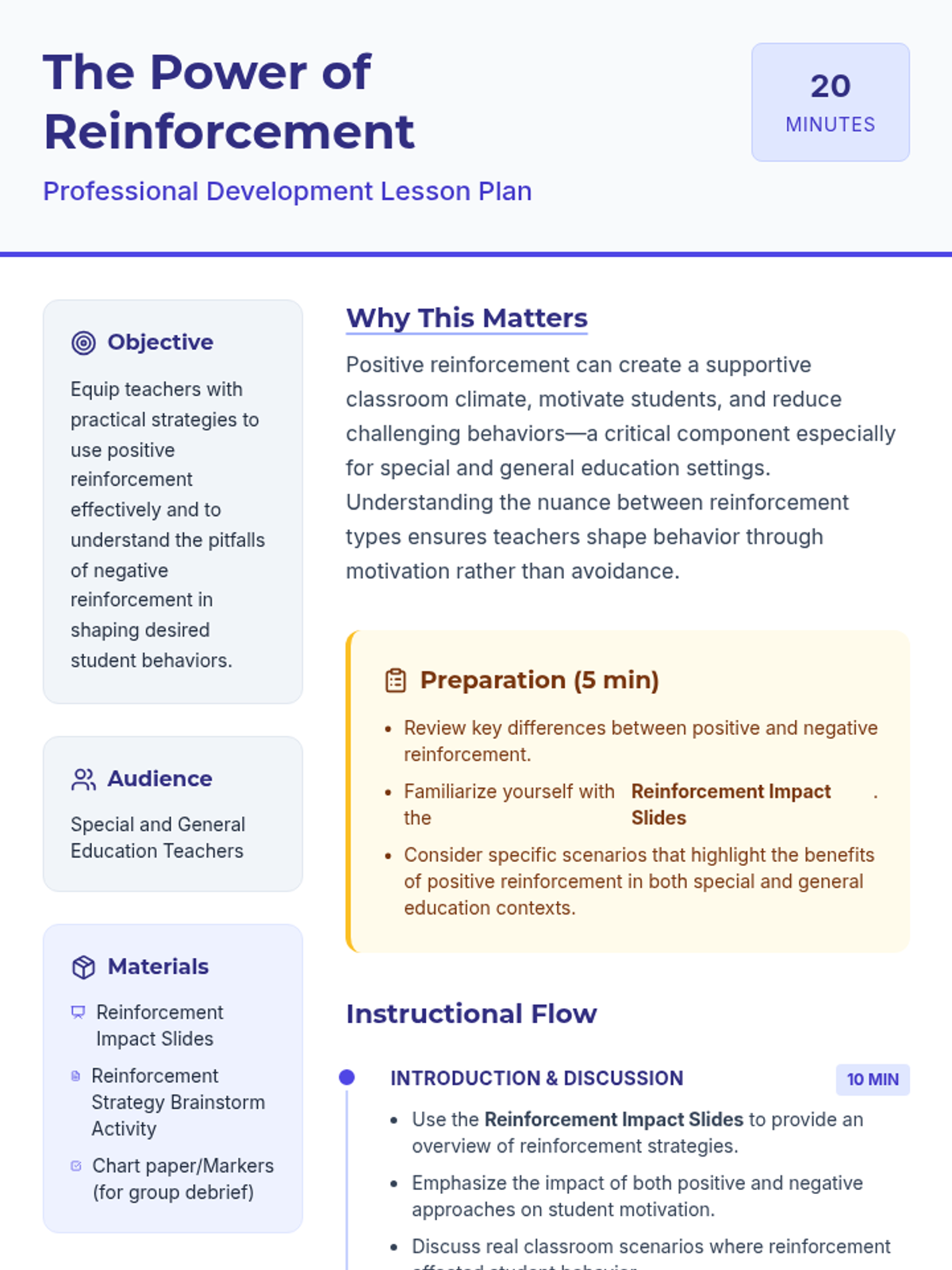 A 20-minute professional development session for special and general education teachers on the effective use of positive reinforcement to shape student behavior and create a supportive classroom climate.