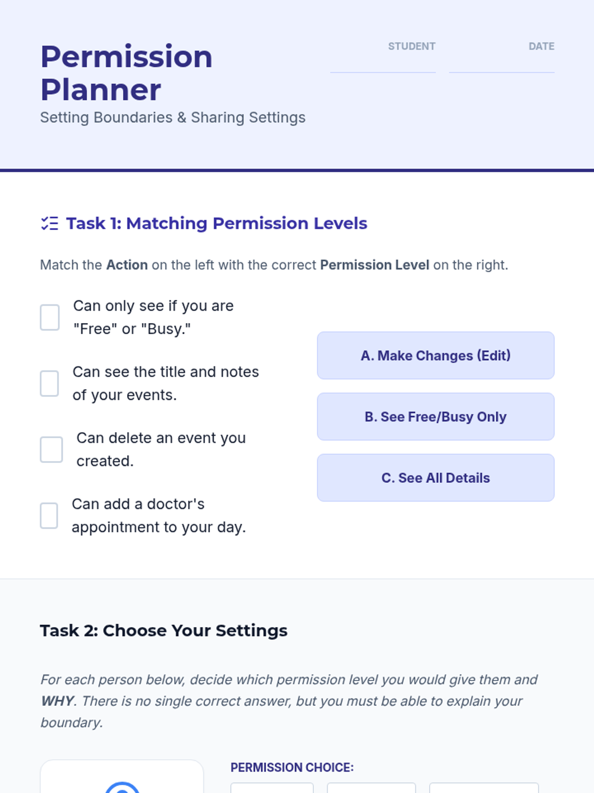 Explores the technical and social aspects of sharing calendars, including permission levels (view vs. edit) and establishing personal boundaries with parents, bosses, and coaches.