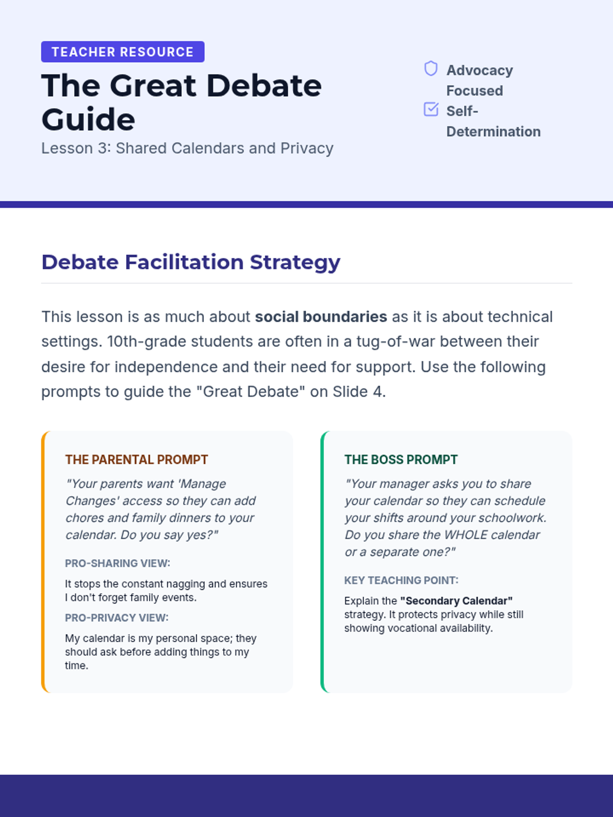 A focused session on postsecondary self-advocacy, teaching students with learning differences how to communicate their needs to professors and employers. The lesson emphasizes the transition from high school's automatic support to the self-initiated systems of college and the workplace.