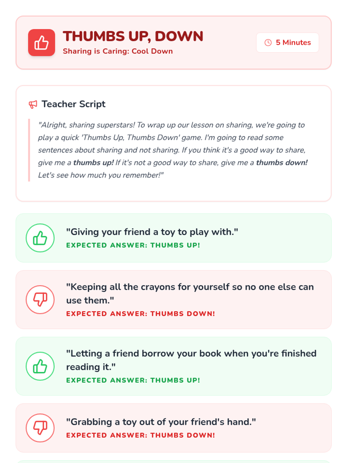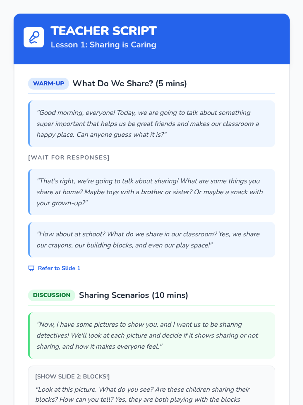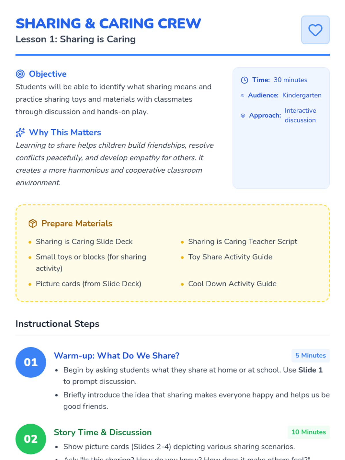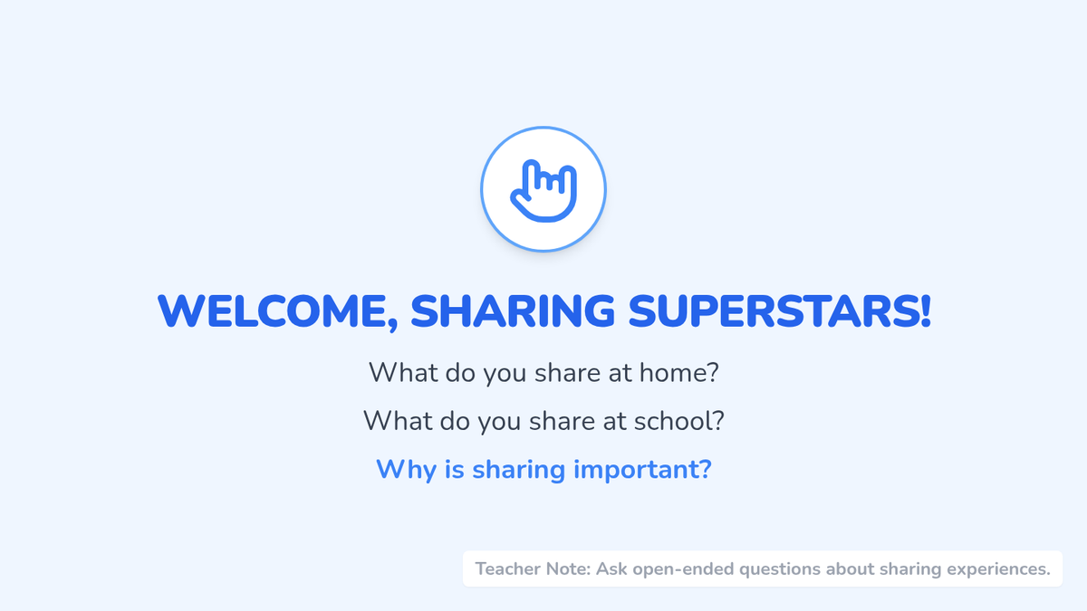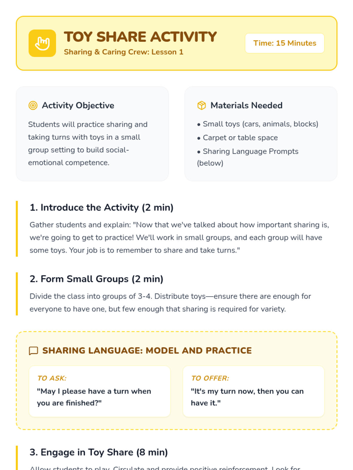 Students will be able to identify what sharing means and practice sharing toys and materials with classmates through discussion and hands-on play.