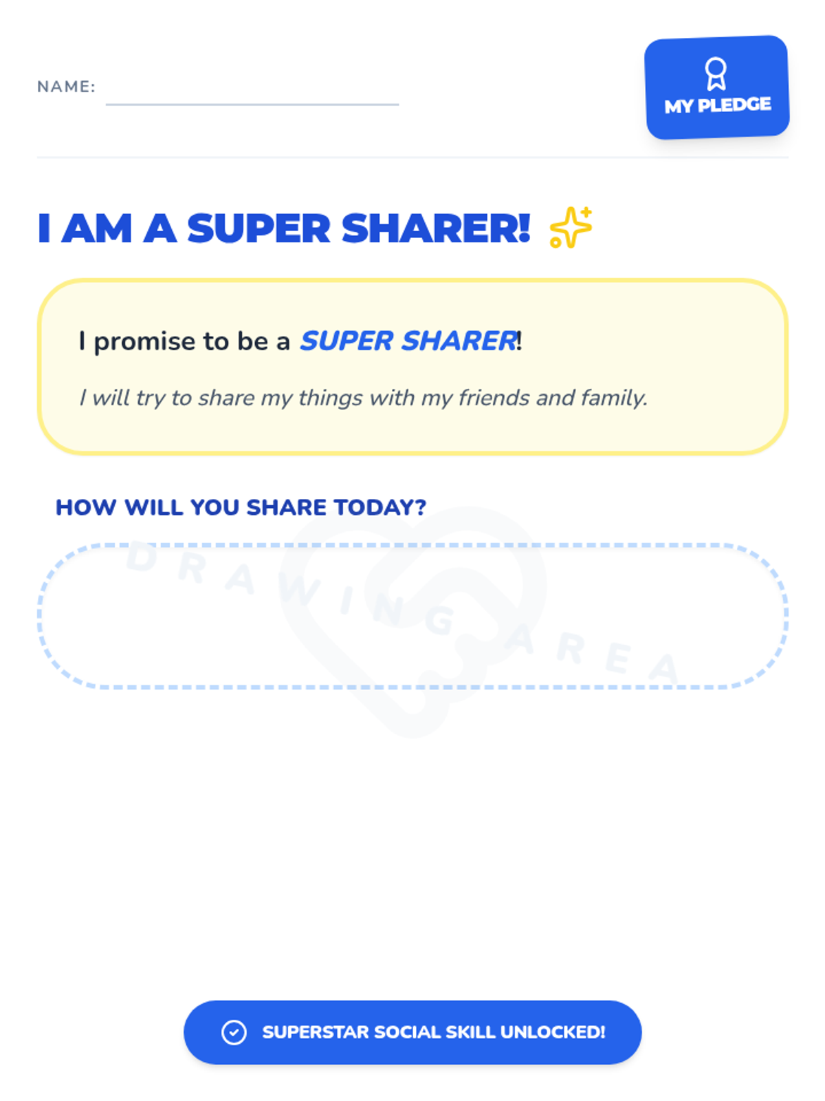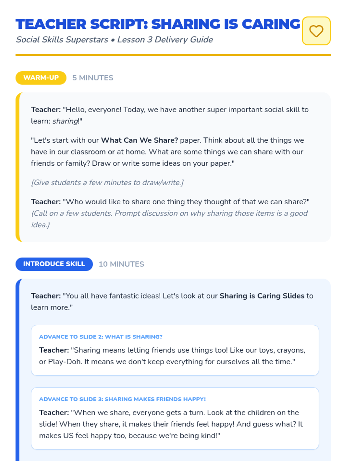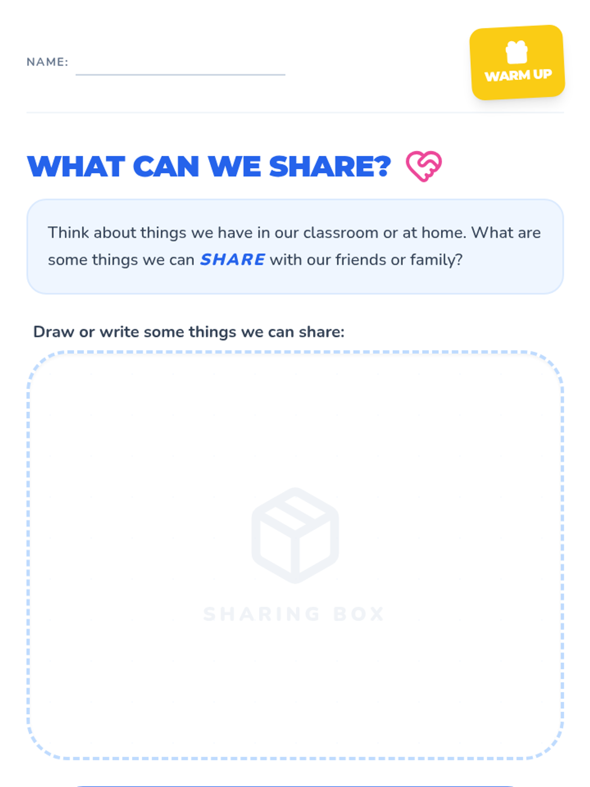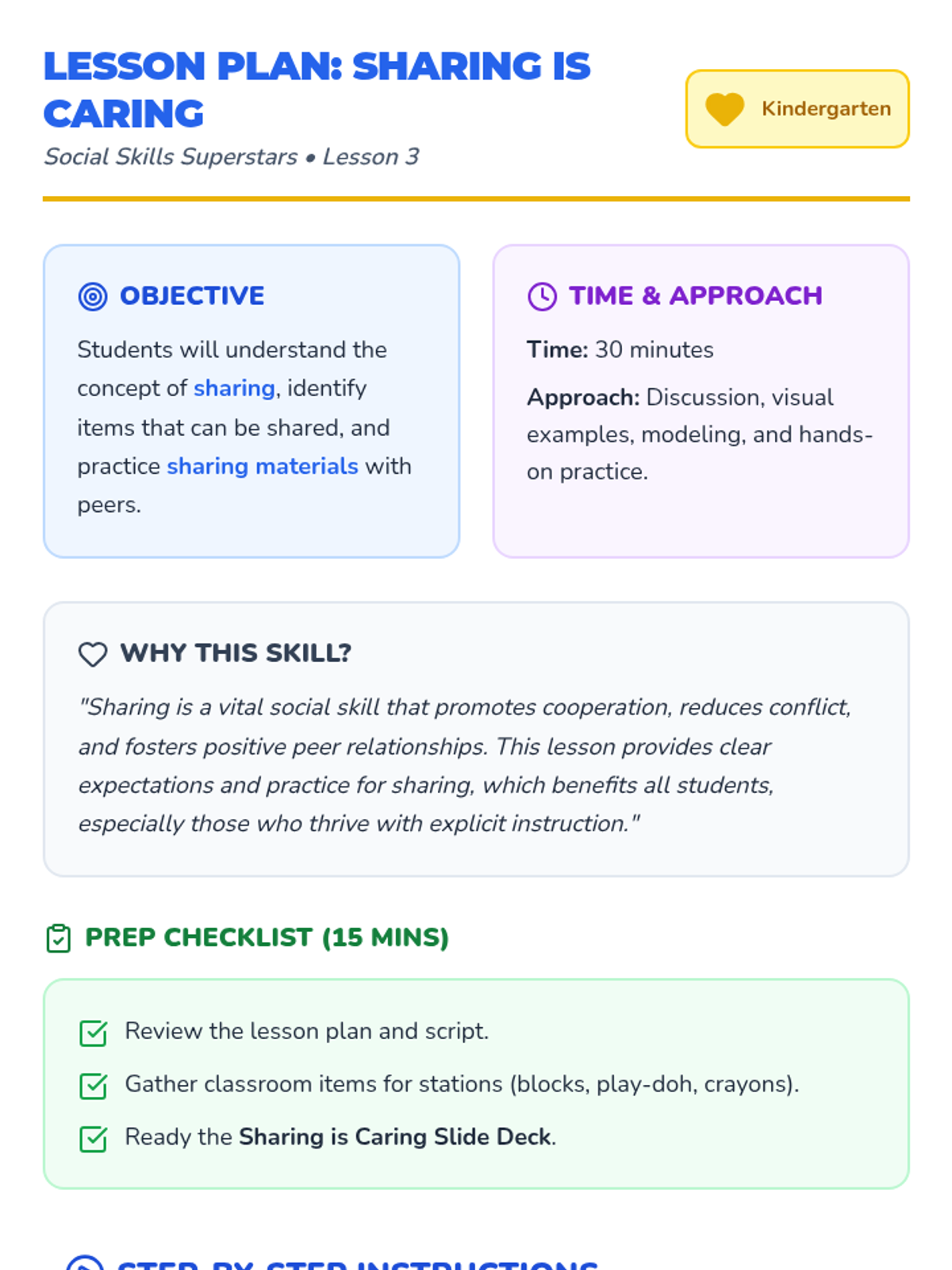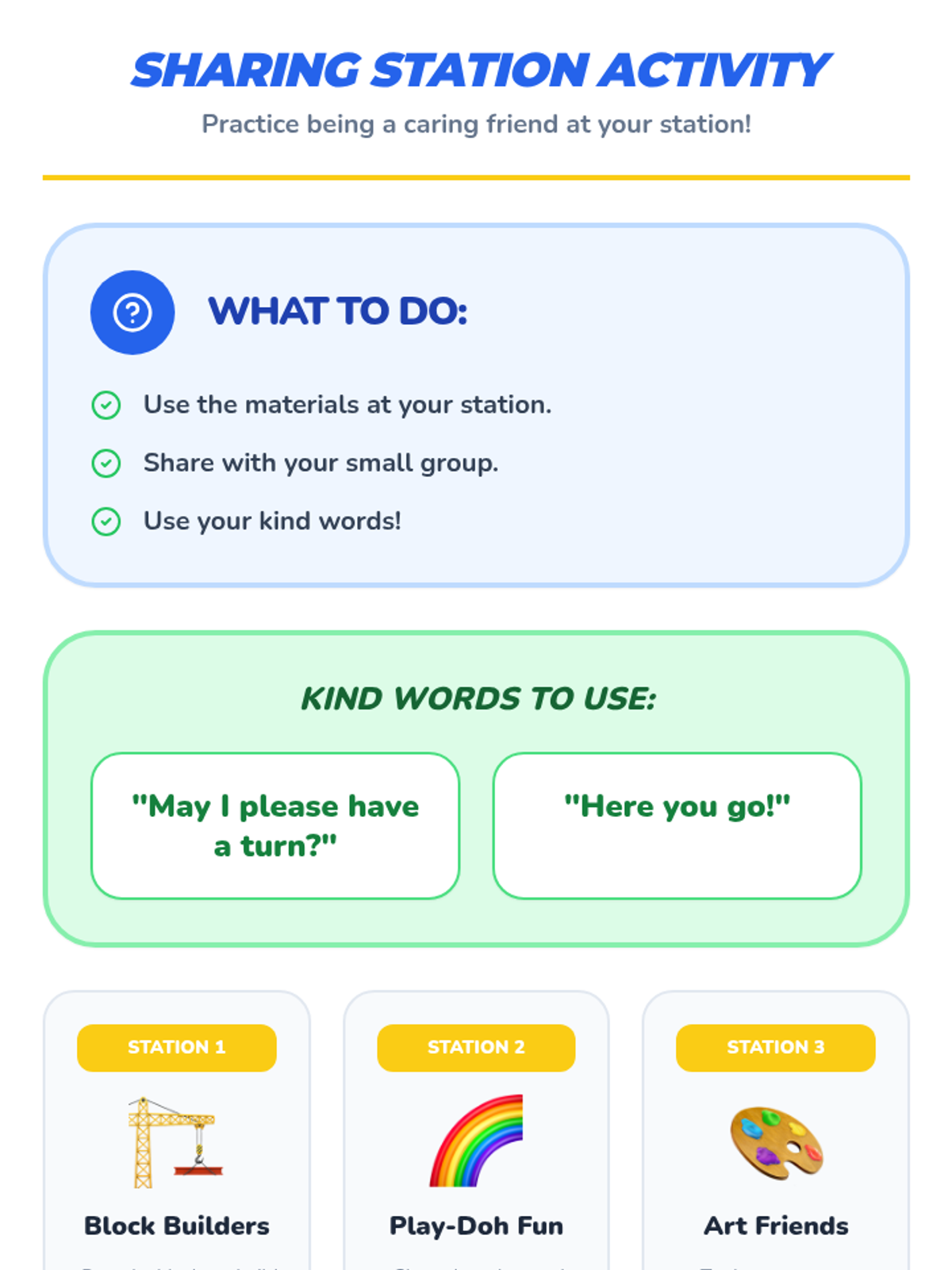 Focuses on the concept of sharing, identifying items that can be shared, and practicing polite language for sharing with peers.