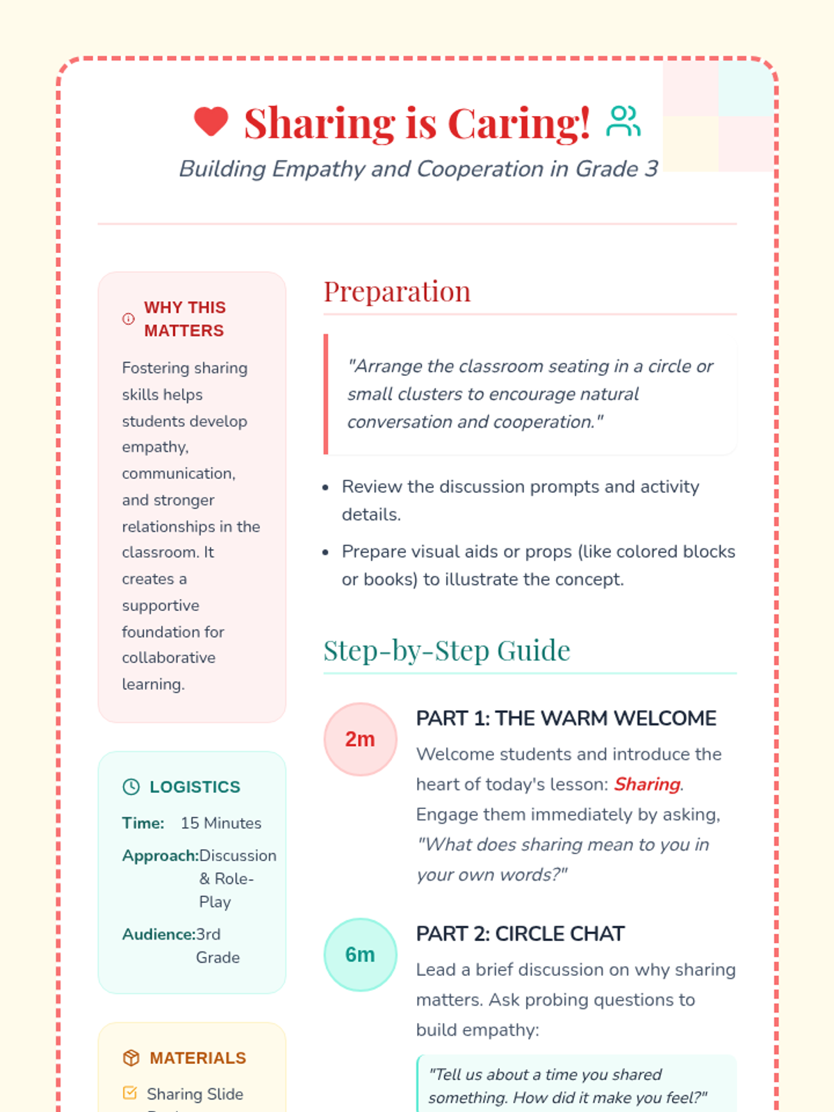 A quick and impactful 15-minute lesson for 3rd graders on the importance of sharing, empathy, and cooperation to build a positive classroom environment.