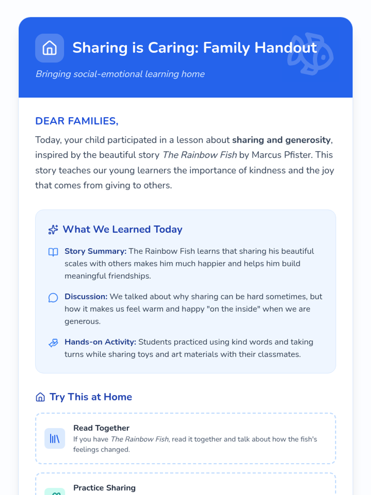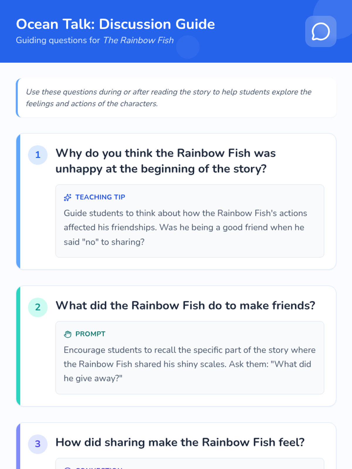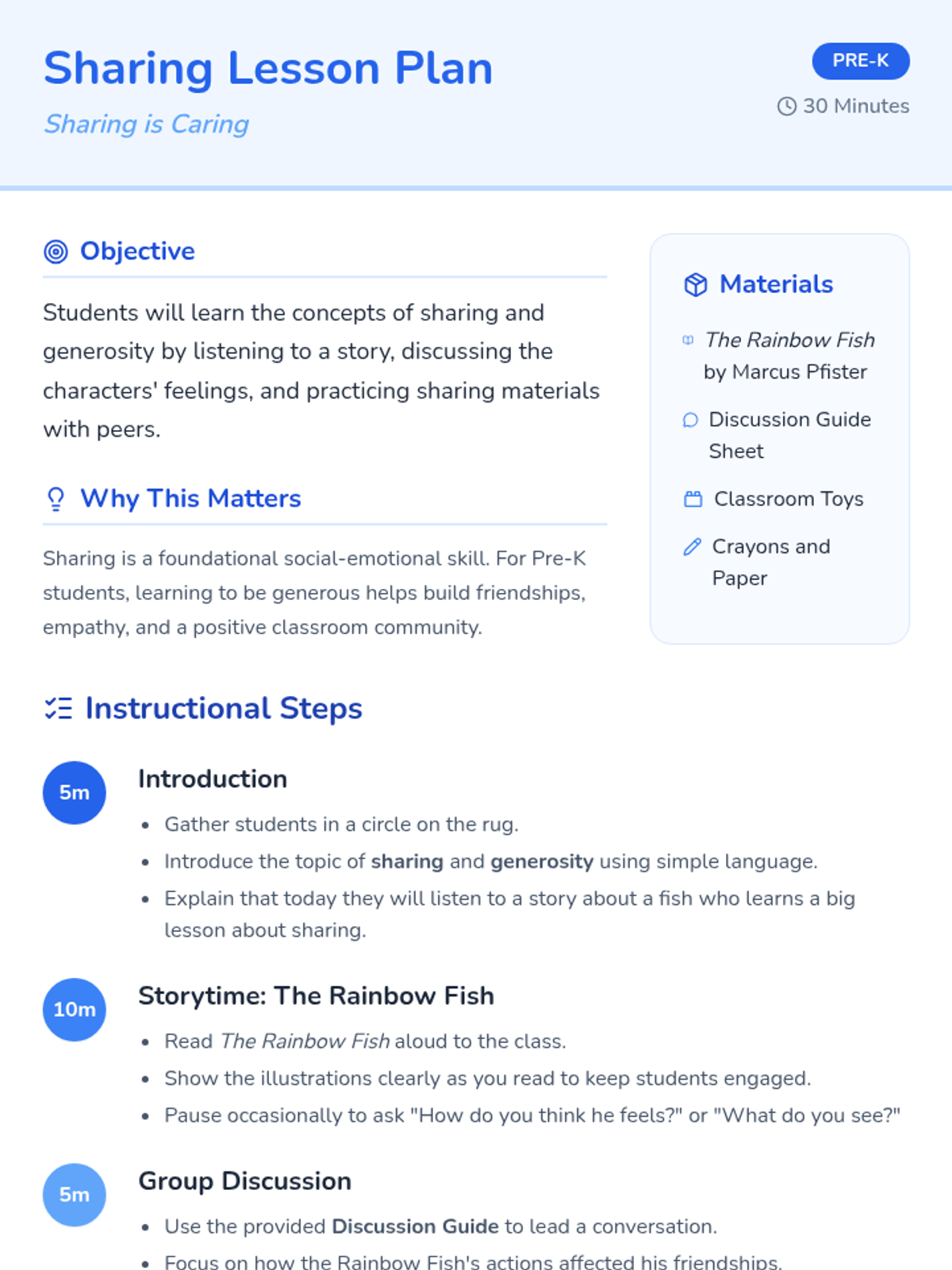 A Pre-K lesson introducing sharing and generosity through the story 'The Rainbow Fish'. Students engage in storytime, discussion, and hands-on practice to develop essential social-emotional skills.