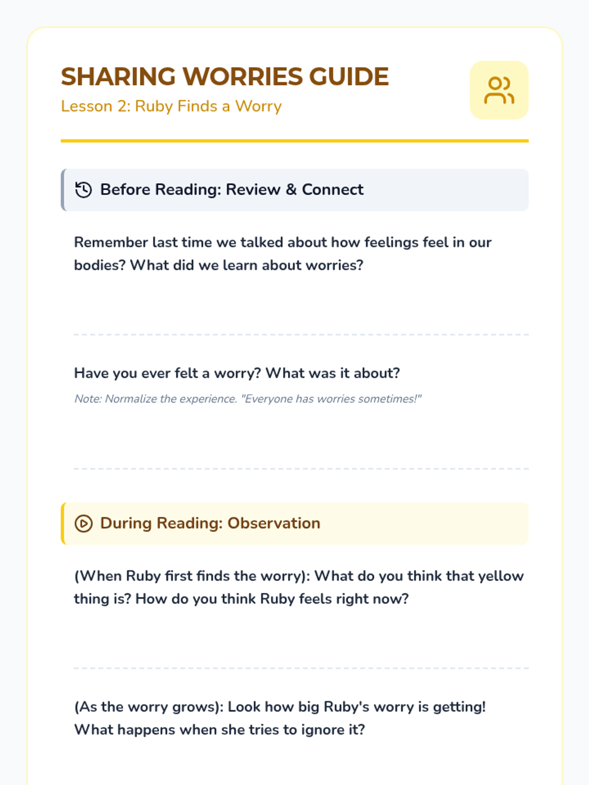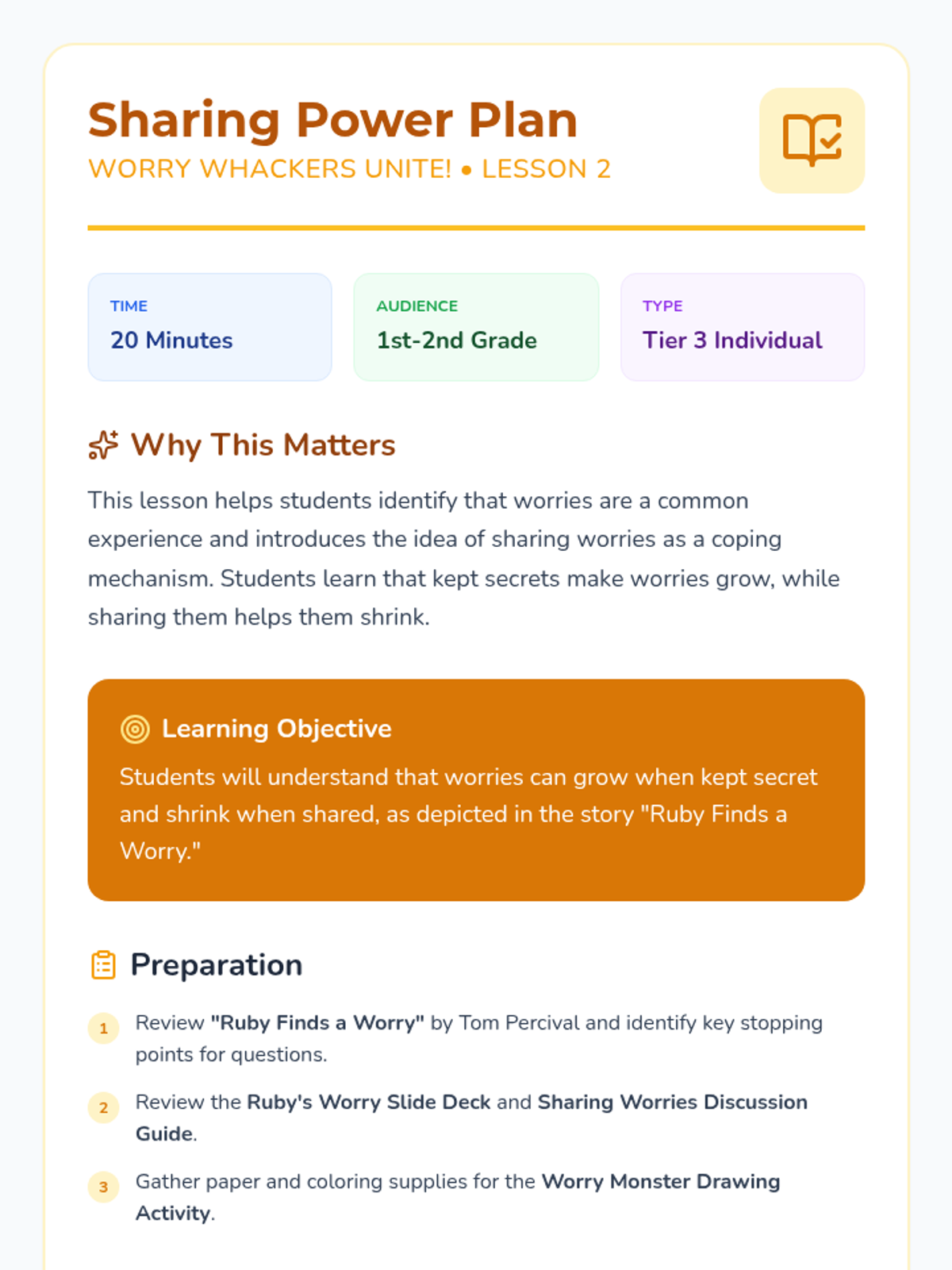 Students explore how worries grow when kept secret and shrink when shared using the story 'Ruby Finds a Worry.'