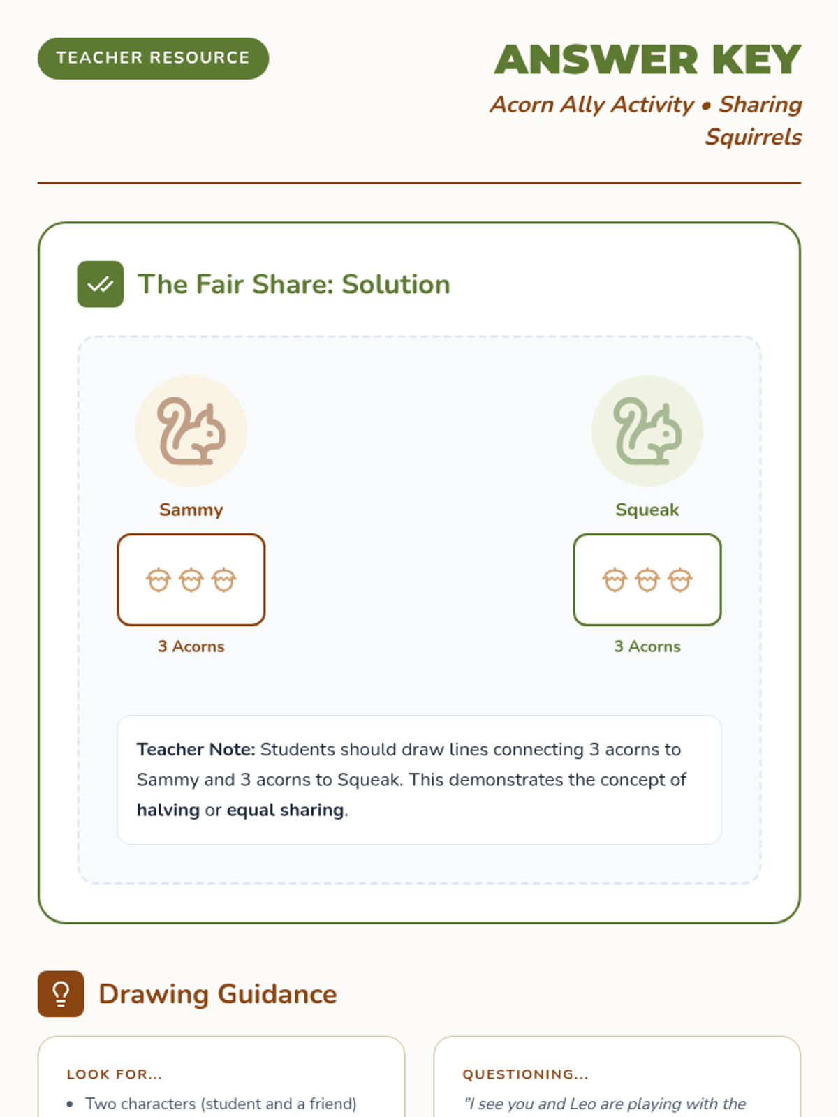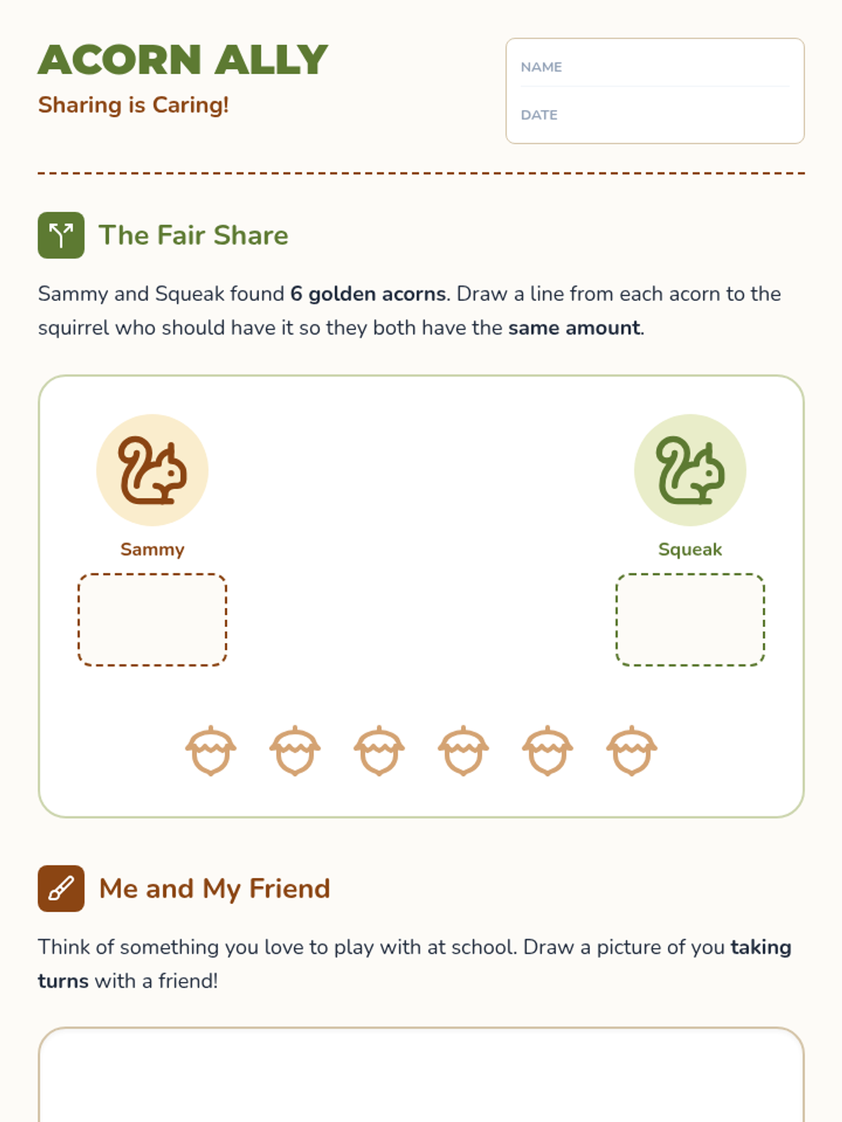 A lesson focused on social-emotional learning, teaching young students the importance of sharing and taking turns through a squirrel-themed narrative and interactive activities.