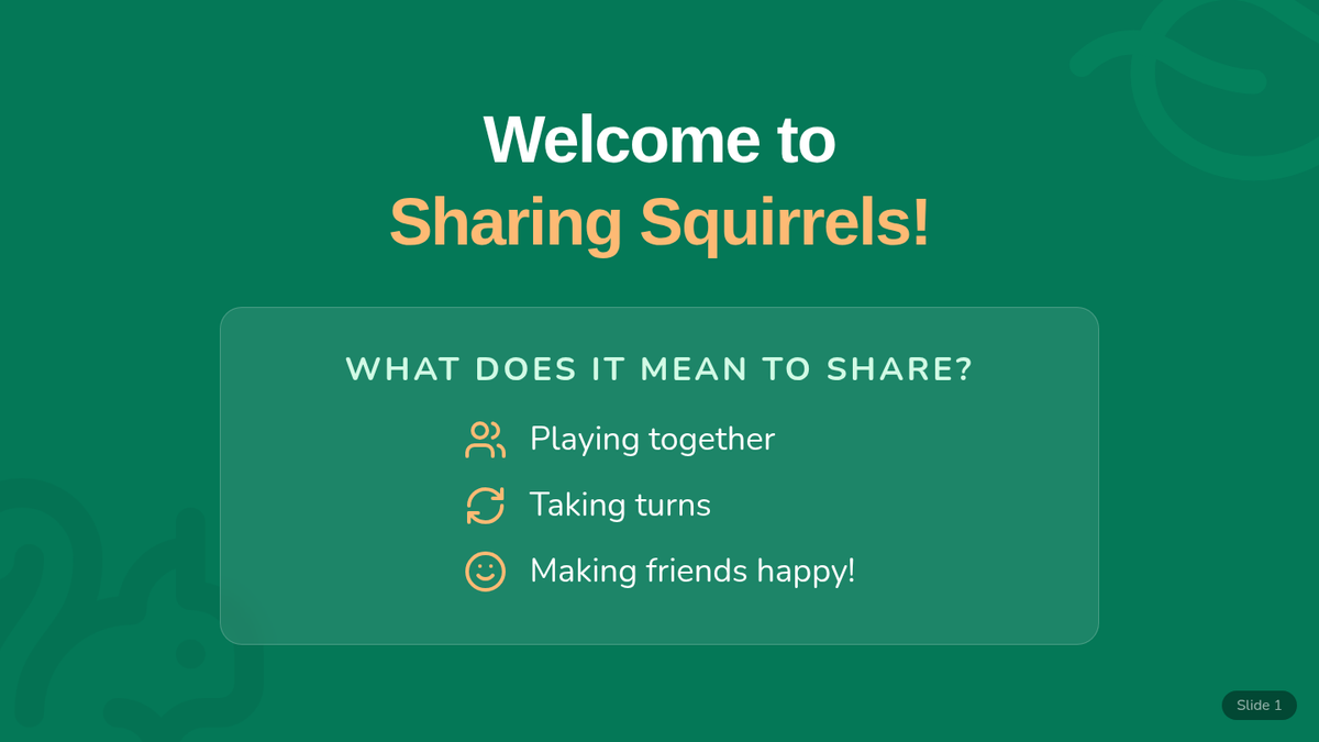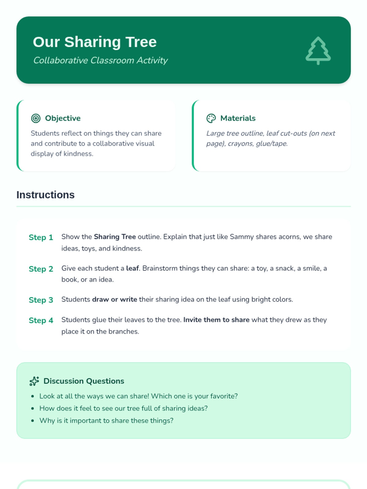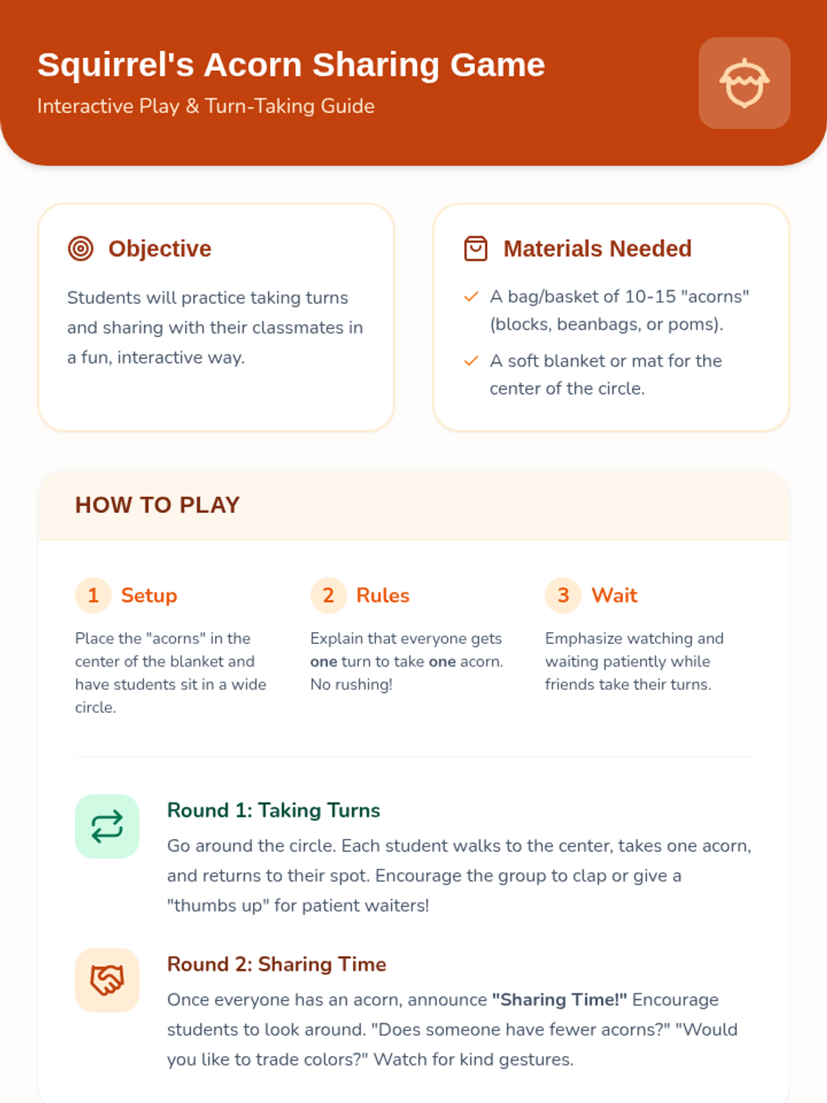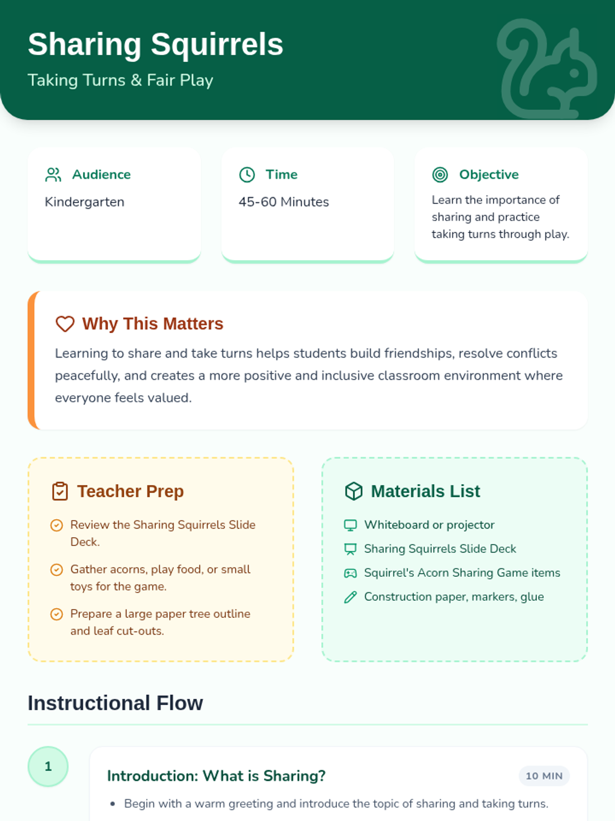 A Kindergarten social-emotional learning lesson focused on sharing and taking turns through the story of Sammy the Squirrel and interactive forest-themed games.