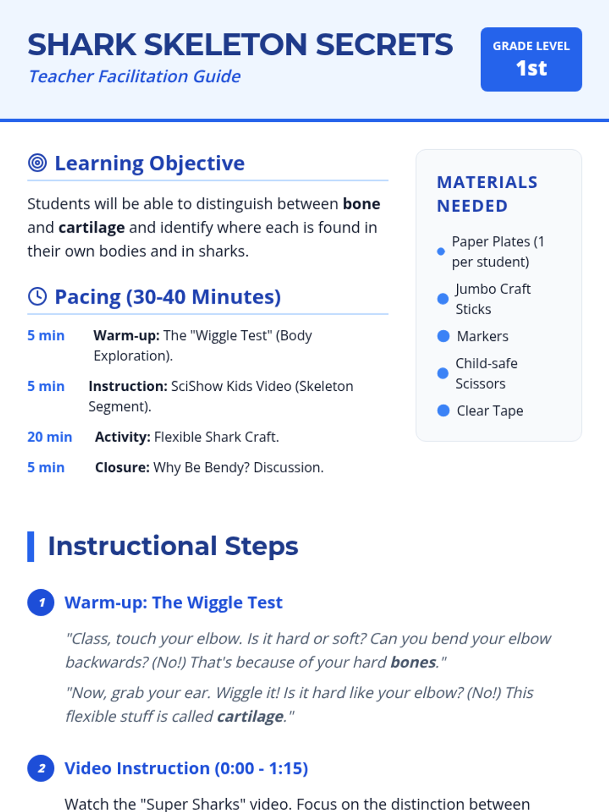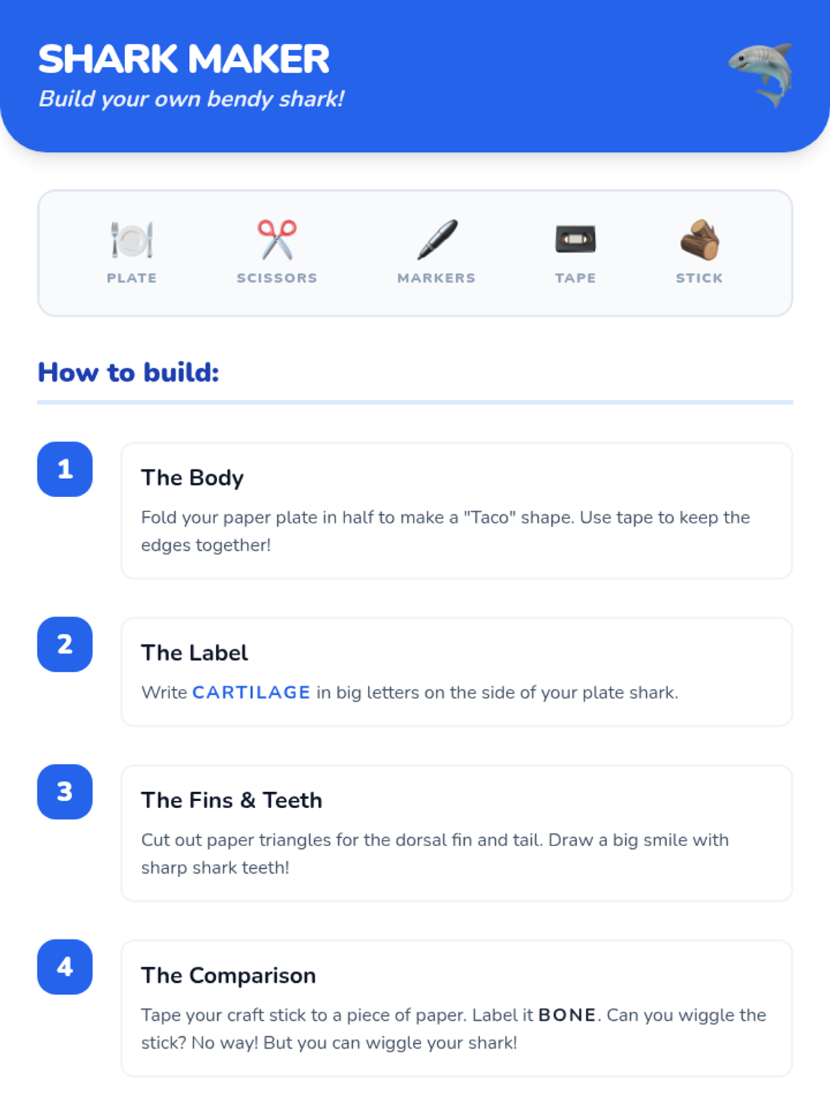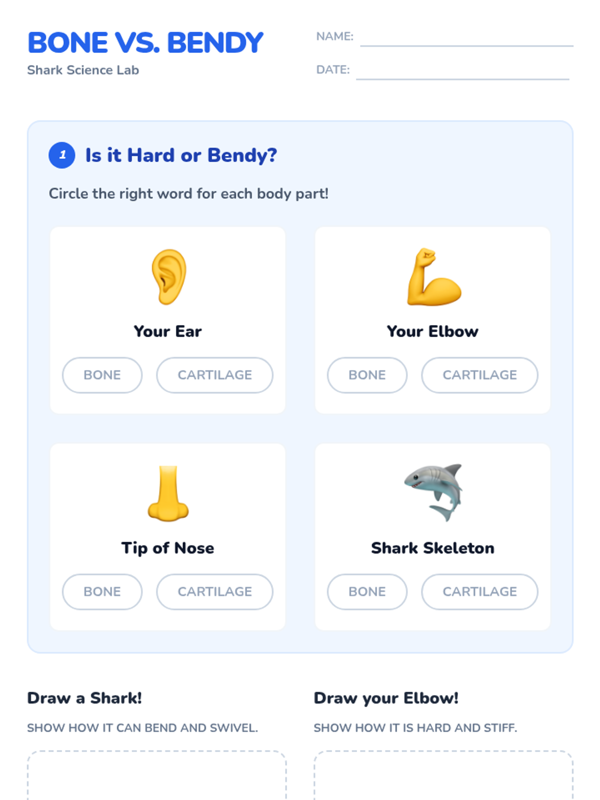 Students explore the difference between bone and cartilage by comparing their own bodies to sharks, featuring a hands-on 'Flexible Shark' craft.