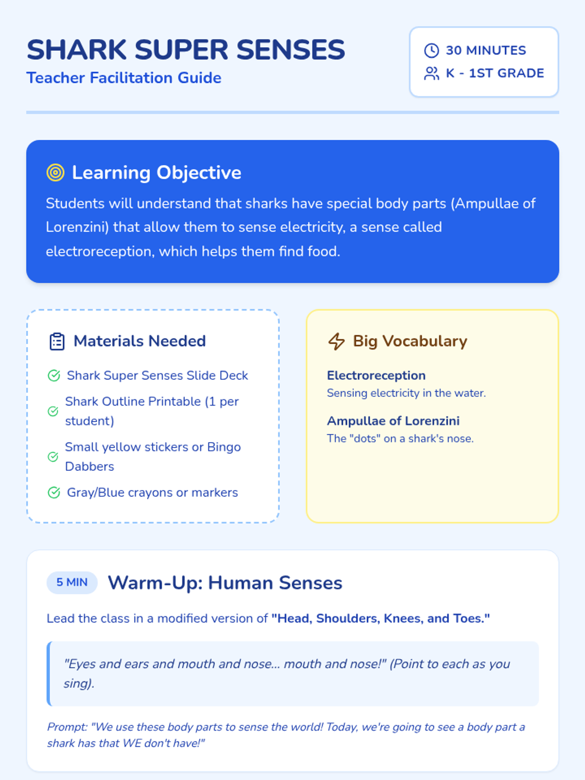 Students will discover how sharks use special body parts to sense electricity in the water. This lesson includes an interactive slide deck, a creative shark anatomy activity, and a teacher's facilitation guide.