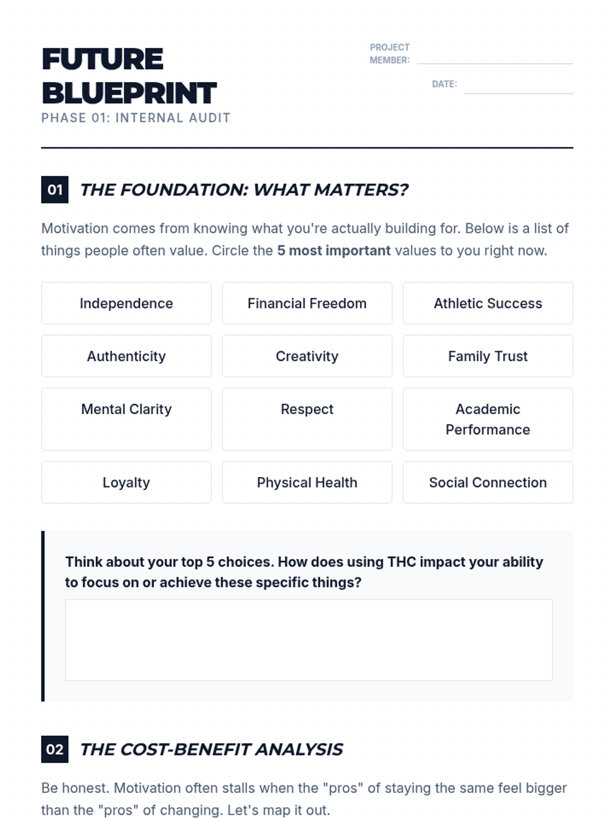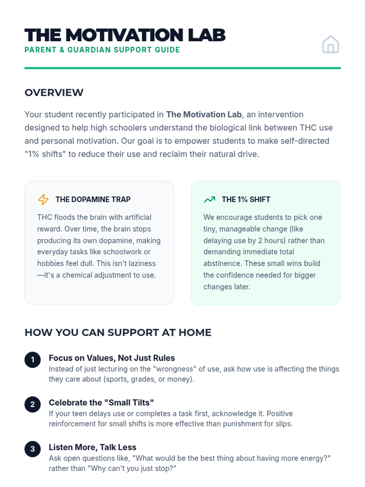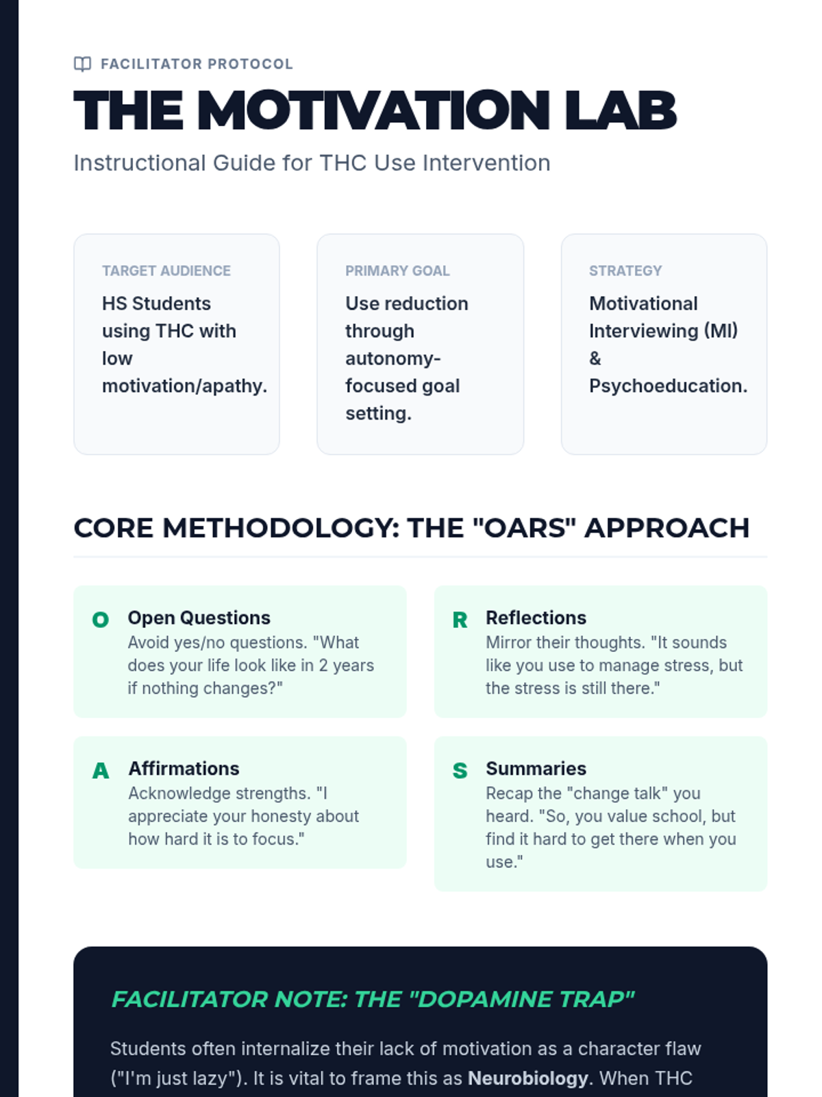 A substance intervention lesson designed for high school students to explore the relationship between THC use and personal motivation, utilizing Motivational Interviewing techniques to encourage use reduction.