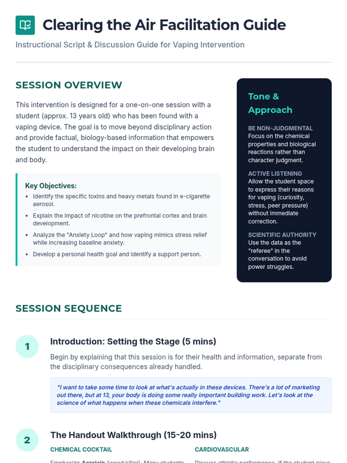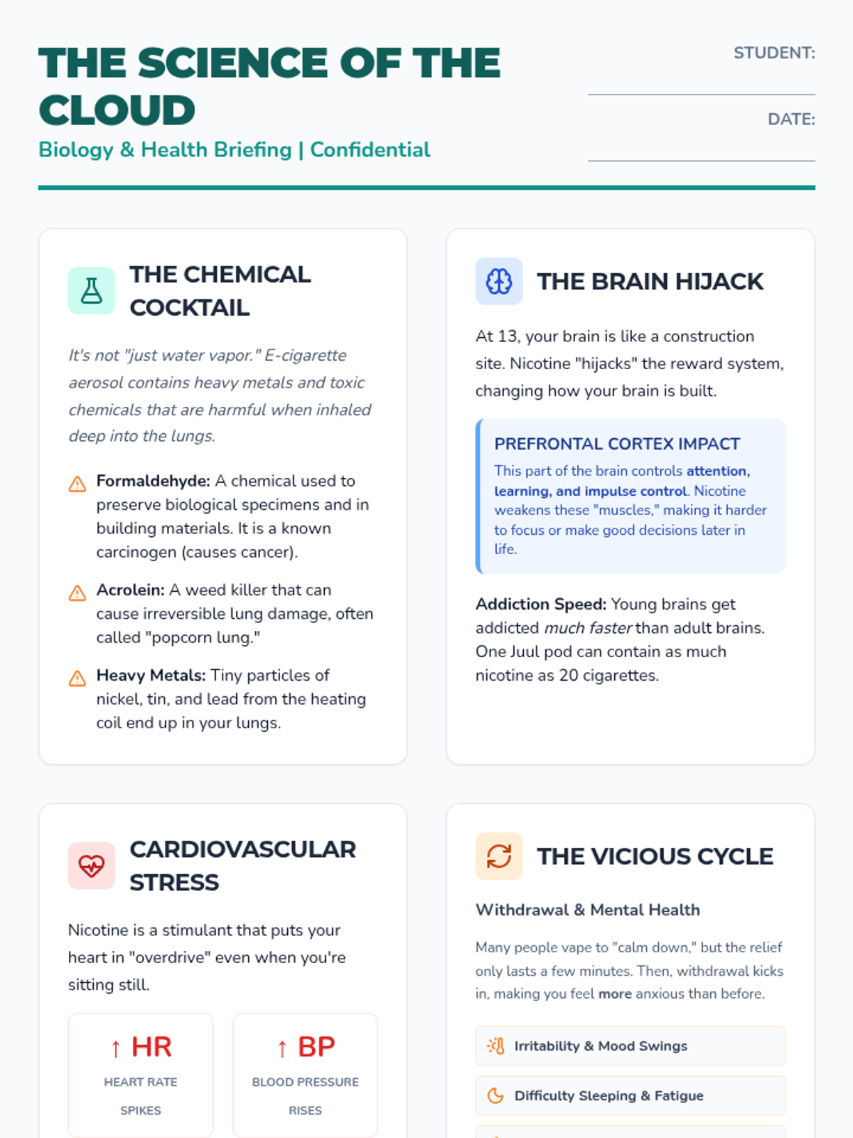 A focused intervention lesson for a student recently suspended for vaping, covering the biological and mental health impacts of nicotine and aerosol exposure.