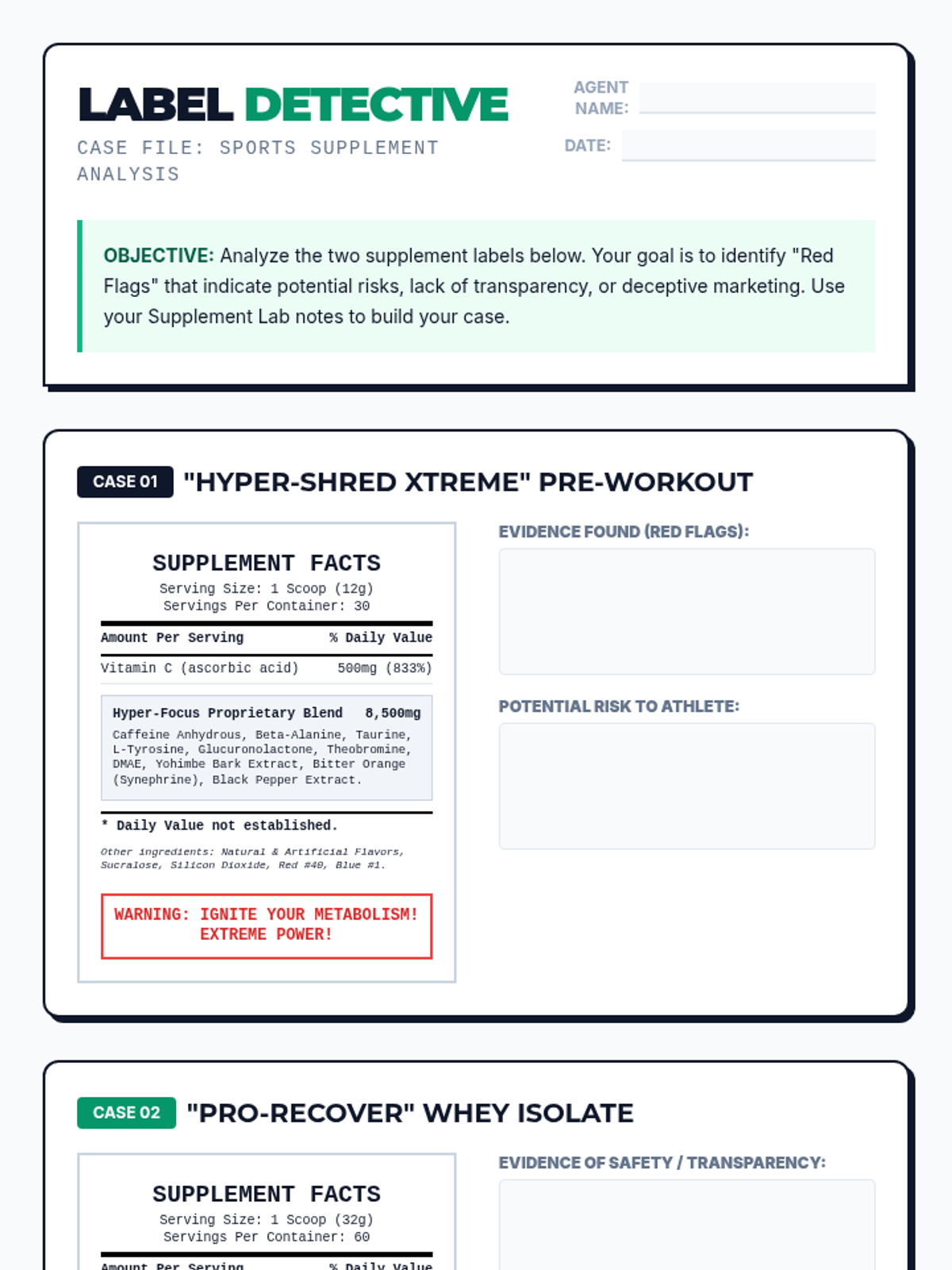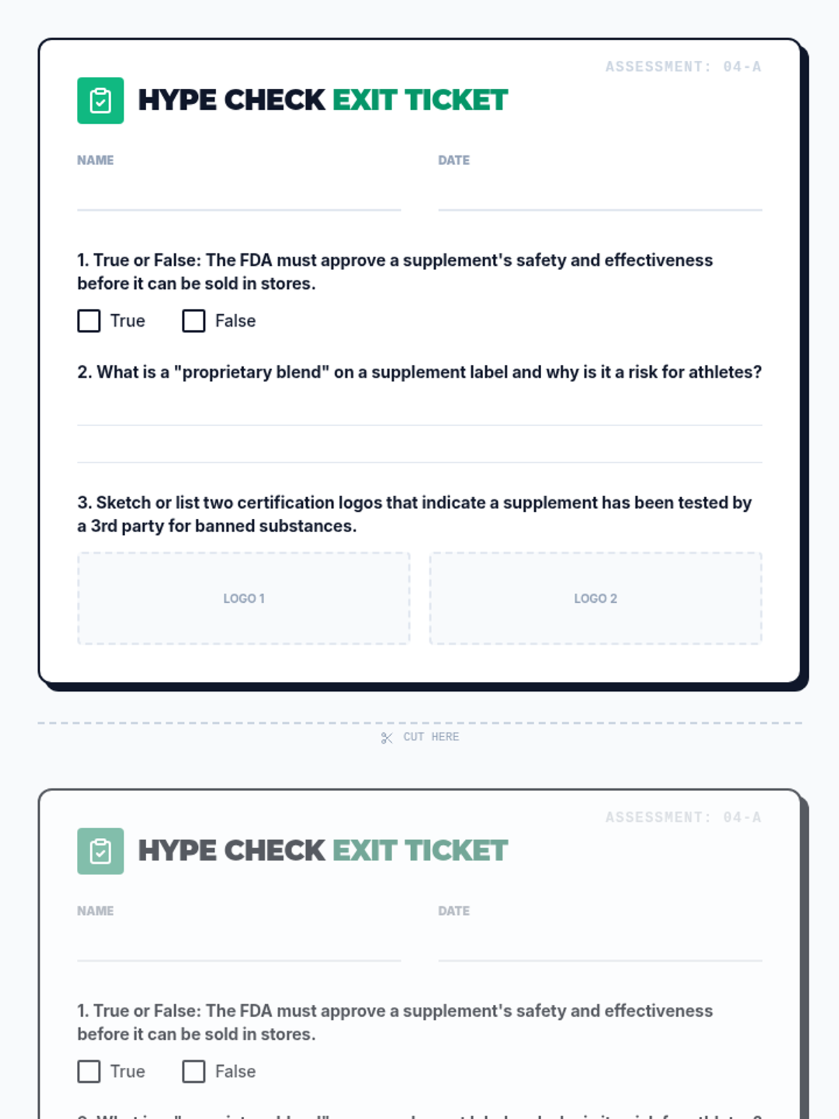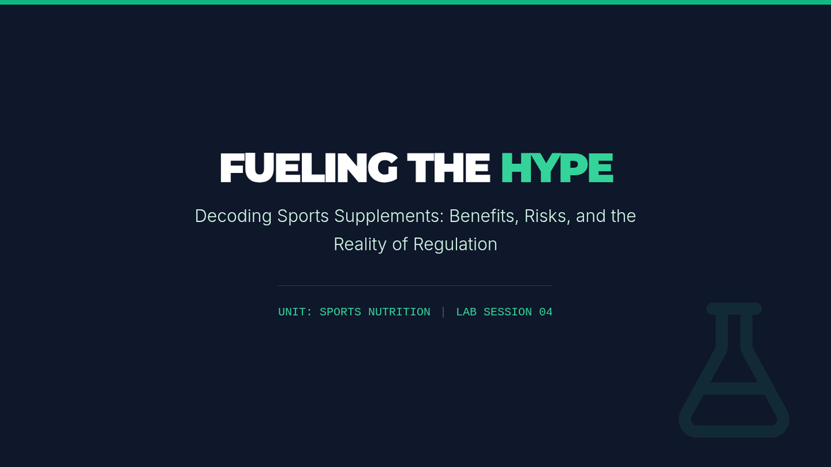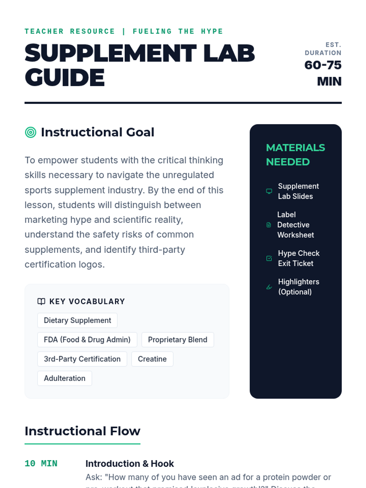 A comprehensive lesson exploring the world of sports supplements, focusing on their purported benefits, potential health risks, and the reality of industry regulation. Students will learn to critically analyze labels and marketing claims.