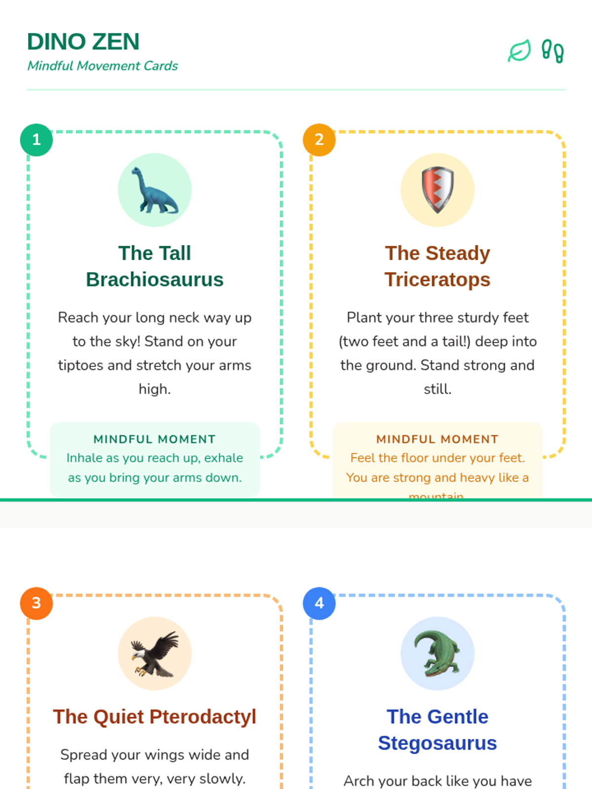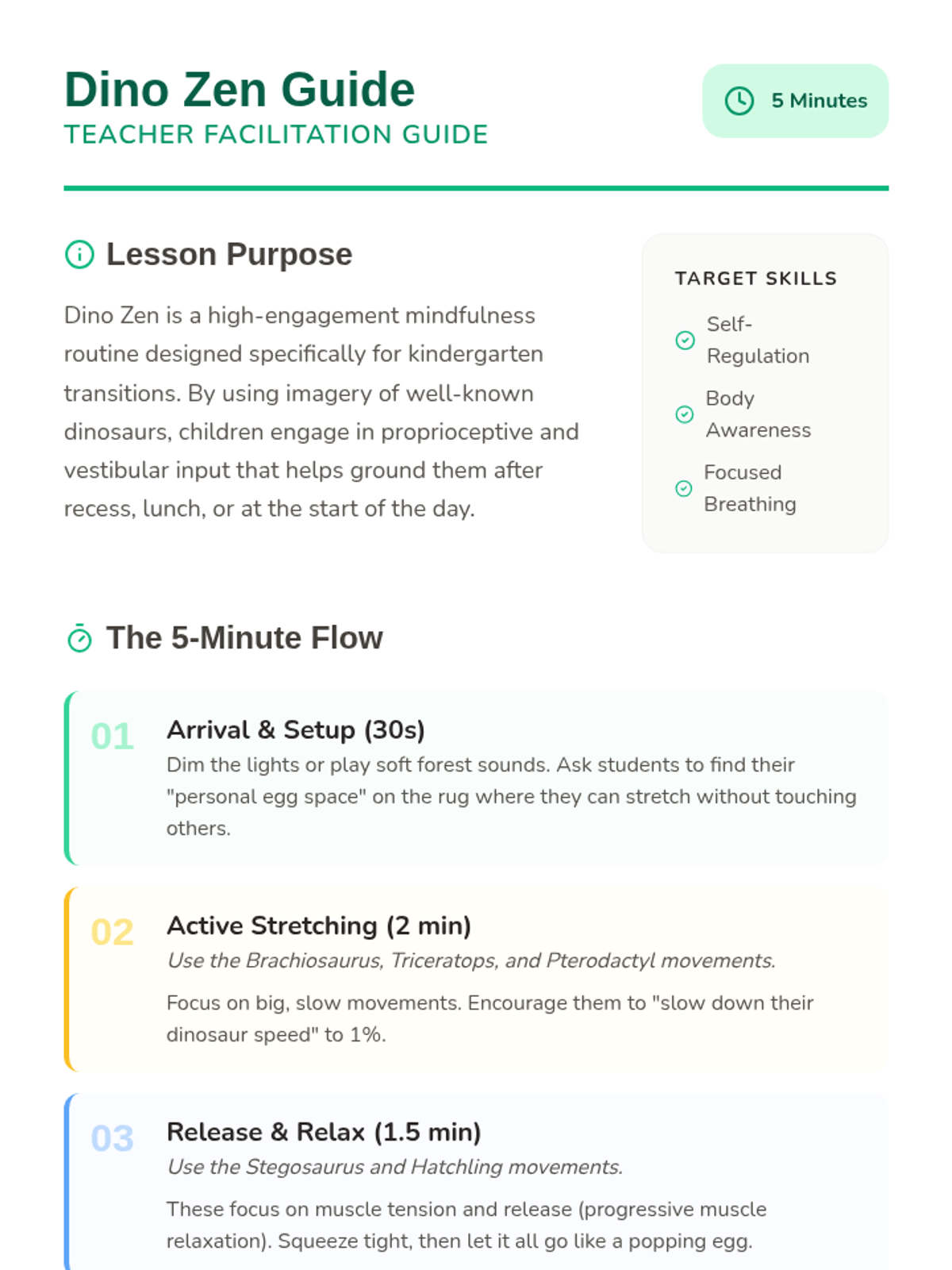 A 5-minute mindfulness warm-up for kindergarteners that uses dinosaur-themed movements to improve focus, regulation, and body awareness.