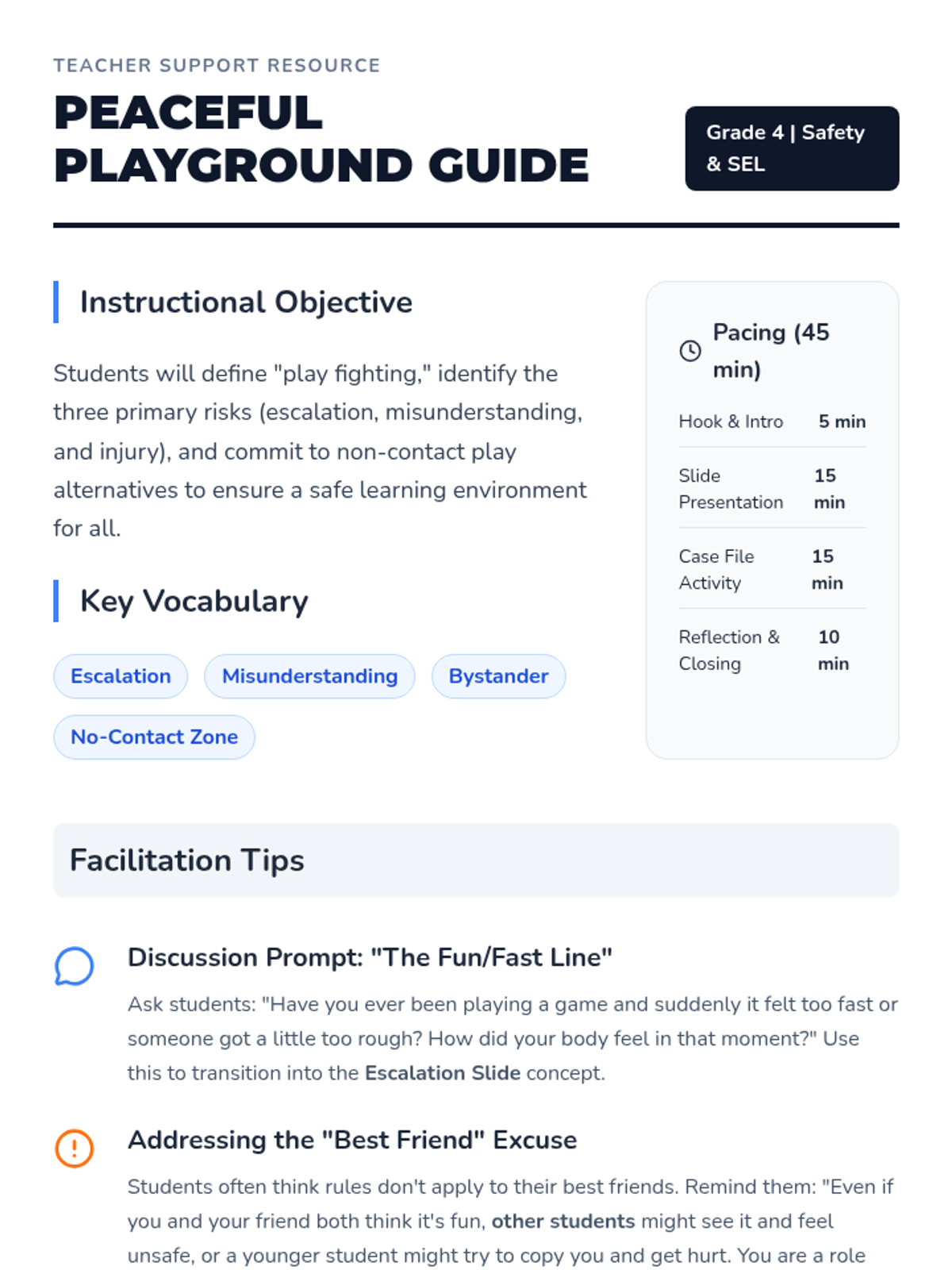 A comprehensive lesson for 4th graders exploring why play fighting is unsafe and inappropriate for the school environment, focusing on safety, escalation, and healthy alternatives.