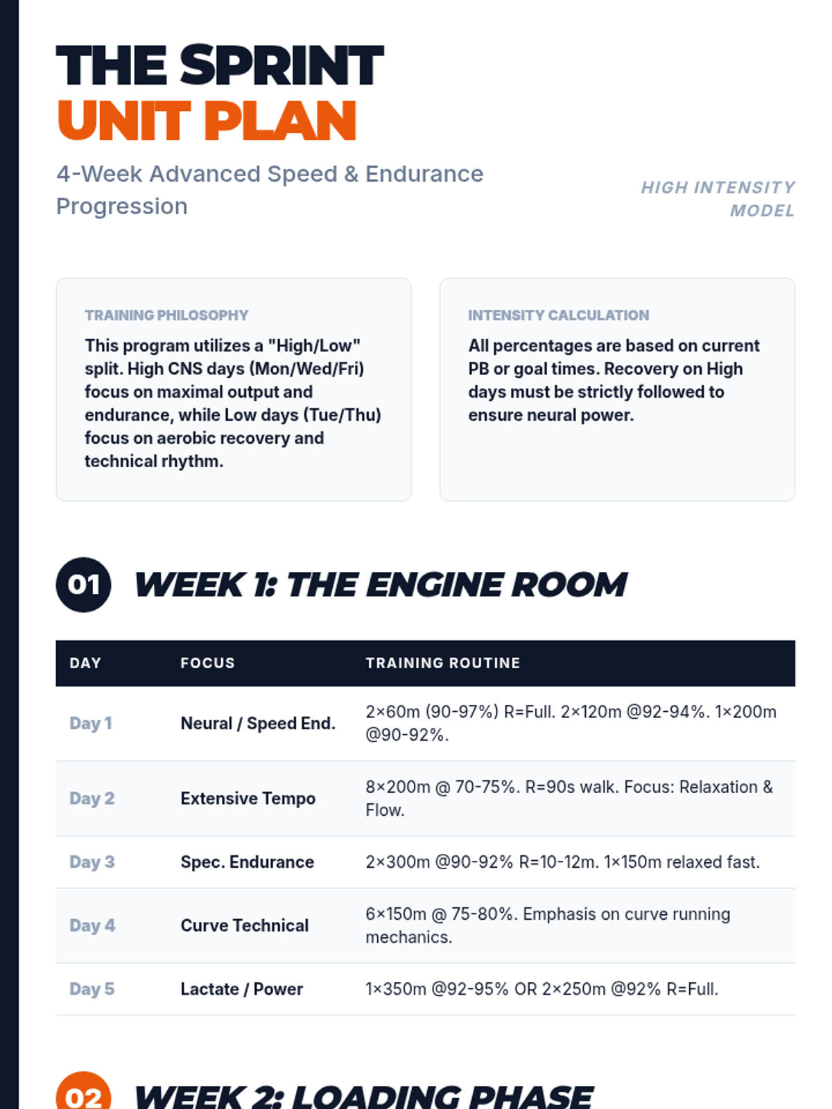 Fine-tuning starts, speed endurance intervals, and preparing for competition-style sprinting.