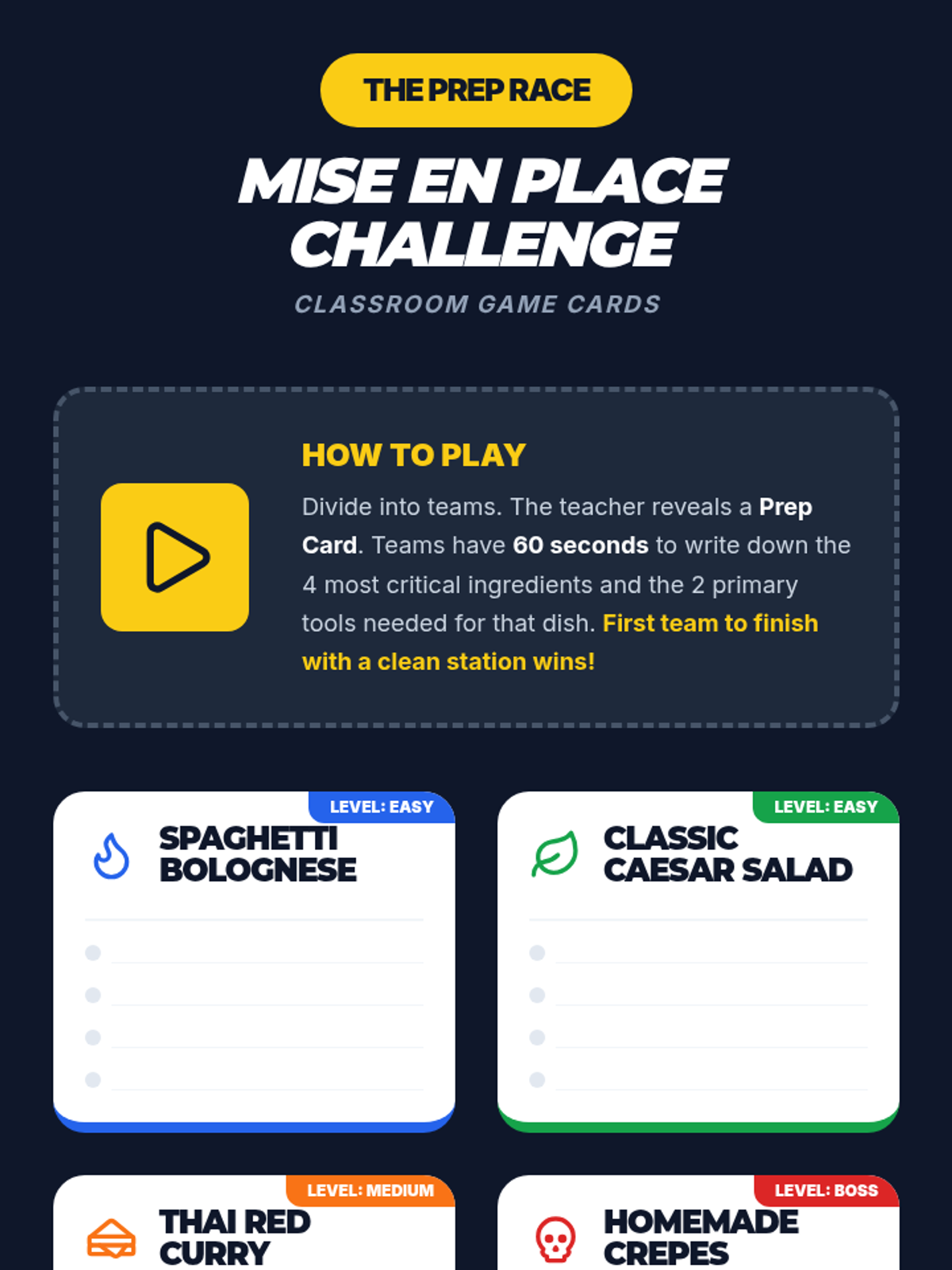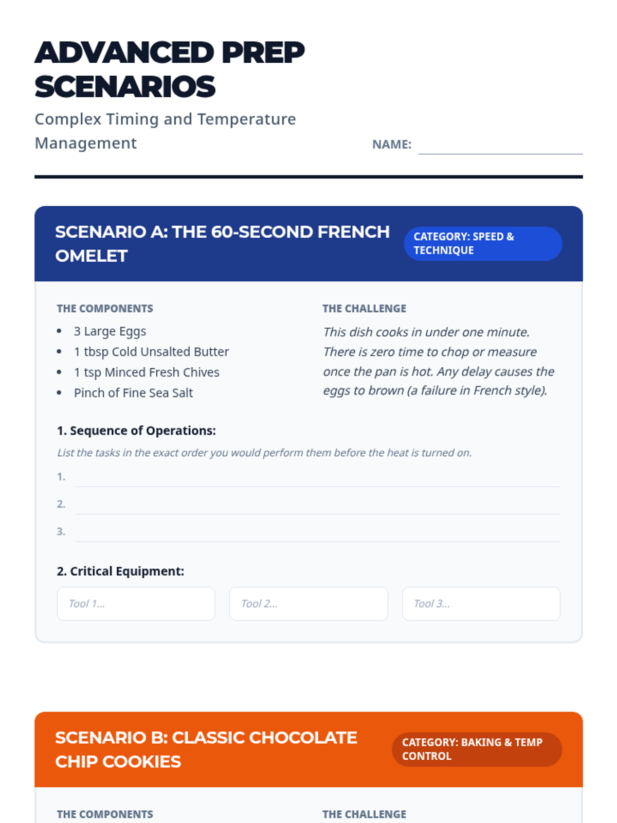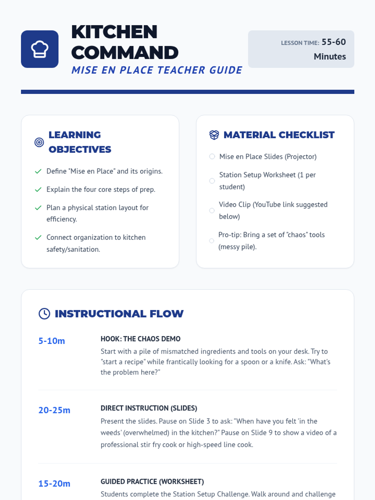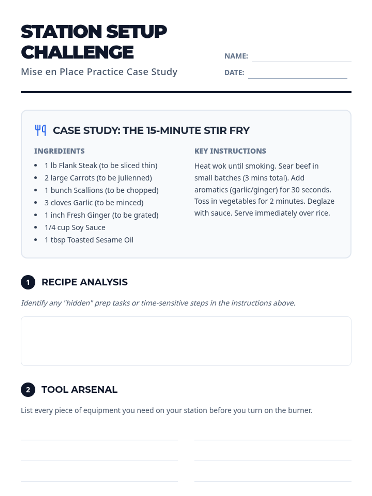 A lesson focused on the professional culinary practice of mise en place, specifically applied to high-heat, fast-paced cooking environments like stir-frying. Students learn to analyze recipes for hidden prep and organize their workspace for maximum efficiency.