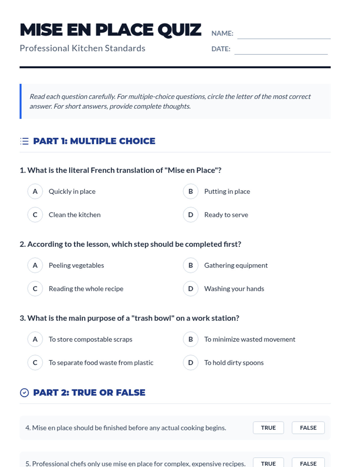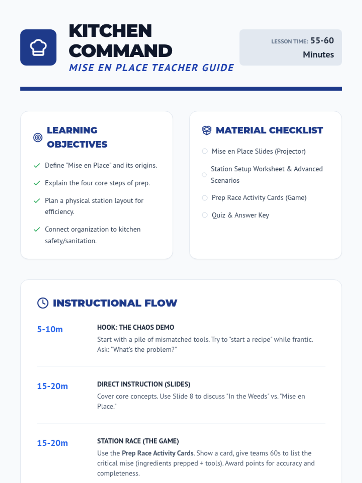 A comprehensive introduction to the essential culinary practice of mise en place, focusing on organization, efficiency, and professional kitchen standards for high school students.