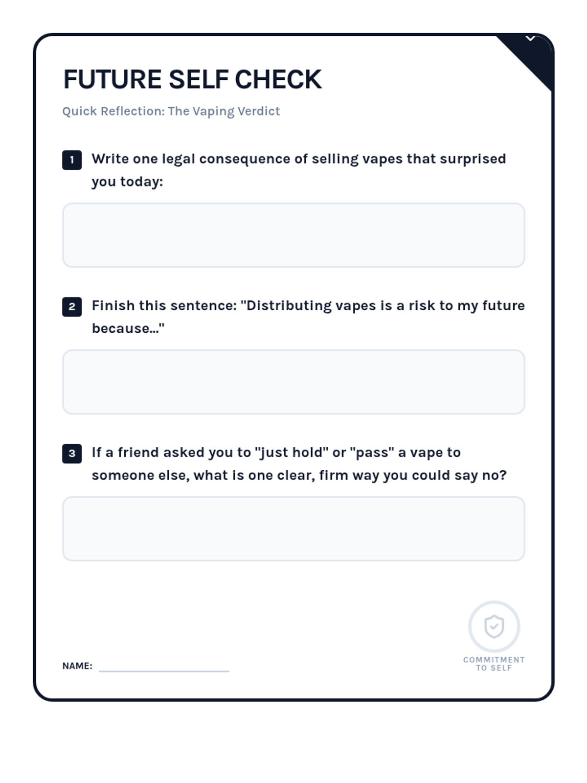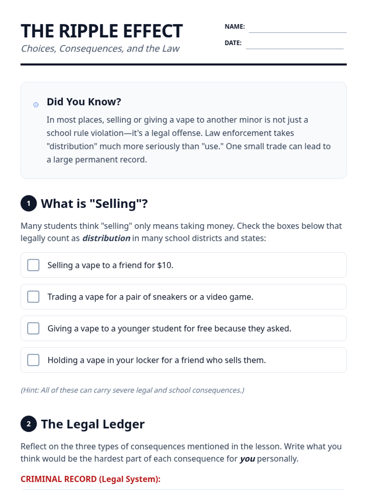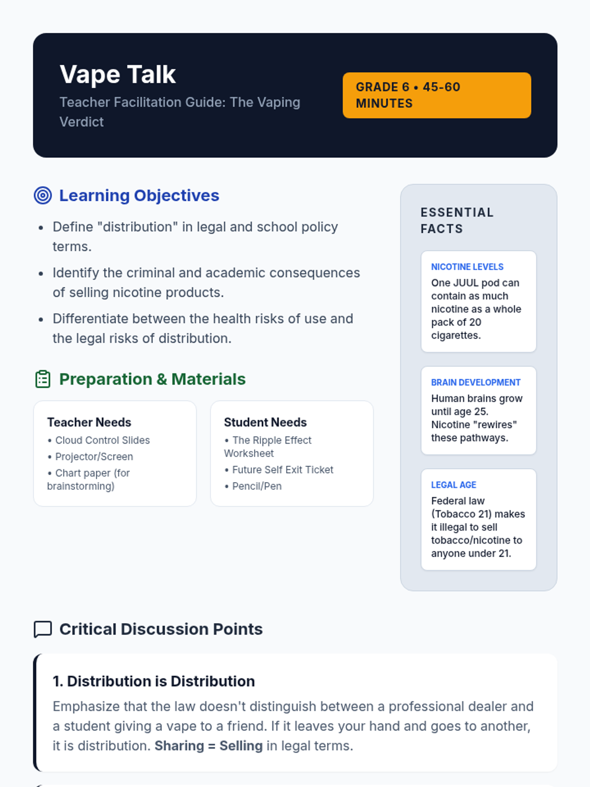 This lesson educates students on the chemical makeup of vapes and focuses heavily on the legal and school-based consequences of selling vapes to others.