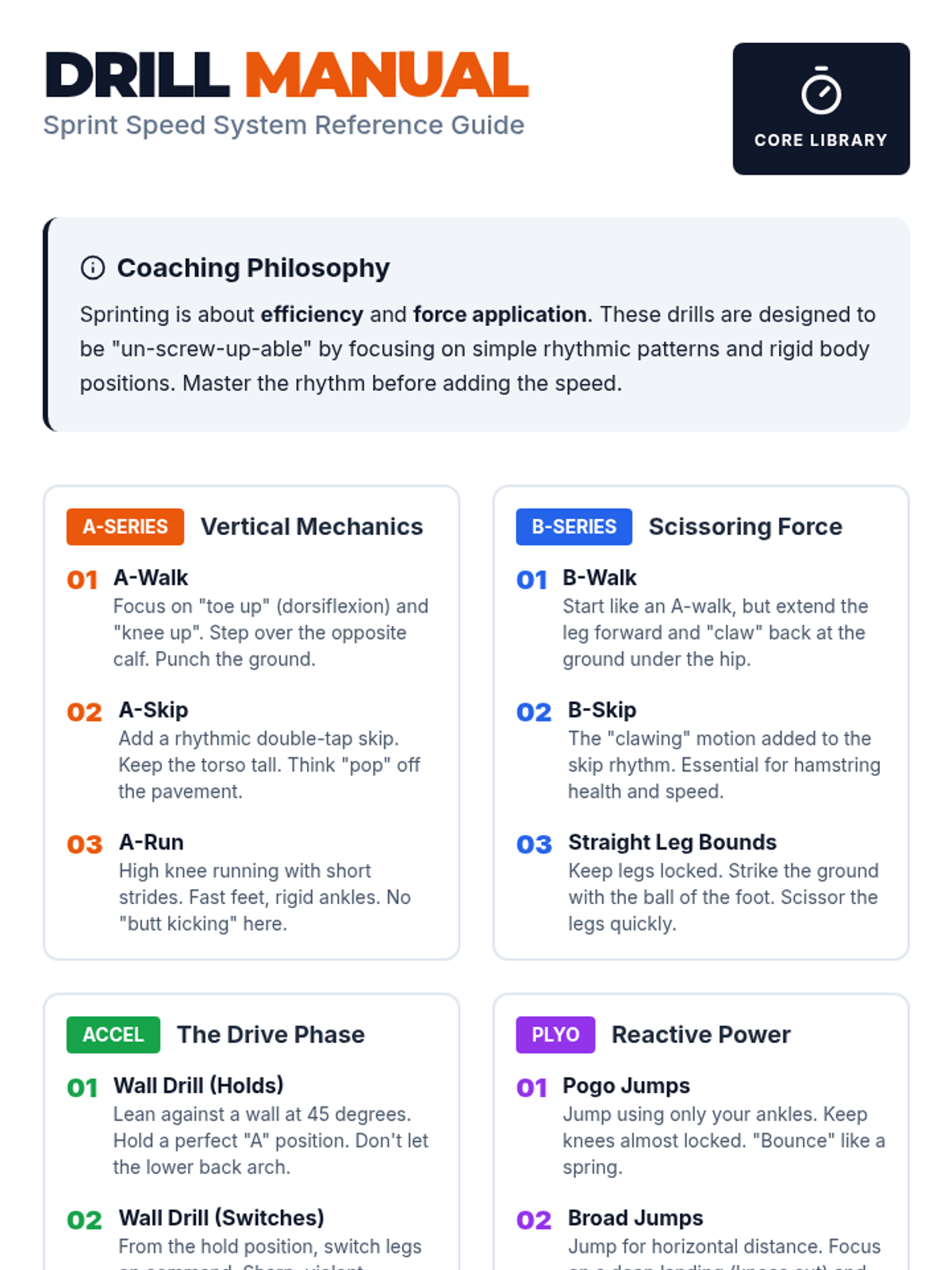 Focus on establishing proper sprint posture, rhythmic drills (A-skips), and basic core strength to prevent injury.