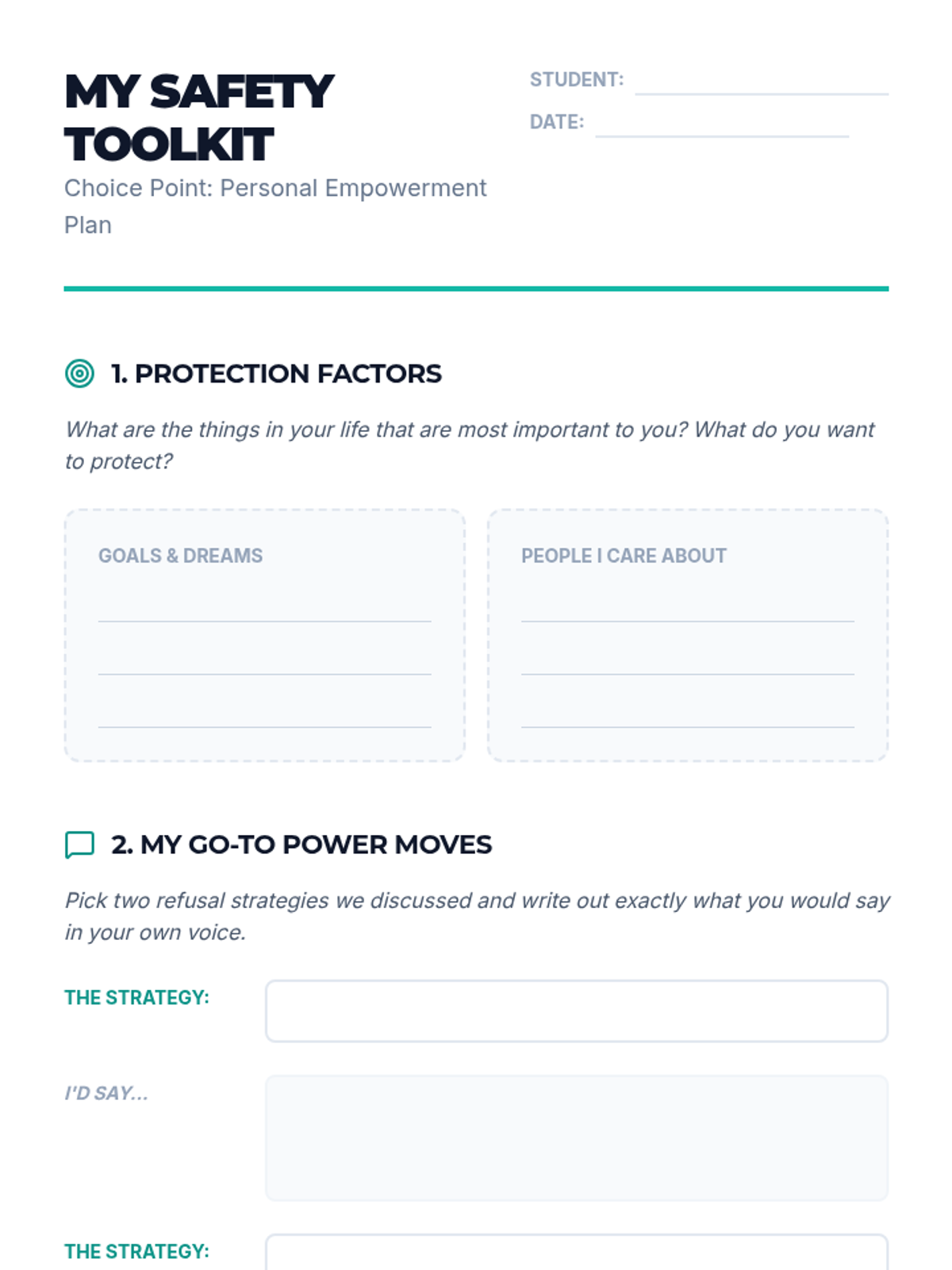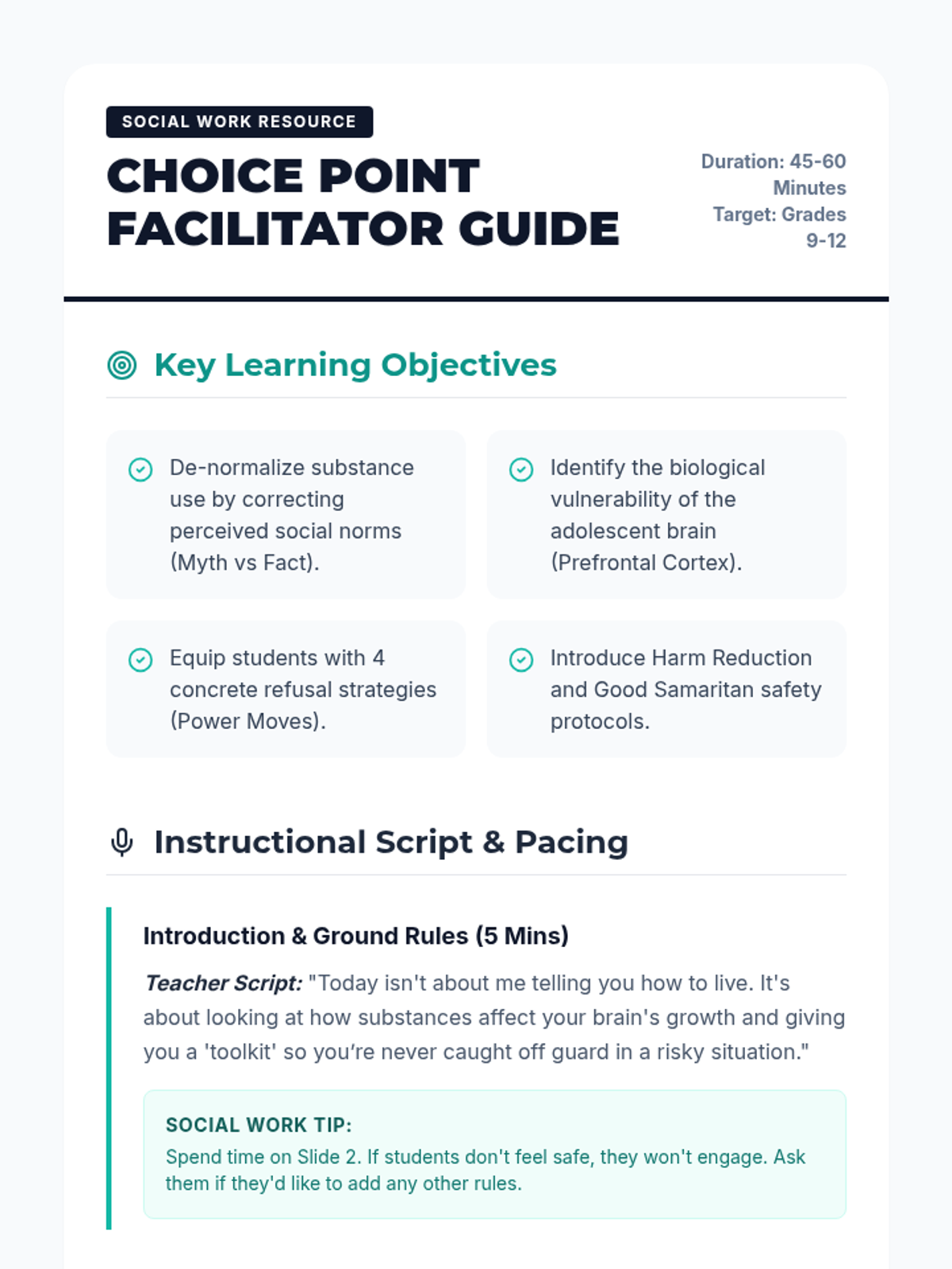 A student-centered, evidence-based lesson on substance use prevention and harm reduction for high schoolers. Focuses on risk factors, refusal skills, and realistic safety strategies using a non-judgmental social work lens.