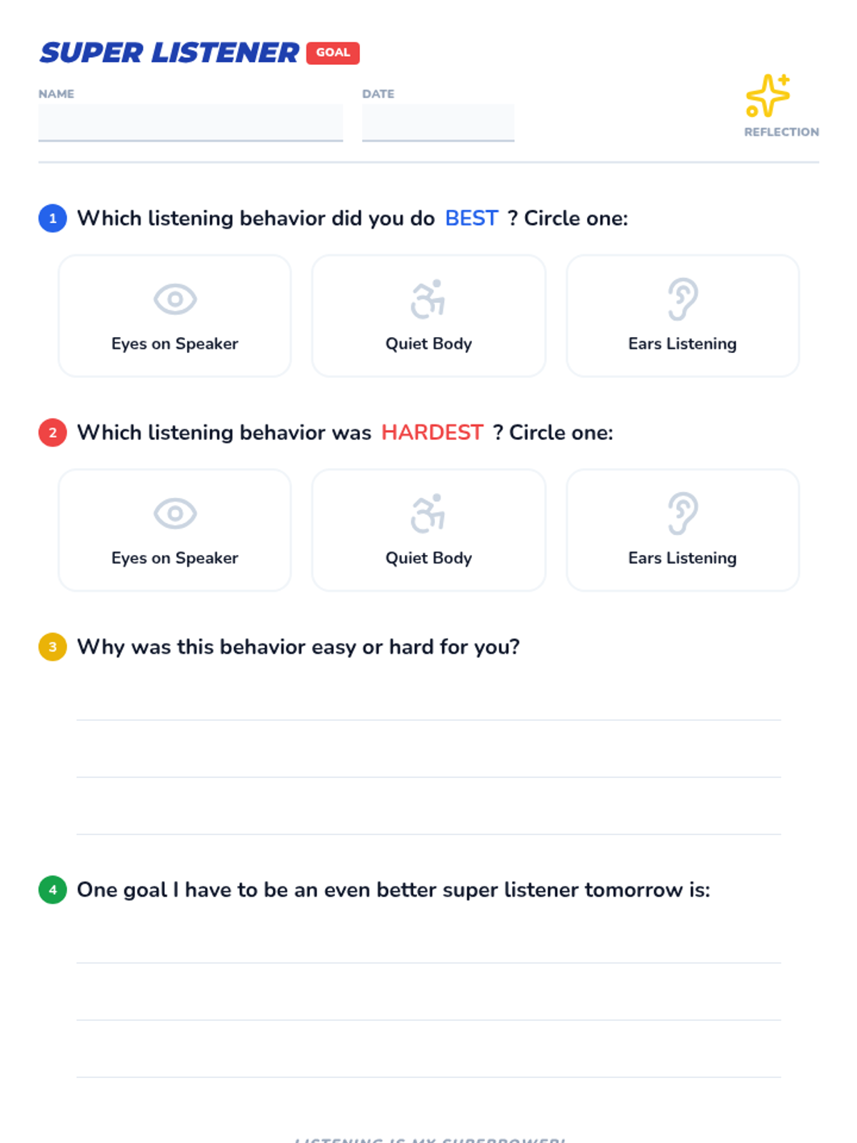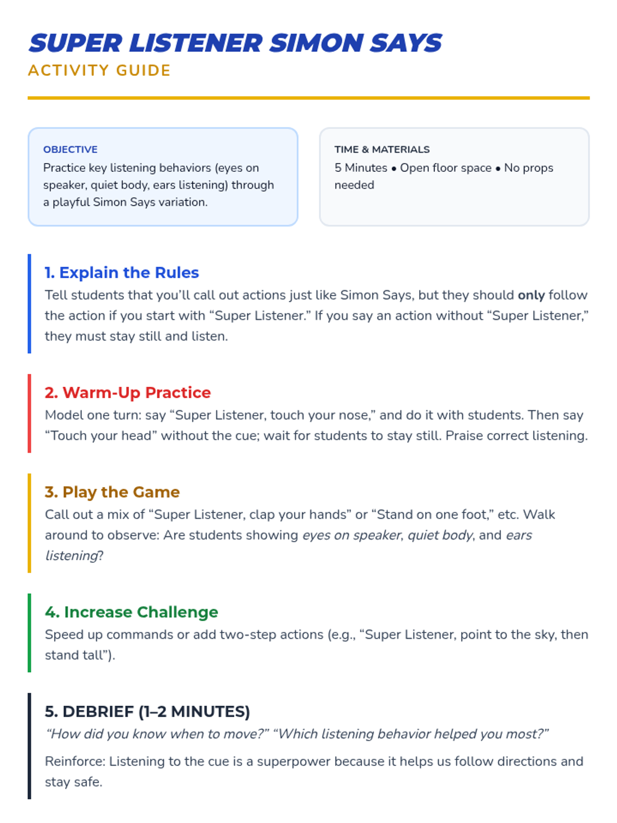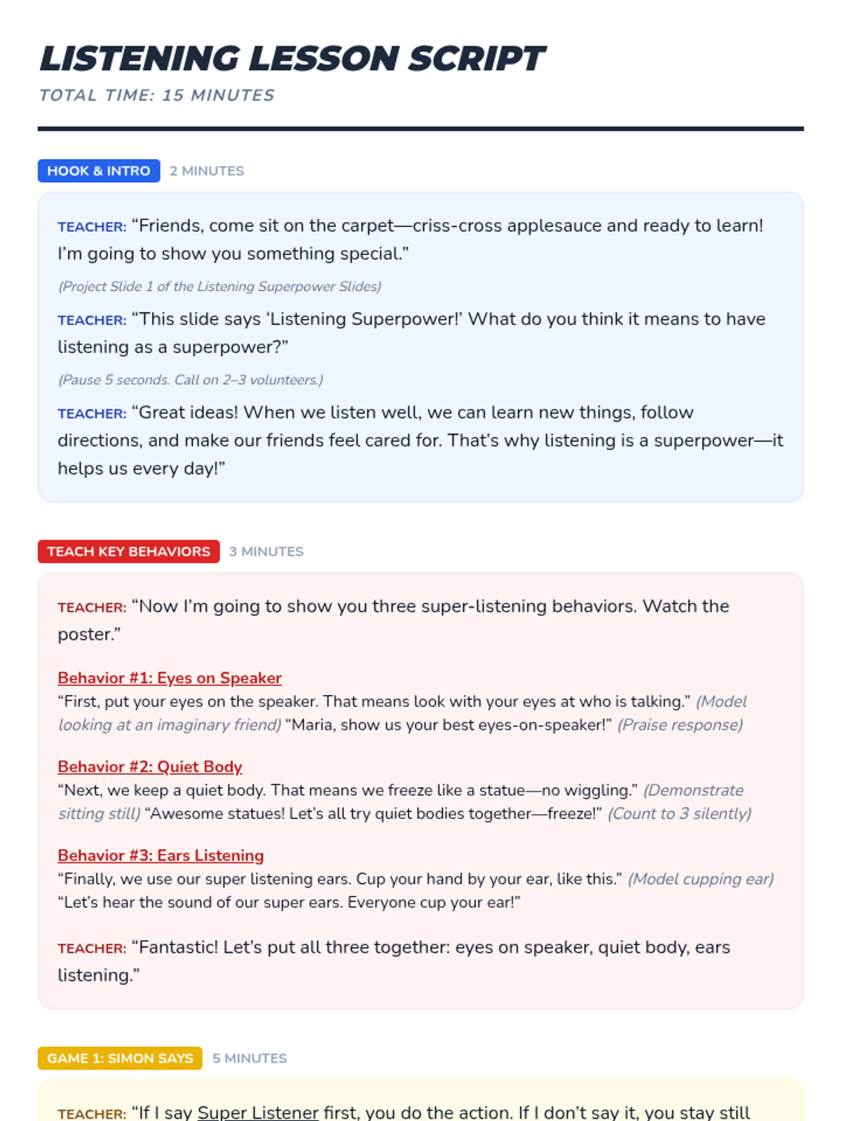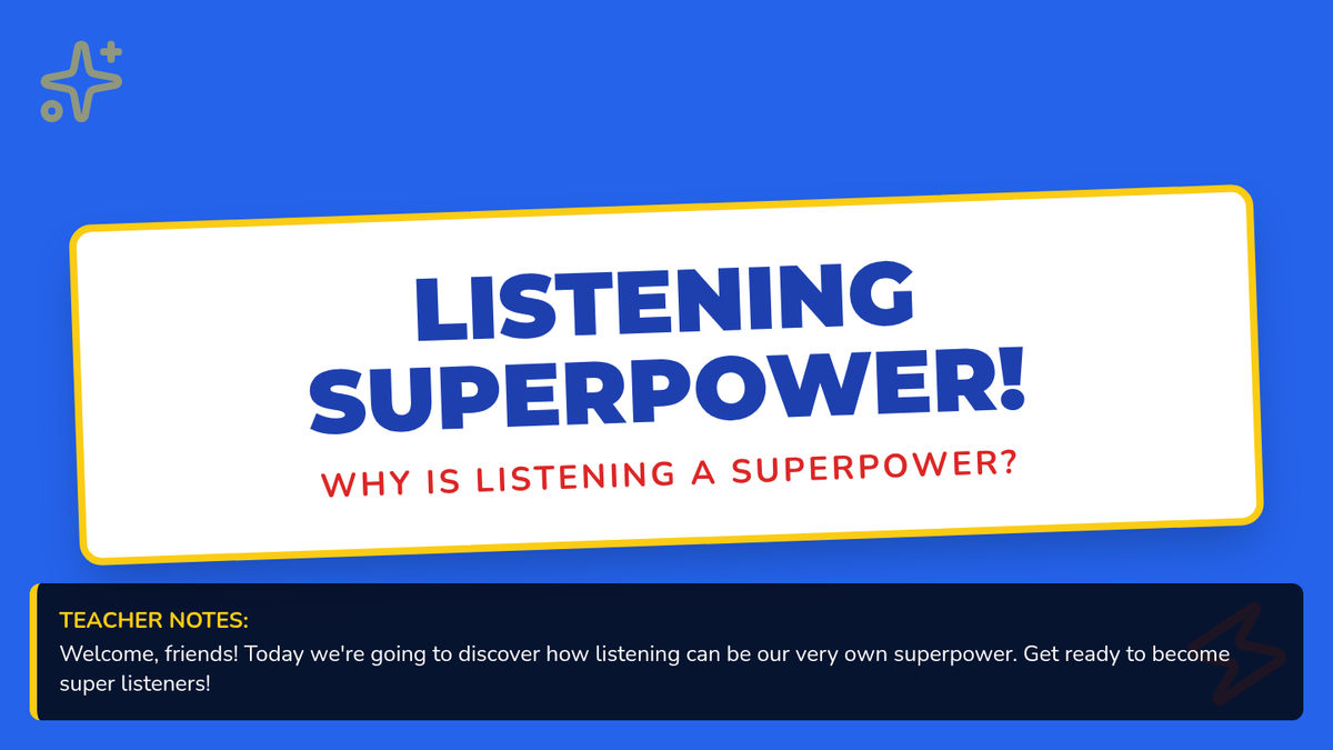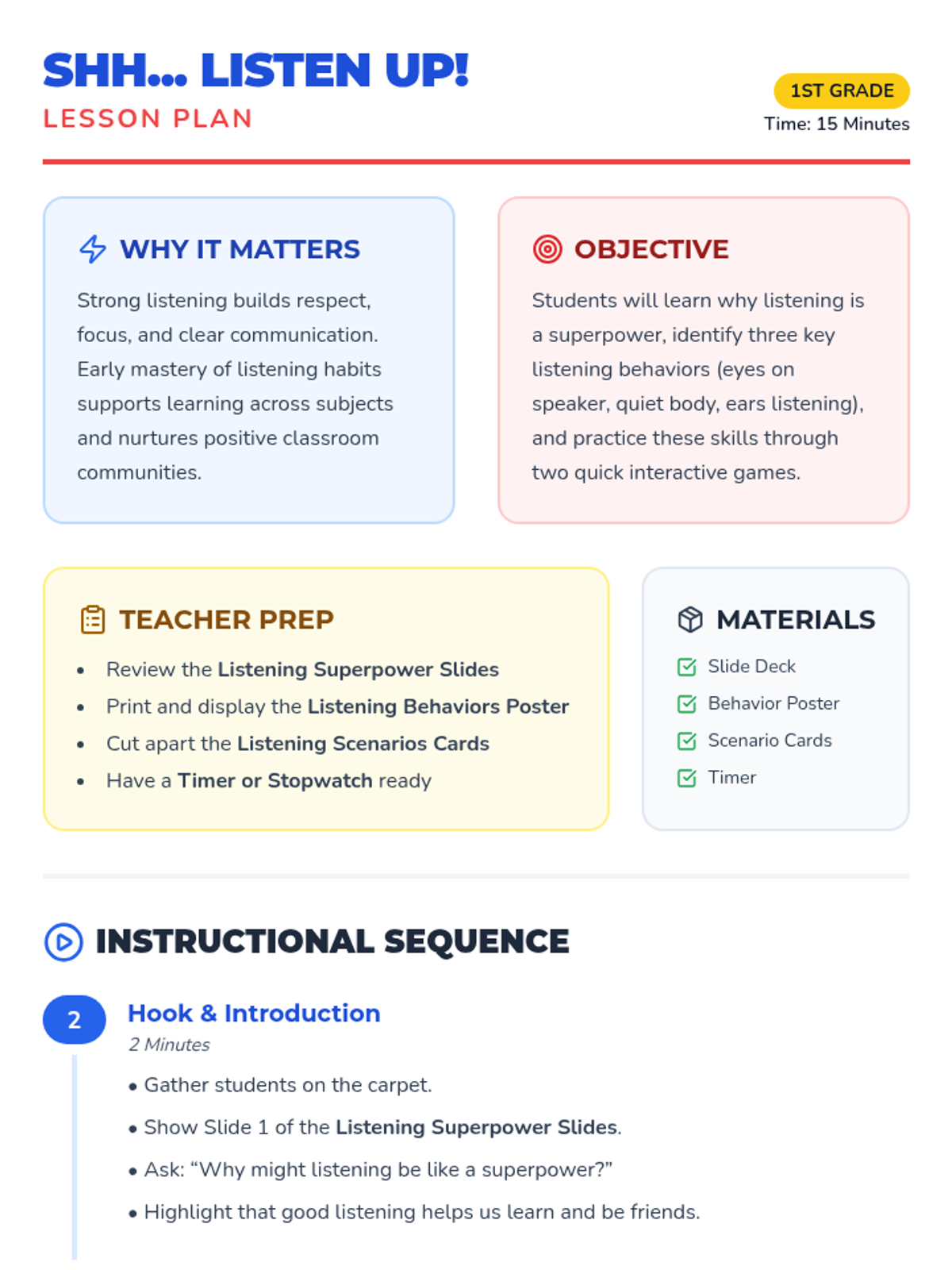 A 15-minute lesson for 1st graders to discover listening as a superpower, featuring interactive games, a behavior poster, and guided reflection to build respect and focus.