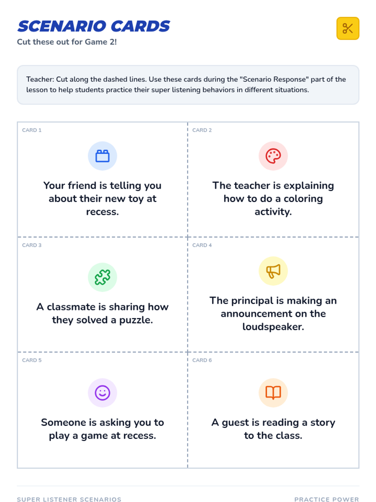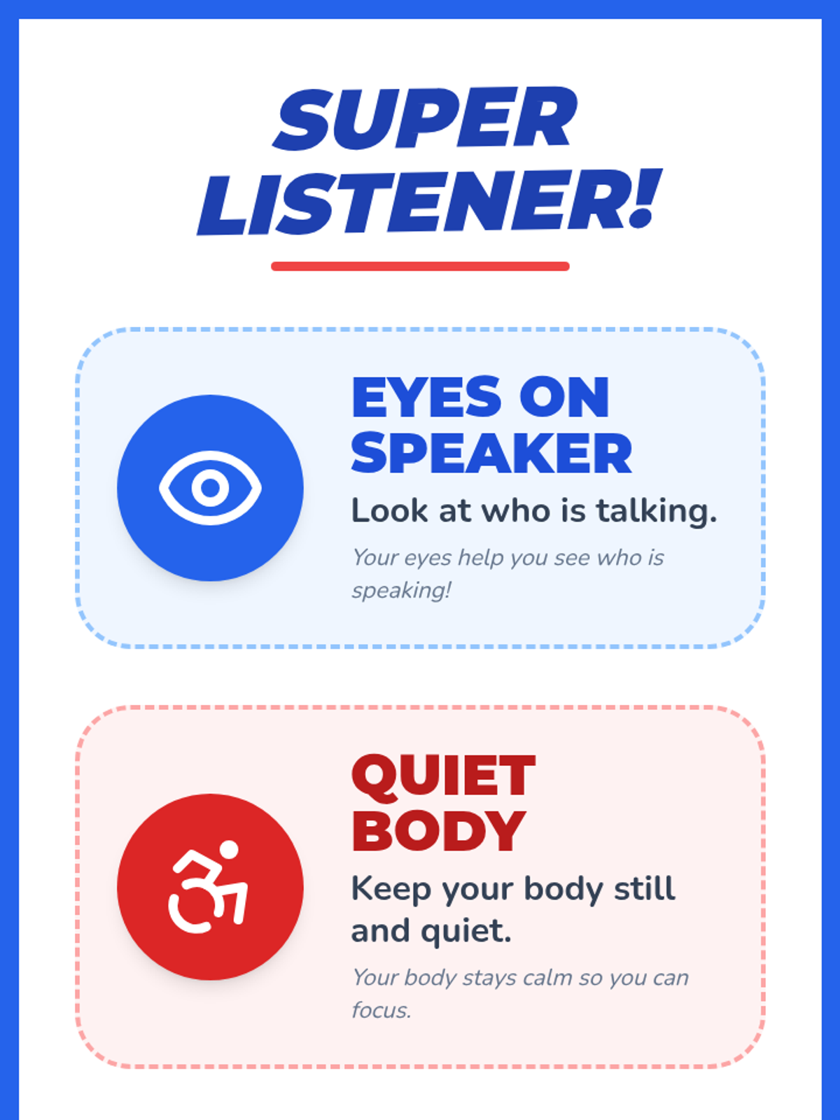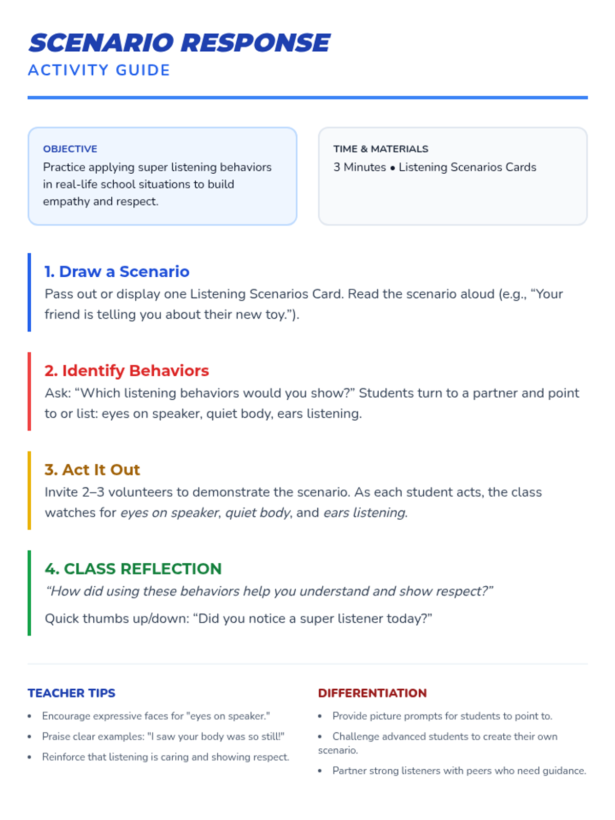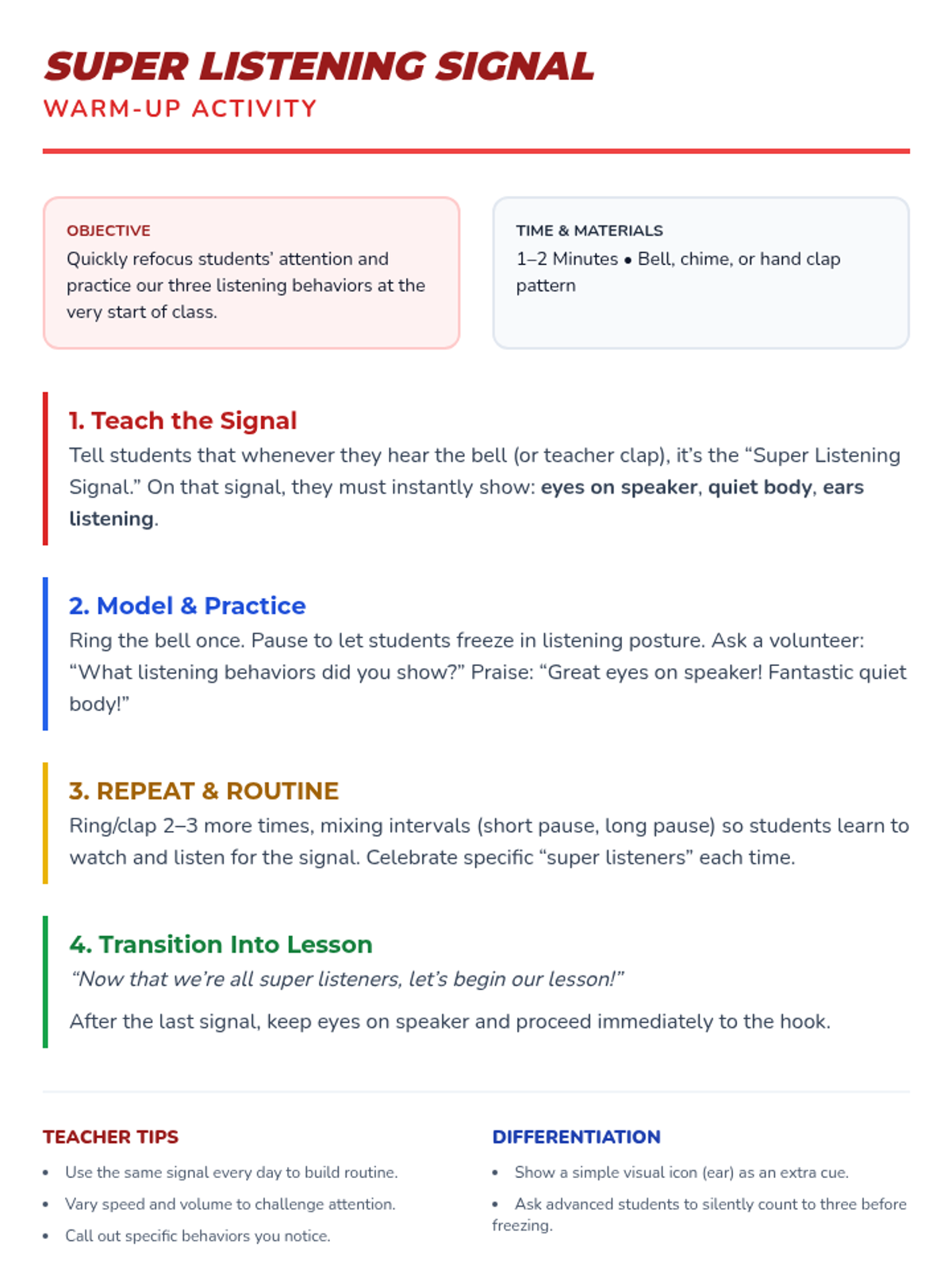 A 15-minute lesson for 1st graders to discover listening as a superpower, featuring interactive games, a behavior poster, and guided reflection to build respect and focus.