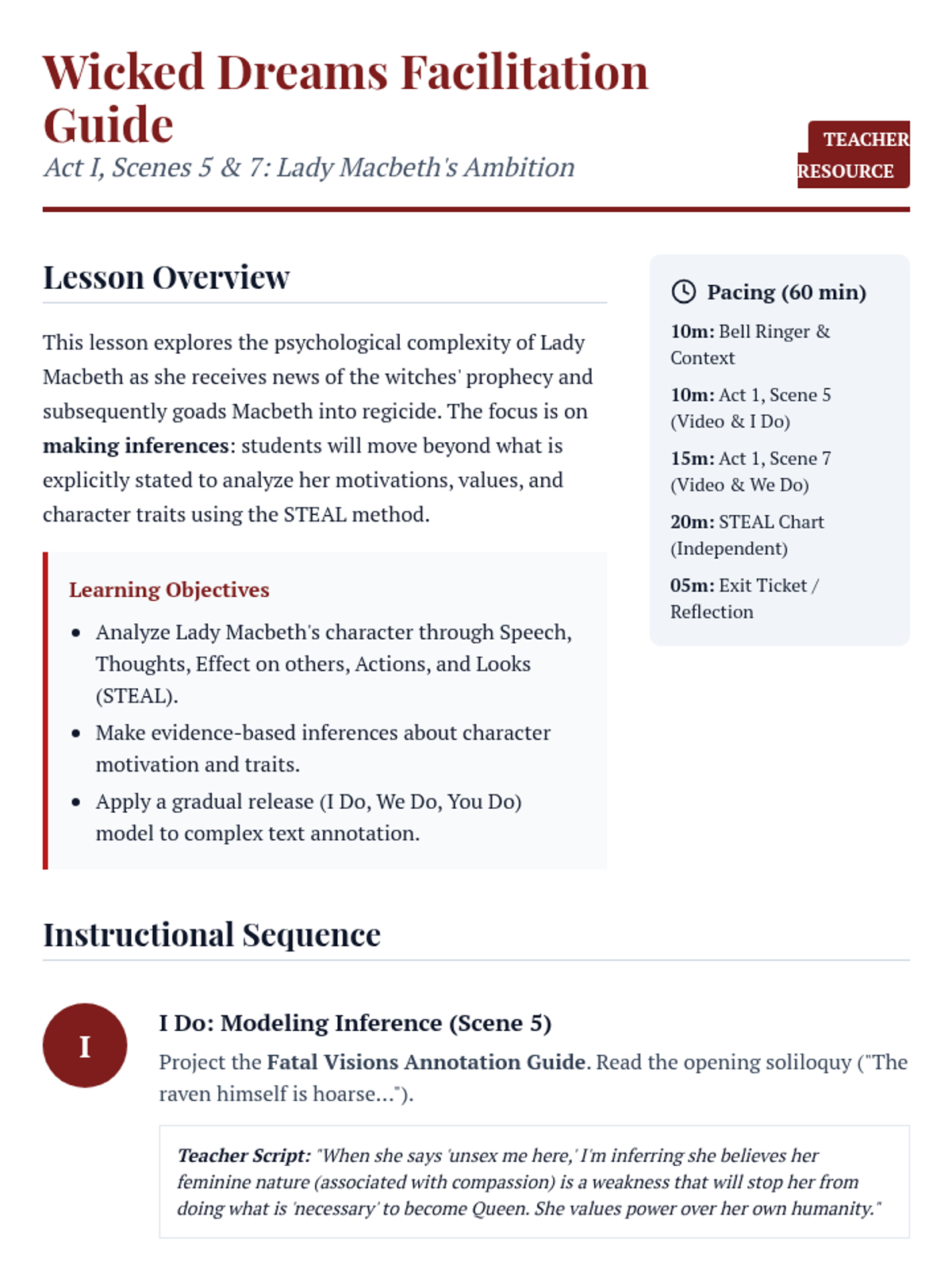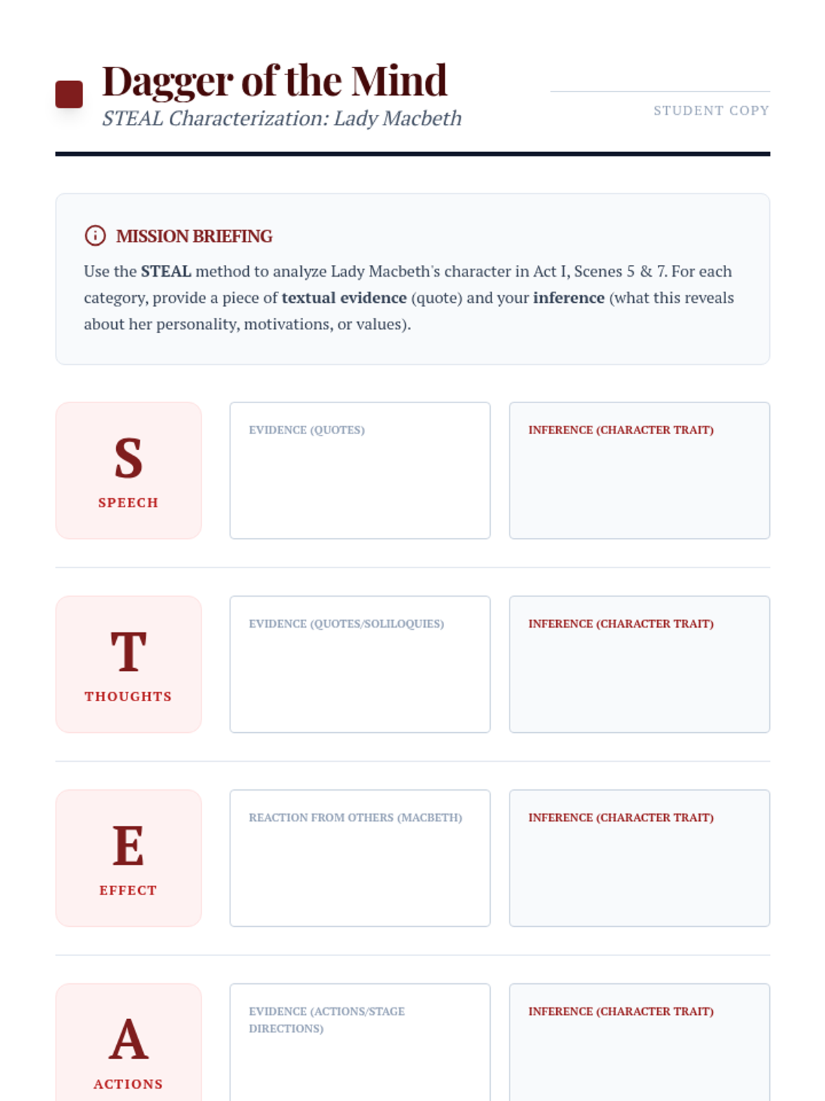 A comprehensive lesson focusing on Lady Macbeth's characterization in Act I, Scenes 5 and 7. Students use a gradual release model to master annotation and making inferences through a STEAL chart.
