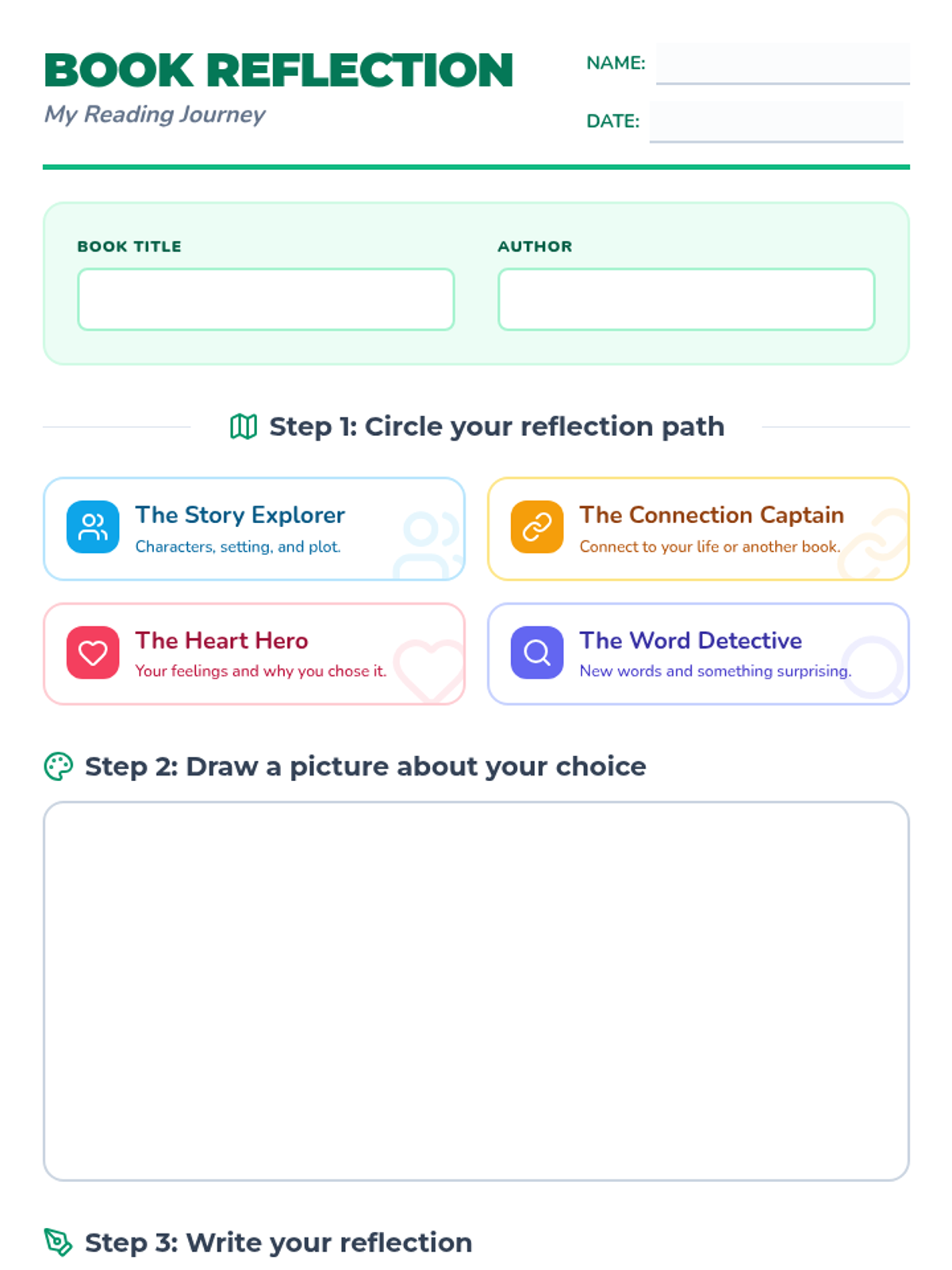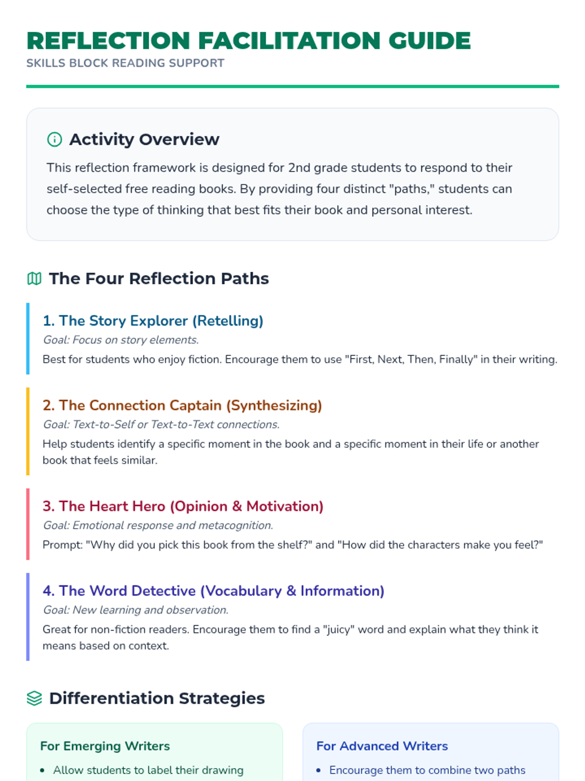 A structured reflection framework for second-grade students to respond to their free reading choices, offering multiple pathways for critical thinking and creative expression.