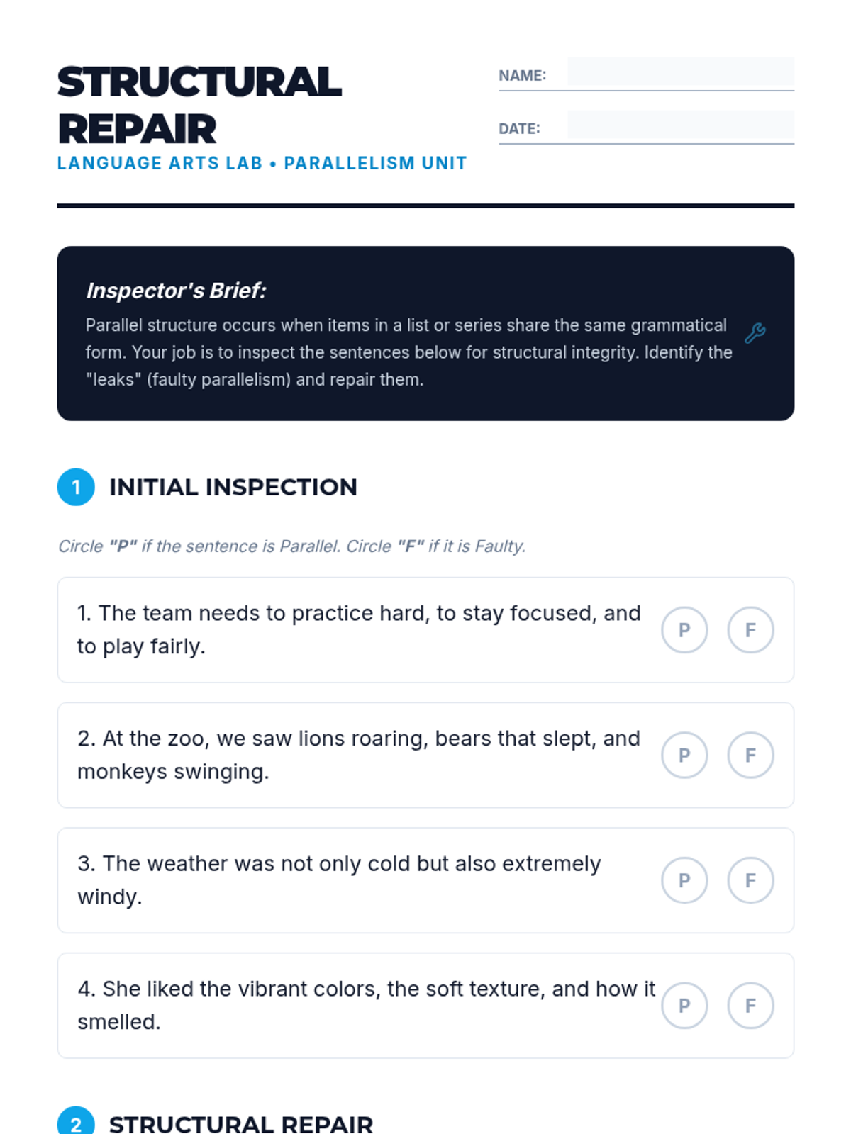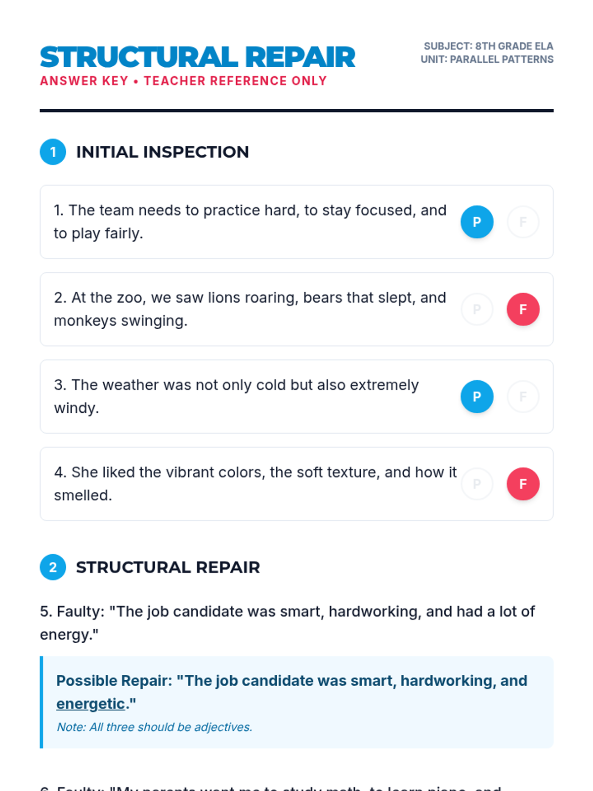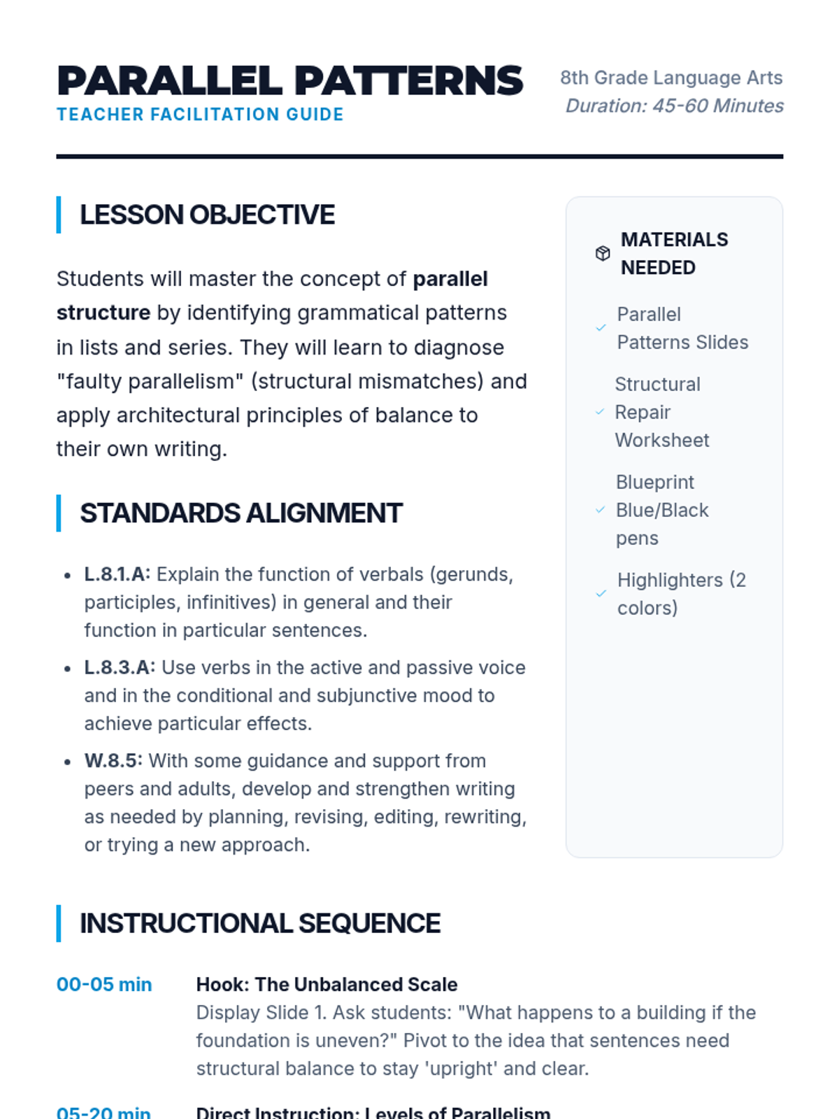 A lesson focusing on identifying and correcting faulty parallelism in sentences, helping students create rhythm and clarity in their writing.