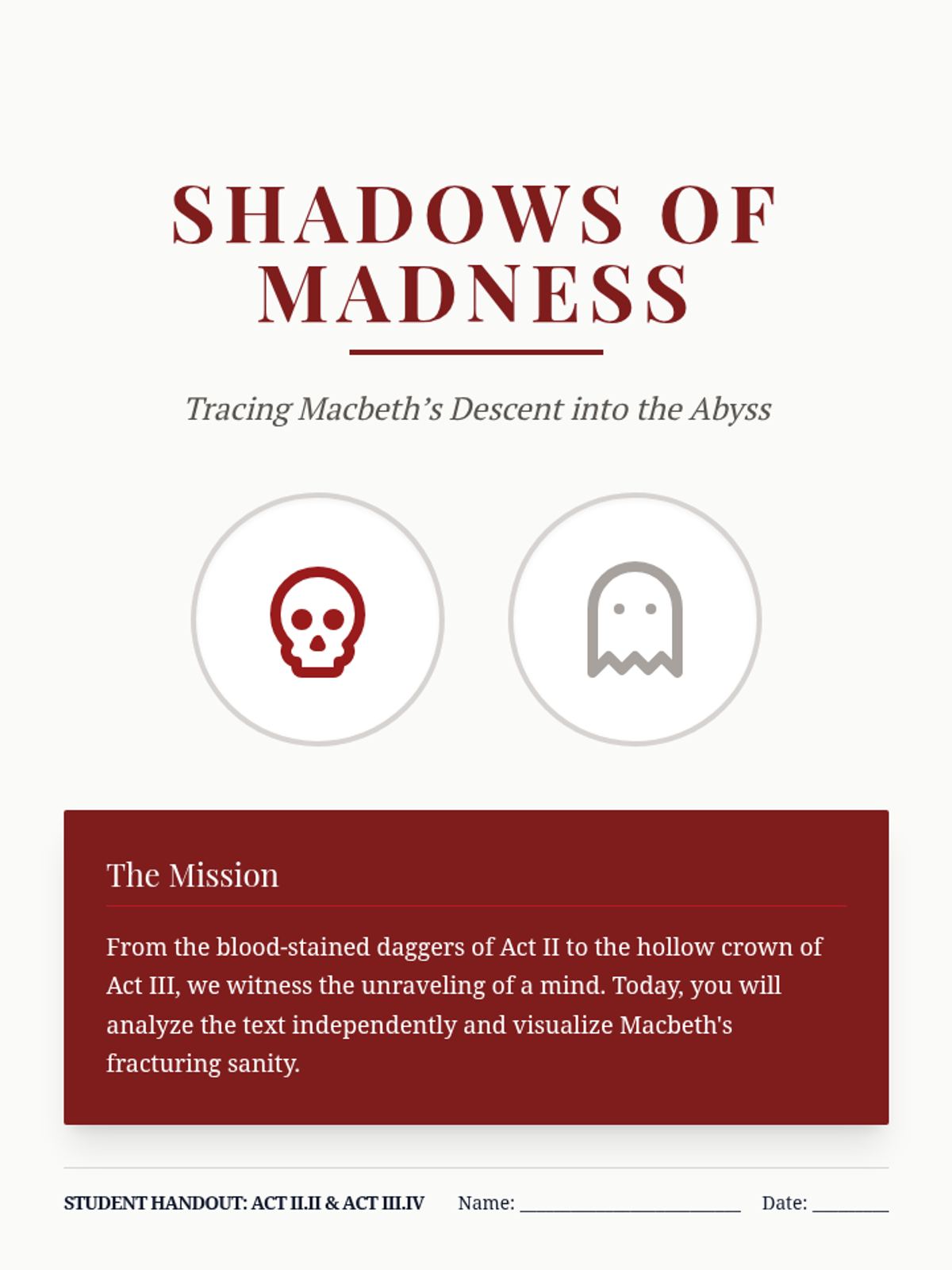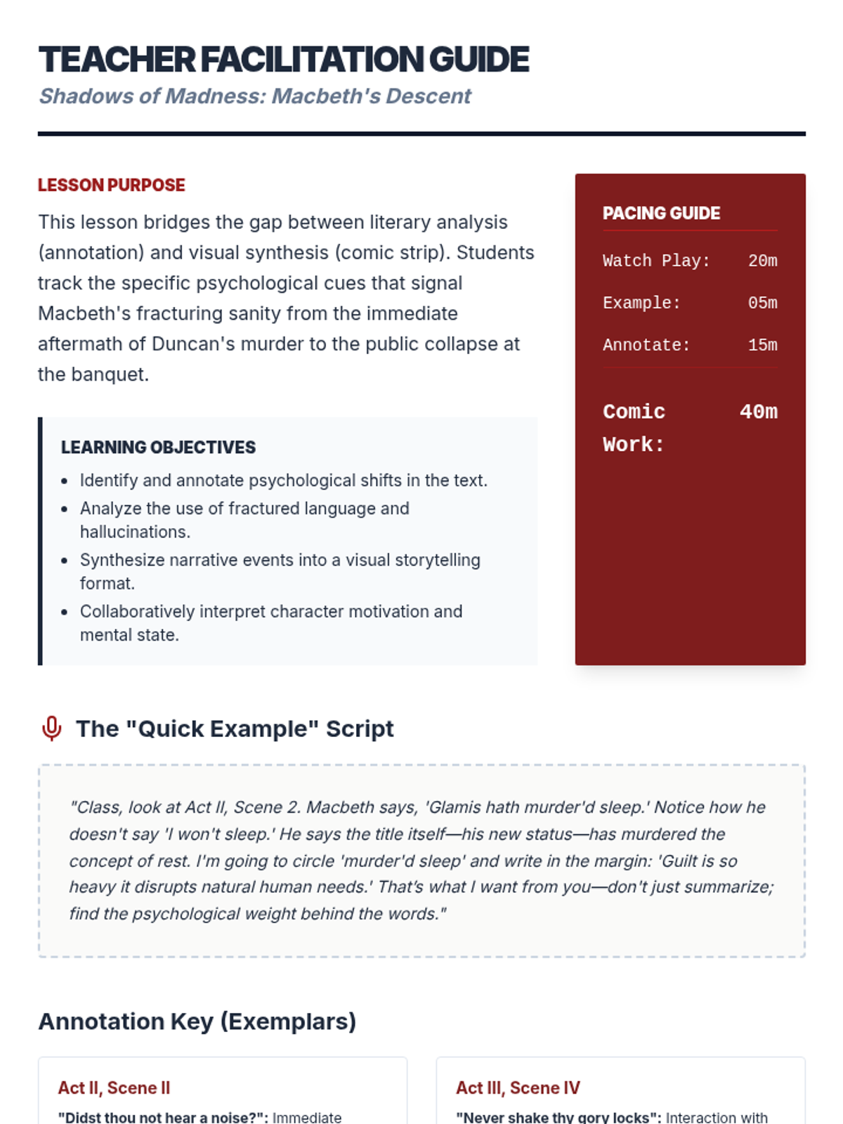Students explore Macbeth's psychological collapse from the murder of Duncan to the haunting banquet. This lesson focuses on independent annotation of key scenes and visual storytelling through a comic strip creation.