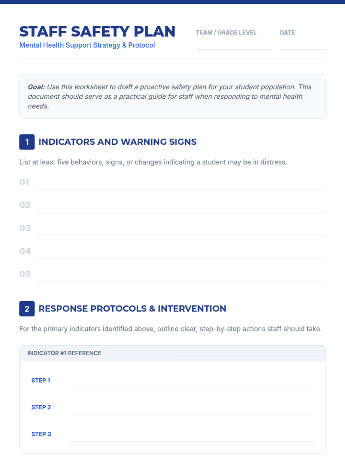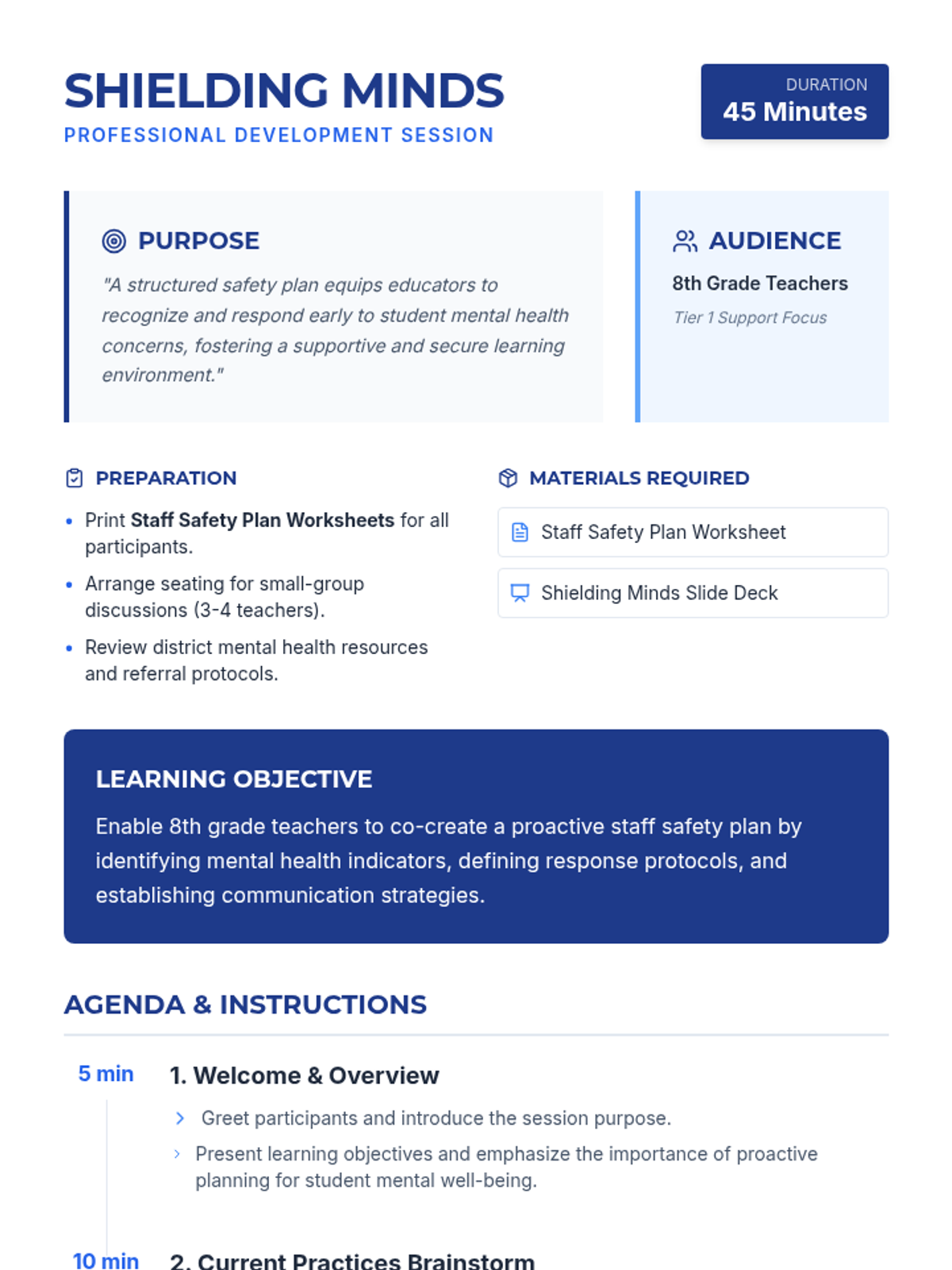 A 45-minute professional development session for 8th-grade teachers to co-create a staff safety plan for addressing student mental health needs. Educators will learn to identify warning signs, define response protocols, and establish clear communication pathways.