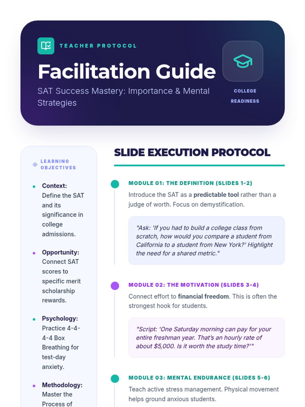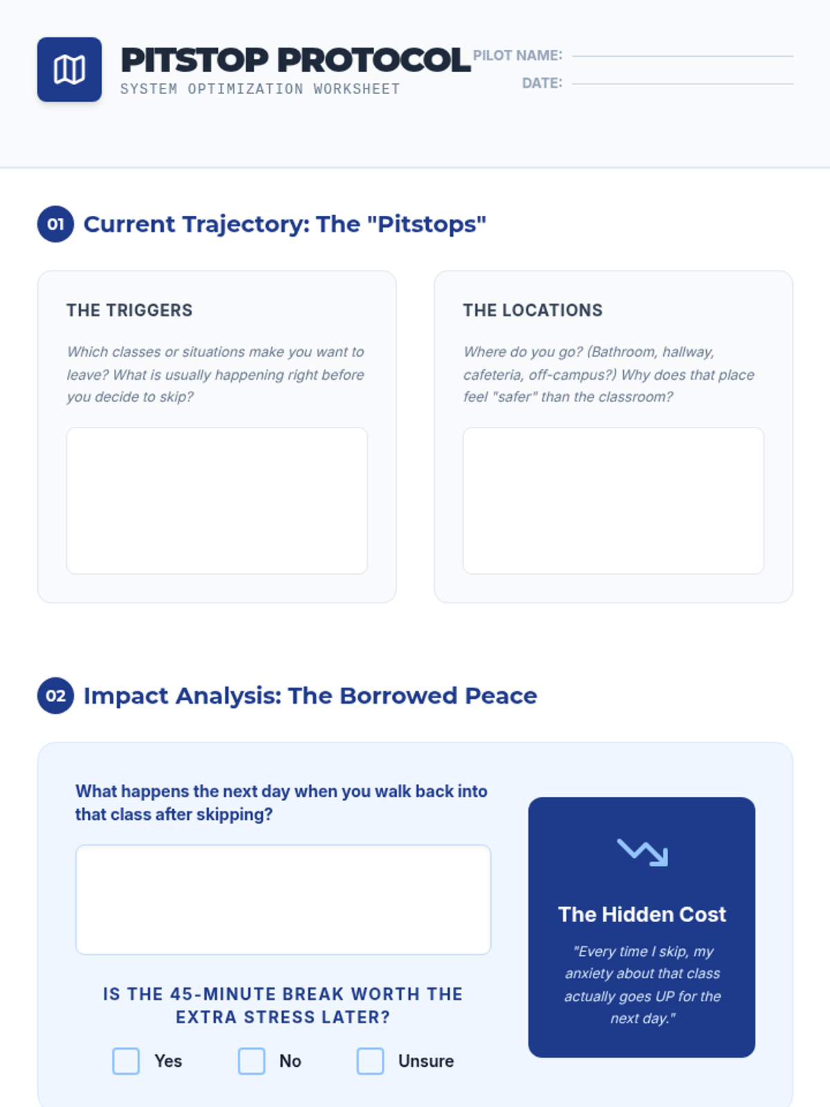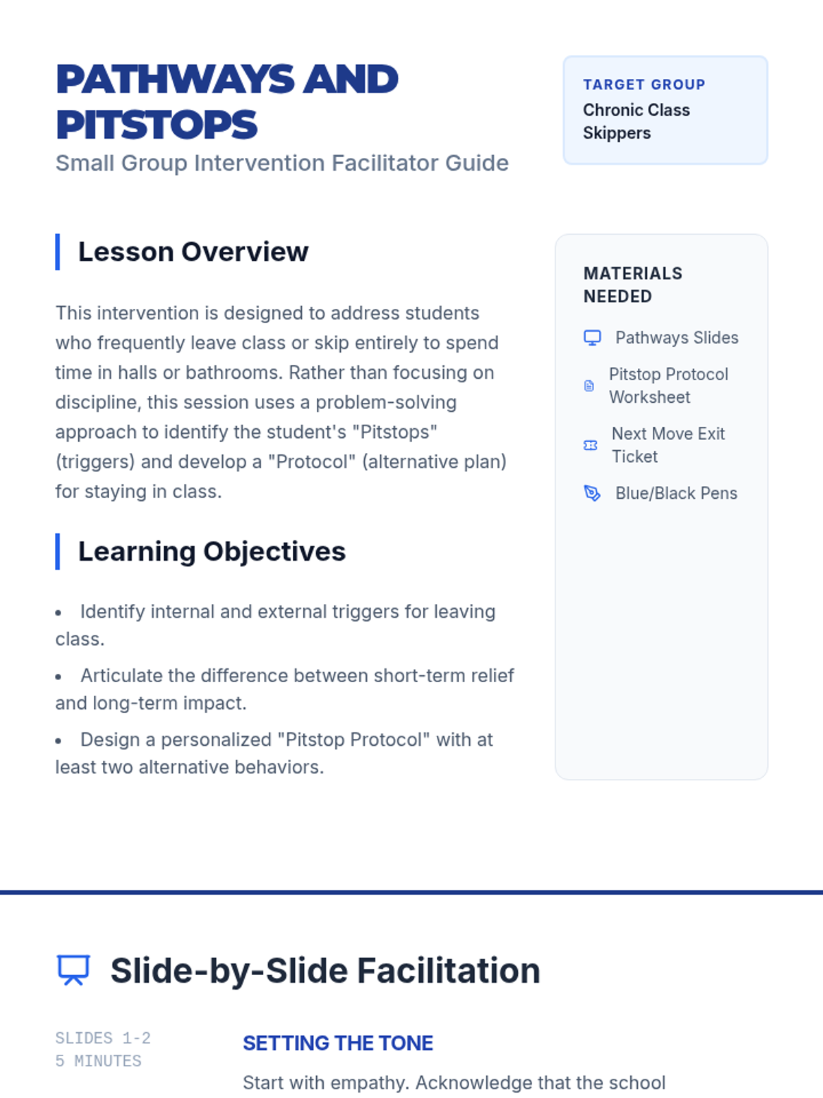 A small group intervention lesson designed to help students identify the root causes of class-skipping behaviors and develop practical, alternative strategies for staying engaged and present.