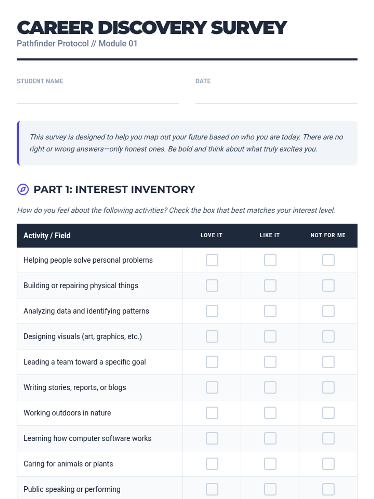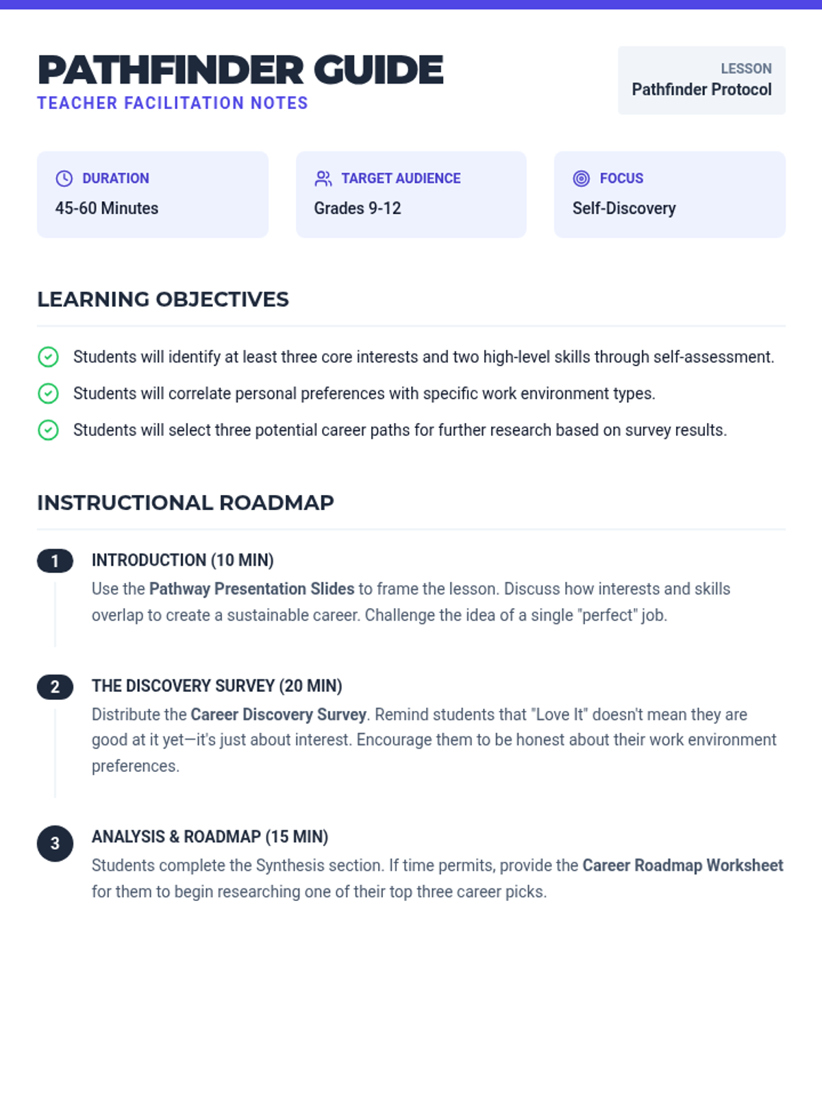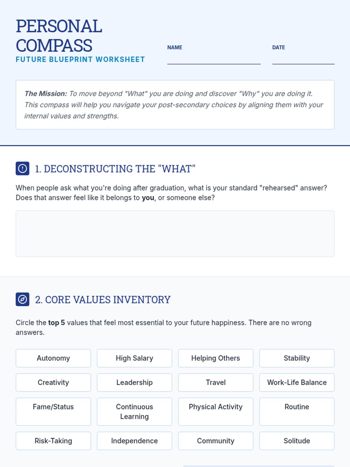 A comprehensive toolkit designed to help 12th-grade students bridge the gap between their personal identity and their professional future through structured self-reflection and career research.