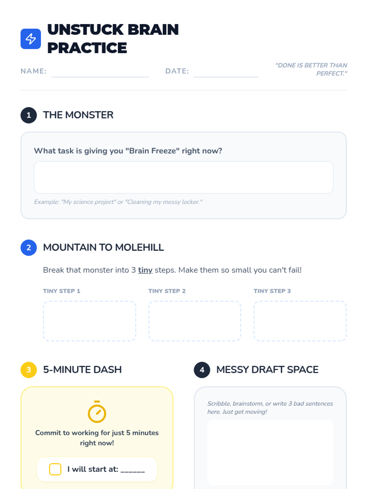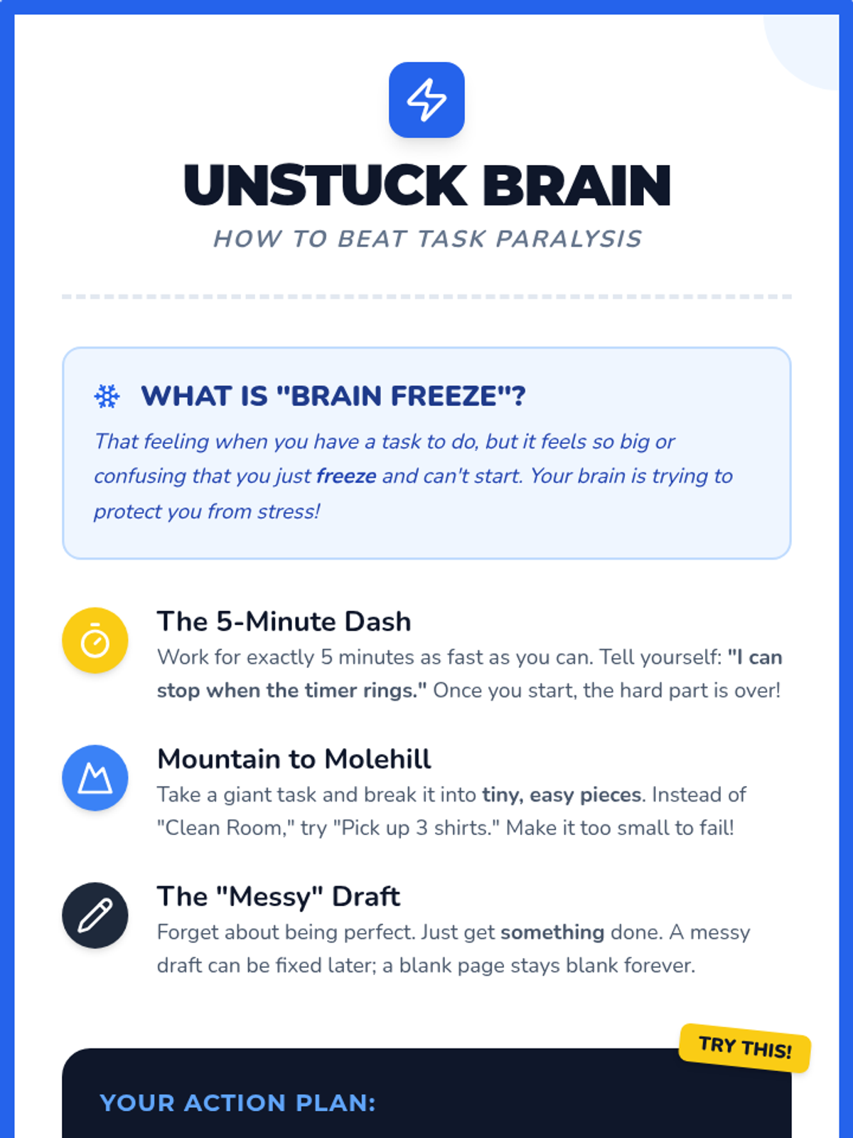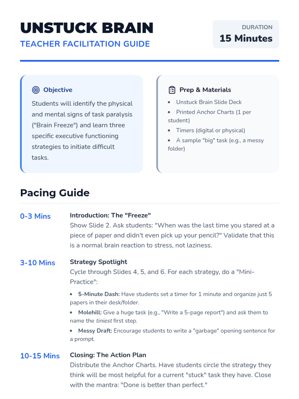 A small group lesson designed to help students identify task paralysis (the "brain freeze") and learn practical strategies to break tasks down and get started. It focuses on reducing overwhelm and moving from avoidance to action in 15 minutes.
